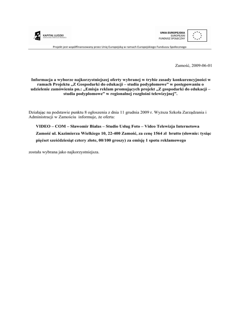 Projekt jest współfinansowany przez Unię Europejską w ramach Europejskiego Funduszu Społecznego Zamość, 2009-06-01 Informacja a wyborze najkorzystniejszej oferty wybranej w trybie zasady konkurencyjności w ramach Projektu ,,Z Gospodarki do edukacji – studia podyplomowe” w postępowaniu o udzielenie zamówienia pn.: „Emisja reklam promujących projekt „Z gospodarki do edukacji – studia podyplomowe” w regionalnej rozgłośni telewizyjnej”. Działając na podstawie punktu 8 ogłoszenia z dnia 11 grudnia 2009 r. Wyższa Szkoła Zarządzania i Administracji w Zamościu informuje, że oferta: VIDEO – COM – Sławomir Białas – Studio Usług Foto – Video Telewizja Internetowa Zamość ul. Kazimierza Wielkiego 10, 22-400 Zamość, za cenę 1564 zł brutto (słownie: tysiąc pięćset sześćdziesiąt cztery złote, 00/100 groszy) za emisję 1 spotu reklamowego została wybrana jako najkorzystniejsza.