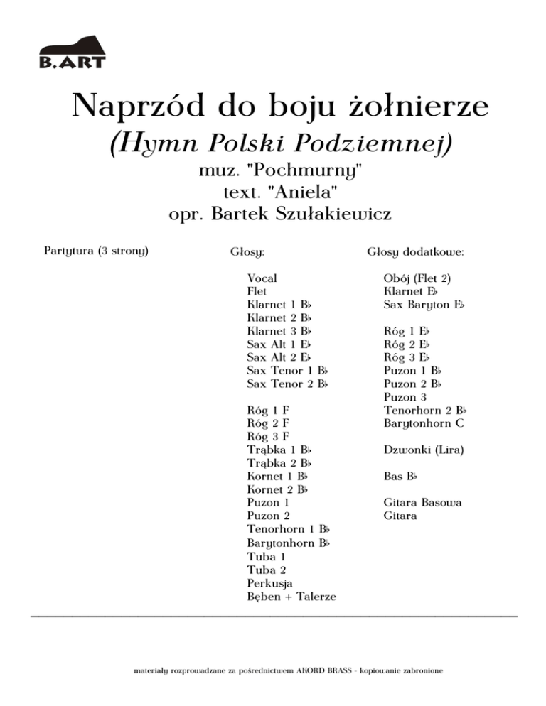 Naprzód do boju żołnierze (Hymn Polski Podziemnej) muz. "Pochmurny" text. "Aniela" opr. Bartek Szułakiewicz Partytura (3 strony) Głosy: Vocal Flet Klarnet 1 B b Klarnet 2 B b Klarnet 3 B b Sax Alt 1 E b Sax Alt 2 E b Sax Tenor 1 B b Sax Tenor 2 B b Róg 1 F Róg 2 F Róg 3 F Trąbka 1 B b Trąbka 2 B b Kornet 1 B b Kornet 2 B b Puzon 1 Puzon 2 Tenorhorn 1 B b Barytonhorn B b Tuba 1 Tuba 2 Perkusja Bęben + Talerze Głosy dodatkowe: Obój (Flet 2) Klarnet E b Sax Baryton E b Róg 1 E b Róg 2 E b Róg 3 E b Puzon 1 B b Puzon 2 B b Puzon 3 Tenorhorn 2 B b Barytonhorn C Dzwonki (Lira) Bas B b Gitara Basowa Gitara ___________________________________________________________ materiały rozprowadzane za pośrednictwem AKORD BRASS - kopiowanie zabronione Naprzód do boju żołnierze Vocal b œ œ œ & b c .. œ œ . œ ˙ Na-przód, do bo - ju, żoł - nie Zo - rza wol - noś - ci się pa Za na - szą Wol-ność i Wa Flet Klarnet 1 B b œ œ œ œ b c .. œ œ . b & œ œ œ œœœ . c . & œ #œ c .. œ œ œ œ 3 Klarnet 2 B b Klarnet 3 B b Sax Alt 1 E b & ˙ 3 c .. œ œ œ œ œ œ œ œ œ # œ œ. œ & c .. 3 & œ œ œ œ œ œ. ˙. rze li szą Pols - ki Pod - ziem-nej! Za Nad Pols - ką i - dą - cych Bra - cia, chwy - taj - my za broń! lat miecz ˙ œ œ œ œ œ œ. ˙ œ œ œ œ œ. œ ˙. ˙ ˙ œ œ œ œ œ. œ ˙. ˙ ˙ œ œ œ œ œ œ. ˙. ˙ œ œ œ œ œ œ. ˙. ˙ ˙ œ œ œ œ œ. œ ˙. œ œ. œ œ œ. œ Œ ˙ Bos - ka po - tę - ga nas strze Moc na - sza prze-moc po - wa Śmierć a - ni trud nas nie stra ˙. ˙ ˙ # c . œ œ. œ œ #œ œ . - ˙ muz. "Pochmurny" text. "Aniela" opr. Bartek Szułakiewicz œ œ. œ œ œ. œ Œ ˙ ˙ - że, li szą ˙ œ œ. œ œ œ #˙ ˙ Œ œ œ. œ œ #œ ˙ ˙ Œ œ œ. œ œ œ ˙ ˙ ˙ ˙ ˙ #˙ Œ Œ œ œ. œ œ œ. œ Œ œ œ. œ œ #œ. œ Sax Alt 2 E b & Sax Tenor 1 B b & œ #œ c .. œ œ . œ ˙ ˙ œ œ œ œ œ ˙. Œ œ œ. œ œ œ ˙ ˙ Sax Tenor 2 B b & c .. œ œ . œ œ œ œ ˙ ˙ œ œ œ œ œ. œ ˙. Œ œ œ. œ œ œ. œ ˙ ˙ & b c .. œ œ œ œ œ œ œ œ œ œ œ œ œ œ œ œ œ œ œ nœ œ œ œ œ Róg 2 F & b c .. œ œ œ œ œ œ œ œ œ œ œ œ œ œ œ œ œ œ œ #œ œ œ œ œ Róg 3 F & b c .. œ œ œ œ œ œ œ œ œ œ œ œ œ œ œ œ œ œ #œ œ œ œ Róg 1 F & œ #œ c .. œ œ œ œ œ œ œ Trąbka 2 B b & c .. œ Kornet 1 B b & c .. œ œ . œ œ œ œ Kornet 2 B b & Trąbka 1 B b Puzon 1 Puzon 2 3 3 œœ œ œ #œ œ ˙ œ œ œ œ œ. œ ˙ ˙ œ œ œ nœ œ. œ ˙ c .. œ œ . œ œ # œ œ œ œ œ œ ? b c .. b ? b c .. œ œ b ˙ œ œ œ œ œ. œ ˙ ˙. Œ œ œ. œ œ œ. œ ˙ ˙ Œ œ œ. œ œ #œ. œ #˙ ˙ ˙ ˙. Œ œ œ. œ œ œ. œ ˙ Œ #˙ ˙ œ œ œ œ œ œ œ œ ˙ œ œ œ œ œ. œ ˙. œ œ œ œ œ œ œ œ œ œ. œ œ #œ. œ œ œ œ nœ œ œ œ œ œ œ œ œ œ œ œ œ œ œ ˙ œ œ œ œ œ œ ˙. œ œ Tenorhorn 1 B b & œ #œ c .. œ œ . œ ˙ ˙ œ œ œ œ œ ˙. Œ œ œ. œ œ œ ˙ ˙ Barytonhorn B b & c .. œ œ . œ œ œ œ ˙ ˙ œ œ œ œ œ. œ ˙. Œ œ œ. œ œ œ. œ ˙ ˙ ? b b c .. œ œ G mi Tuba Perkusja ã c .. œj œœ œj œœ Bęben+ Talerze ã c .. œy œy D7 œ œ œ œ j œ œœ œj œœ œy œy G mi F œ œ œ œ j œ œœ œj œœ œj œœ œj œœ œy œy œy œy œ œ œ œ j œ œœ œj œœ œy œy j œ B b œ œ œ œ œœ œj œœ œ œ œ œ œœ œ œ œœ œ ˙œæ œ œy œy œy œy œy œy C mi œ œ œ œ j œ œœ œj œœ œy œy materiały rozprowadzane za pośrednictwem AKORD BRASS - kopiowanie zabronione C mi6 A7 D œ œ œ œ œ œ œ œ œ œ j œ œœ œj œœ œy œy j œ œœ œj œœ œj œœ œj œœ œy œy œy œy