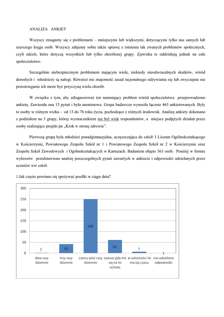 ANALIZA ANKIET Wszyscy zmagamy się z problemami – mniejszymi lub większymi, dotyczącymi tylko nas samych lub szerszego kręgu osób. Wszyscy zdajemy sobie także sprawę z istnienia tak zwanych problemów społecznych, czyli takich, które dotyczą wszystkich lub tylko określonej grupy. Zjawiska te oddziałują jednak na całe społeczeństwo. Szczególnie niebezpiecznym problemem mającym wiele, niekiedy nieodwracalnych skutków, wśród dorosłych i młodzieży są nałogi. Również nie znajomość zasad racjonalnego odżywiania się lub zwyczajnie nie przestrzeganie ich może być przyczyną wielu chorób. W związku z tym, aby zdiagnozować ten narastający problem wśród społeczeństwa przeprowadzono ankietę. Zawierała ona 15 pytań i była anonimowa. Grupa badawcza wynosiła łącznie 465 ankietowanych. Były to osoby w różnym wieku - od 13 do 76 roku życia, pochodzące z różnych środowisk. Analizę ankiety dokonano z podziałem na 3 grupy, której wyznacznikiem nie był wiek respondentów, a miejsce podjętych działań przez osoby realizujące projekt pn „Krok w stronę zdrowia”. Pierwszą grupą była młodzież ponadgimnazjalna, uczęszczająca do szkół: I Liceum Ogólnokształcącego w Kościerzynie, Powiatowego Zespołu Szkół nr 1 i Powiatowego Zespołu Szkół nr 2 w Kościerzynie oraz Zespołu Szkół Zawodowych i Ogólnokształcących w Kartuzach. Badaniem objęto 363 osób. Poniżej w formie wykresów przedstawiono analizę poszczególnych pytań zawartych w ankiecie i odpowiedzi udzielanych przez uczniów ww szkół. 1.Jak często powinno się spożywać posiłki w ciągu dnia? 2.Ostatni posiłek zaleca się spożywać: 3.Najważniejszą rolą odżywiania się jest: Udzielono więcej niż jedną odpowiedź 4.Czy prawidłowo jest odżywiać się produktami typu fast-food? 5.Co sprzyja tyciu? 6. Czy chętnie uczęszczasz na zajęcia wychowania fizycznego? 7.Czy uprawiasz jakikolwiek sport? Jeśli ta to jaki? Udzielono więcej niż jedną odpowiedź 8.Czy po spotkaniu zwiększyła się Twoja wiedza na temat uzależnień od ? : 9.Czy po spotkaniu zwiększyła się twoja wiedza na temat zachorowań na raka płuc poprzez stosowanie używek? 10.Czy paliłeś/łaś kiedykolwiek papierosy? 11.Czy piłeś/łaś już napoje alkoholowe? 12.Picie alkoholu według Ciebie: Osoby ankietowane na to pytanie udzielili więcej niż jedną odpowiedź (ankieta nie wykluczała takiej możliwości). 13.Jak często korzystasz z Internetu? 14.Ile godzin dziennie spędzasz w Internecie? 15.Czy uważasz , że możesz całkowicie zapanować na sytuacją dotyczącą uzależnień? Metryczka Płeć: Żukowo Staniszewo Nowe Czaple Ostrzyce Babi - Dół Szopa Chmielno Sierakowice Przyjaźń Kolonia 3 Borcz 5 7 6 423 2 33121 23121411 32 5 3 5 4 2 5 1 1 1 1 1 Kartuzy Kamienica Szlachecka Wejherowo Krzeszna Trzebuń Korne Stawiska Kłobuczyno Lipy Gołubie Klukowa Huta Orle Foshuta Kalisz 0 Nowa Karczma 2 Nowe Polaszki 9 Mały Klincz 7 Łubiana 20 Lipusz Kościerzyna Wiek: Miejscowość: 140 129 120 100 80 60 57 40 21 16 3 3 121111211111112 1111 Jak można było przypuszczać większość osób zna zasad poprawnego odżywania. Uczniowie w ankiecie prawidłowo zaznaczają liczbę posiłków jaką należy spożywać w ciągu dnia. Ponad połowa, bo aż 68 % ankietowanych wskazuje liczbę 4-5 posiłków dziennie, uwzględniając że ostatni należy spożyć nie później niż 2 godziny przed snem (329 osoby). Są świadomi że głównym celem konsumpcji posiłków jest dostarczanie organizmowi niezbędnych składników pokarmowych, spożywanie produktów typu fast - food jest niezdrowe (wg 87 % ankietowanych), a przyjmowanie słodyczy i nadmiernej ilości tłuszczów powodują nadwagę, a w konsekwencji otyłość. Takie spostrzeżenia posiada 93 % respondentów. Nasuwa się jednak pytanie czy za ich wiedzą idzie praktyka? Niestety wyniki ankiet jednoznacznie określają, że większość młodzieży spróbowało już którejkolwiek z używek. Papierosy paliło 59 % ankietowanych, po alkohol sięgnęło aż 81% osób. Głównymi powodami może być brak akceptacji w grupie rówieśniczej, ciekawość "dorosłości" lub inny czynnik psychologiczny może skłaniać nastolatków do zainteresowania używkami (alkohol, narkotyki, papierosy). Nie jest to jednak jedyną przyczyną szerszego problemu, jakim są uzależnienia. Przyczyną może być także nuda. Aż 38% respondentów nie uprawia żadnego sportu poza uczęszczaniem na zajęcia wychowania fizycznego (140 badanych ). Brak alternatywnego zajęcia czyli pomysłu sposobu spędzania wolnego czasu, innego niż siedzenie w samotności, może być przyczyną sięgania po używki. Stałe, w miarę regularne spożywanie alkoholu, palenie papierosów czy przyjmowanie narkotyków wg ankietowanych ma związek z poprawą humoru (38 % ). Postępują tak mimo, iż mają świadomość że prowadzi to do uzależnień (twierdzi tak 50 % badanych). W dobie rozwoju cywilizacji Internet stanowi równie poważny problem jak nałogi. Internet wypełnia czas młodzieży, aż 68 % Internetem 4 godziny. korzysta z niego codziennie, z czego 82 % spędza przed W pespektywie przyszłości takie postępowanie może być przyczyną wielu chorób: układu narządów ruchu, wad wzroku czy chorób układu krążenia itp. W związku z tym, w ramach projektu przygotowano szereg działań, które miały uświadomić tym młodym ludziom o konsekwencjach zdrowotnych i psychicznych takiego irracjonalnego postępowania. Dzięki pracy wielu ludzi zwiększyła się wiedza młodzieży na temat skutków palenia papierosów ( u 61% ankietowanych), picia alkoholu (63 %), czy sięgania po narkotyki (również u 63 % respondentów ). Przybliżono wiedzę na temat zwiększonego prawdopodobieństwa odnośnie chorób nowotworowych, zwłaszcza u osób znajdujących się w kręgu ryzyka, jak również u tych którzy prowadzą nieprawidłowy tryb życia. Dzięki prelekcji prowadzonej 