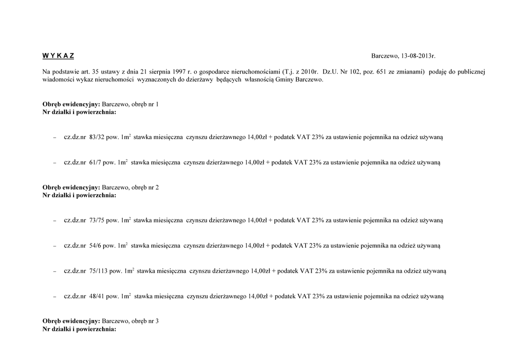 WYKAZ Barczewo, 13-08-2013r. Na podstawie art. 35 ustawy z dnia 21 sierpnia 1997 r. o gospodarce nieruchomościami (T.j. z 2010r. Dz.U. Nr 102, poz. 651 ze zmianami) podaję do publicznej wiadomości wykaz nieruchomości wyznaczonych do dzierżawy będących własnością Gminy Barczewo. Obręb ewidencyjny: Barczewo, obręb nr 1 Nr działki i powierzchnia: − cz.dz.nr 83/32 pow. 1m2 stawka miesięczna czynszu dzierżawnego 14,00zł + podatek VAT 23% za ustawienie pojemnika na odzież używaną − cz.dz.nr 61/7 pow. 1m2 stawka miesięczna czynszu dzierżawnego 14,00zł + podatek VAT 23% za ustawienie pojemnika na odzież używaną Obręb ewidencyjny: Barczewo, obręb nr 2 Nr działki i powierzchnia: − cz.dz.nr 73/75 pow. 1m2 stawka miesięczna czynszu dzierżawnego 14,00zł + podatek VAT 23% za ustawienie pojemnika na odzież używaną − cz.dz.nr 54/6 pow. 1m2 stawka miesięczna czynszu dzierżawnego 14,00zł + podatek VAT 23% za ustawienie pojemnika na odzież używaną − cz.dz.nr 75/113 pow. 1m2 stawka miesięczna czynszu dzierżawnego 14,00zł + podatek VAT 23% za ustawienie pojemnika na odzież używaną − cz.dz.nr 48/41 pow. 1m2 stawka miesięczna czynszu dzierżawnego 14,00zł + podatek VAT 23% za ustawienie pojemnika na odzież używaną Obręb ewidencyjny: Barczewo, obręb nr 3 Nr działki i powierzchnia: − cz.dz.nr 93/2 pow. 1m2 stawka miesięczna czynszu dzierżawnego 14,00zł + podatek VAT 23% za ustawienie pojemnika na odzież używaną − cz.dz.nr 293 pow. 1m2 stawka miesięczna czynszu dzierżawnego 14,00zł + podatek VAT 23% za ustawienie pojemnika na odzież używaną Niniejszy wykaz podlega wywieszeniu na tablicy ogłoszeń w siedzibie Urzędu Miejskiego w Barczewie na okres 21 dni tj. od dnia 14-08-2013r. do dnia 03-09-2013r. oraz dostępny jest w Biuletynie Informacji Publicznej prowadzonym przez Urząd Miejski w Barczewie, pod adresem: www.barczewo.bip.net.pl