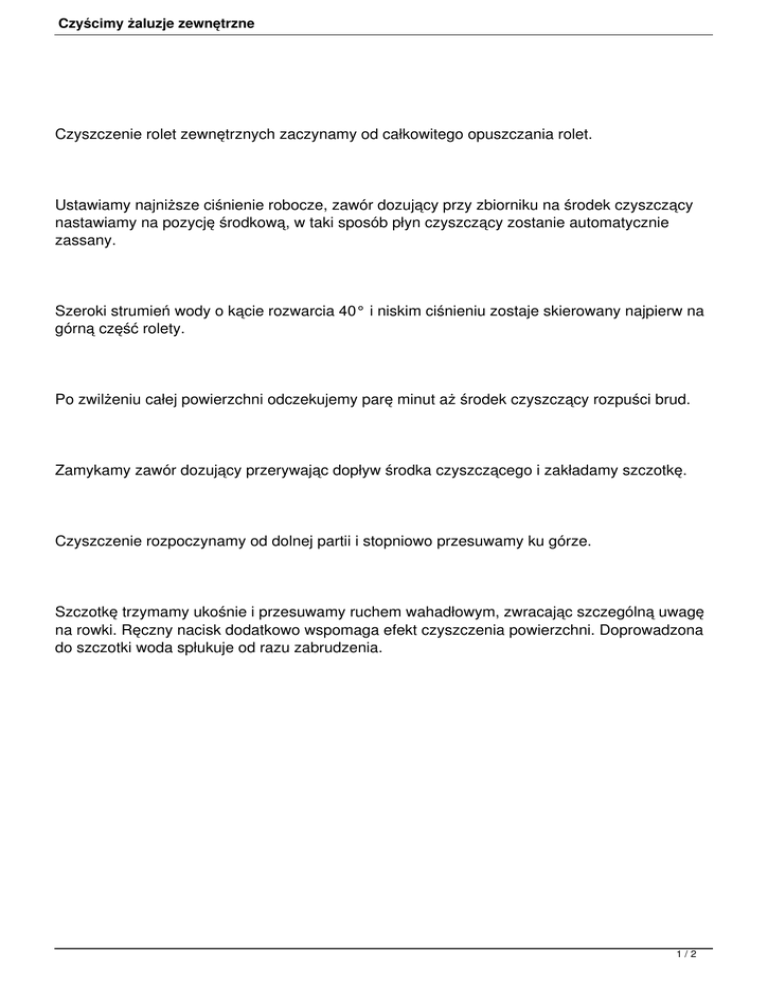 Czyścimy żaluzje zewnętrzne Czyszczenie rolet zewnętrznych zaczynamy od całkowitego opuszczania rolet. Ustawiamy najniższe ciśnienie robocze, zawór dozujący przy zbiorniku na środek czyszczący nastawiamy na pozycję środkową, w taki sposób płyn czyszczący zostanie automatycznie zassany. Szeroki strumień wody o kącie rozwarcia 40° i niskim ciśnieniu zostaje skierowany najpierw na górną część rolety. Po zwilżeniu całej powierzchni odczekujemy parę minut aż środek czyszczący rozpuści brud. Zamykamy zawór dozujący przerywając dopływ środka czyszczącego i zakładamy szczotkę. Czyszczenie rozpoczynamy od dolnej partii i stopniowo przesuwamy ku górze. Szczotkę trzymamy ukośnie i przesuwamy ruchem wahadłowym, zwracając szczególną uwagę na rowki. Ręczny nacisk dodatkowo wspomaga efekt czyszczenia powierzchni. Doprowadzona do szczotki woda spłukuje od razu zabrudzenia. 1/2 Czyścimy żaluzje zewnętrzne 2/2