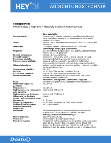 Feinspachtel Modernizacja / Naprawa / Materiaáy budowlane pomocnicze Opis produktu Zastosowanie: Skáad: WáasnoĞci: Wiązanie: Sposób nanoszenia: GruboĞü warstwy: PóĨniejsza obróbka: Przygotowanie podáoĪa: WáasnoĞci podáoĪa: Temperatura obróbki: ZuĪycie: Czyszczenie narzĊdzi: WaĪne wskazówki: Feinspachtel to wiązana cementem, modyfikowana polimerami masa szpachlowa naprawcza do precyzyjnego szpachlowania powierzchni licowych. Feinspachtel to modyfikowana polimerami, wodoodporna zaprawa naprawcza Dobra przyczepnoĞü i niewielkie wáasnoĞci skurczowe. Informacje dotyczące stosowania czas przydatnoĞci do stosowania: ok 3 godziny, czas zakoĔczenia tĊĪenia: po ok. 4-5 godzinach nanosiü odpowiednią kielnią Ğrednio ok. 1 mm, maks. 5 mm w jednej operacji roboczej chroniü przed zbyt silnym promieniowaniem sáonecznym wstĊpnie zwilĪyü, ewentualnie z dodatkiem HaftemulsionKonzentrat (koncentratu do zwiĊkszania przyczepnoĞci podáoĪa) podáoĪe musi nie zawieraü gipsu, byü stabilne i wolne od wszelkich warstw antyadhezyjnych od +5qC ok. 1,7 kg/m2 dla warstwy o gruboĞci 1 mm zmyü wodą, utwardzony preparatem Kalklöser podáoĪe silnie wstĊpnie zwilĪyü, chroniü przed zbyt silnym promieniowaniem sáonecznym WáasnoĞci biologiczne/chemiczne/fizyczne Baza: MoĪliwoĞü wejĞcia na powáokĊ: ObciąĪalnoĞü: WytrzymaáoĞü na rozciąganie przy zginaniu: WytrzymaáoĞü na Ğciskanie: OdpornoĞü na dziaáanie mrozu i soli stosowanej zimą: Granulacja: Proporcje mieszaniny: MoĪliwoĞü póĨniejszego nanoszenia powáok malarskich: Domieszki: modyfikowana polimerami, wodoodporna masa szpachlowa po 2 dniach po 2 dniach po 28 dniach (8 N/mm2) po 28 dniach (25 N/mm2) istnieje 0 – 0,3 mm ok. 4,5 wody zarobowej na 25 kg suchej zaprawy po 5 – 6 godzinach Haftemulsion-Konzentrat (w celu zwiĊkszenia elastycznoĞci, przyczepnoĞci i wodoodpornoĞci zaprawy) lub woda Zakup/Zamówienie/Informacja Numer artykuáu: Usuwanie: Przechowywanie: 126 810 (worek 25 kg) po utwardzeniu z gruzem budowlanym Feinspachtel moĪna przechowywaü oryginalnie zapakowany przez 2 lata od daty dostawy bez pogorszenia jakoĞci (patrz data dostawy na dowodzie dostawy). Materiaá nie jest wraĪliwy na dziaáanie mrozu, ale naleĪy go przechowywaü w miejscu suchym. 4QJTUSFžDJ 4QJTUSFžDJ 1PXZƒT[ZDIXTLB[ØXFLVE[JFMBNZ1BŴTUXVOBQPETUBXJFQS[FQSPXBE[POZDIQSØCJEPžXJBED[FŴ/JFHXBSBOUVKFNZKFEOBL[B FGFLULPŴDPXZXKFEOPTULPXZNQS[ZQBELV[QPXPEVNPƒMJXPžDJS؃OPSPEOFHP[BTUPTPXBOJBOBT[ZDIQSPEVLUØXKBLJOJF[B MFƒOZDIPEOBTXBSVOLØXNBHB[ZOPXBOJBJVƒZDJB0CPXJŕ[VKFUPSØXOJFƒXXZQBELVSPT[D[FŴX[HMŢEFNOBT[ZDIEPSBEDØX UFDIOJD[OZDIJIBOEMPXZDI;BMFDBTJŢQS[FQSPXBE[BOJFXBTOZDIQSØC 8NPNFODJFVLB[BOJBTJŢOJOJFKT[FHPQSPTQFLUVXT[ZTULJFXZEBOJB[PTUBKŕVOJFXBƒOJPOF8ZEBOP #PTUJL1PMTLB4Q[PPtVMĽSFE[LBt,MFT[D[FXPL1P[OBOJB Bostik Sp. z o.o. • ul. Średzka 8 • 63-005 Kleszczewo k./Poznania 5FM'BYt5FMt5FM Tel. / Fax 061 / 663 88 87 • Tel. 061 / 663 88 86 • Tel. 502 / 16 16 26