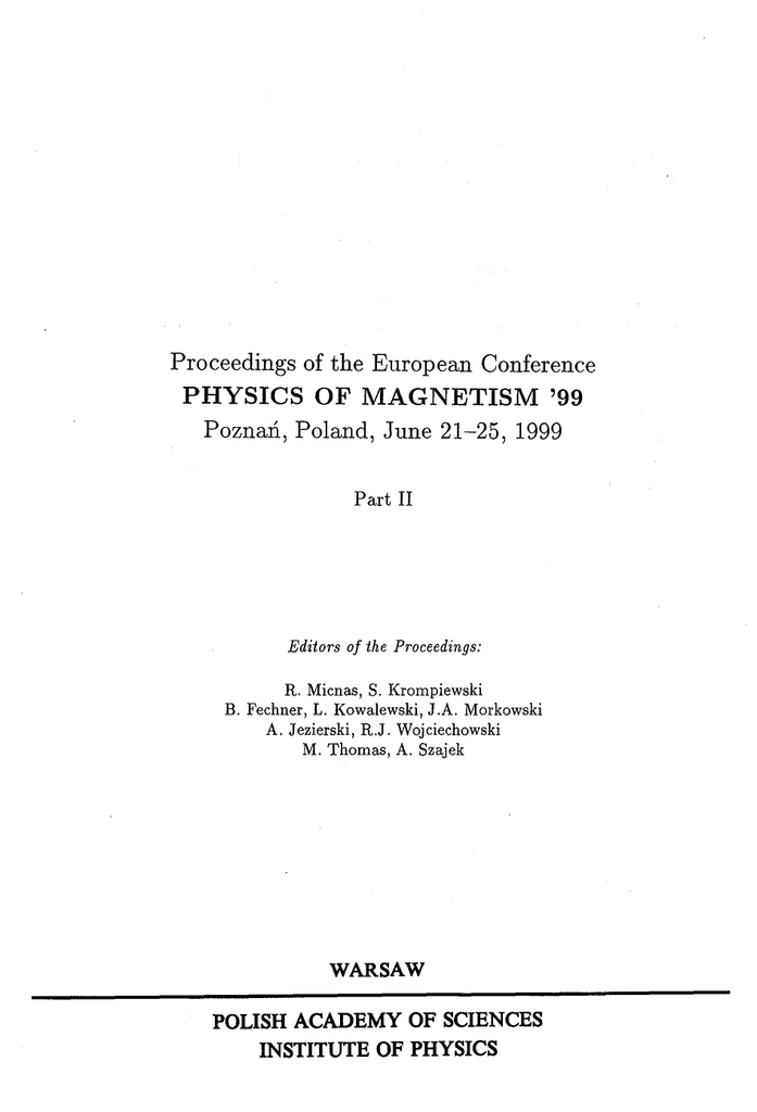 Proceedings of the European Conference PHYSICS OF MAGNETISM '99 Poznań, Poland, June 21-25, 1999 Part II Editors of the Proceedings: R. Micnas, S. Krompiewski B. Fechner, L. Kowalewski, J.A. Morkowski A. Jezierski, R.J. Wojciechowski M. Thomas, A. Szajek WARSAW POLISH ACADEMY OF SCIENCES INSTITUTE OF PHYSICS CHAIRMEN R. Micnas, Institute of Physics, A. Mickiewicz University, Poznań S. Krompíewskí, Institute of Molecular Physics, Polish Academy of Sciences, Poznań PROGRAMME COMMITTEE J. Barnaś, Poznań, Poland T. Dietl, Warszawa, Poland B. Fechner, Poznań, Poland P. Fulde, Dresden, Germany R. Gałązka, Warszawa, Poland P. Grünberg, Julich, Germany B.L. Györffy, Bristol, UK J. Jensen, Copenhagen, Denmark J. Johnston, Ames, USA J. Kirschner, Halle/Sacrle, Germany J. Klamut, Wrocław, Poland L. Kowalewski, Poznań, Poland U. Kret', Regensburg, Germany P.A. Lindgard, Roskilde, Denmark J.A. Morkowski, Poznań, Poland A.M. Oleś, Kraków, Poland H. Puszkarski, Poznań, Poland K. Röll, Kassel, Germany T. Schneider, Zürich, Switzerland T. Shinjo, Kyoto, Japan W. Suski, Wroclaw, Poland J. Sznajd, Wrocław, Poland H. Szymczak, Warszawa, Poland A. Szytuła, Kraków, Poland C.M. Varma, Murray Hill, USA P. Wachter, Zürich, Switzerland L. Wojtczak, łódź, Poland K.I. Wysokiński, Lublin, Poland ORGANIZING COMMITTEE Secretaries: M. Thomas, A. Szajek J. Barnaś J. Baszyński B. Bulka J. Dubowik B. Fechner B. Idzikowski I. Goścíańska A. Jezierski L. Kowalewski A. Lehmann-Szweykowska S. Lipiński J.A. Morkowskí Z. Jacyna-Onyszkiewicz A. Pawlak H. Ratajczak S. Robaszkiewicz F. Stobieckí R.J. Wojciechowski M. Zwierzycki R. Żuberek CONFERENCE SPONSORS Committee for Scientific Research Ministry of National Education Committee of Physics of the Polish Academy of Sciences "Kasa im. Józefa Mianowskiego" — Fundacja Popierania Nauki Hotel Orbis "Poznań" Kompania Piwowarska S.A.