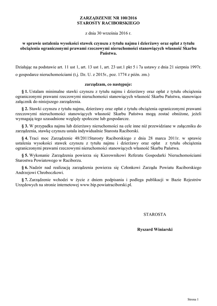 ZARZĄDZENIE NR 100/2016 STAROSTY RACIBORSKIEGO z dnia 30 września 2016 r. w sprawie ustalenia wysokości stawek czynszu z tytułu najmu i dzierżawy oraz opłat z tytułu obciążenia ograniczonymi prawami rzeczowymi nieruchomości stanowiących własność Skarbu Państwa. Działając na podstawie art. 11 ust 1, art. 13 ust 1, art. 23 ust.1 pkt 5 i 7a ustawy z dnia 21 sierpnia 1997r. o gospodarce nieruchomościami (t.j. Dz. U. z 2015r., poz. 1774 z późn. zm.) zarządzam, co następuje: § 1. Ustalam minimalne stawki czynszu z tytułu najmu i dzierżawy oraz opłat z tytułu obciążenia ograniczonymi prawami rzeczowymi nieruchomości stanowiących własność Skarbu Państwa, stanowiące załącznik do niniejszego zarządzenia. § 2. Stawki czynszu z tytułu najmu, dzierżawy oraz opłat z tytułu obciążenia ograniczonymi prawami rzeczowymi nieruchomości stanowiących własność Skarbu Państwa mogą zostać obniżone, jeżeli wymagają tego uzasadnione względy społeczne lub gospodarcze. § 3. W przypadku najmu lub dzierżawy nieruchomości na cele inne niż przewidziane w załączniku do zarządzenia, stawkę czynszu ustala indywidualnie Starosta Raciborski. § 4. Traci moc Zarządzenie 48/2011Starosty Raciborskiego z dnia 28 marca 2011r. w sprawie ustalenia wysokości stawek czynszu z tytułu najmu i dzierżawy oraz opłat z tytułu obciążenia ograniczonymi prawami rzeczowymi nieruchomości stanowiących własność Skarbu Państwa. § 5. Wykonanie Zarządzenia powierza się Kierownikowi Referatu Gospodarki Nieruchomościami Starostwa Powiatowego w Raciborzu. § 6. Nadzór nad realizacją zarządzenia powierza się Członkowi Zarządu Powiatu Raciborskiego Andrzejowi Chroboczkowi. § 7. Zarządzenie wchodzi w życie z dniem podpisania i podlega publikacji w Bazie Rejestrów Urzędowych na stronie internetowej www.bip.powiatraciborski.pl. STAROSTA Ryszard Winiarski Strona 1 Załącznik do Zarządzenia Nr 100/2016 Starosty Raciborskiego z dnia 30 września 2016 r. § 1. 1. Miesięczne stawki czynszu za lokale użytkowe wynoszą: Przeznaczenie lokalu zł/m2 Cele handlowe 10,00 Cele gastronomiczne 9,00 Cele biurowe 9,00 Gabinety medyczne 9,00 Usługi i zakłady produkcyjne 6,00 Garaże 4,00 Organizacje społeczne, kulturalne, polityczne, itp. 2,00 § 2. Miesięczne stawki czynszu za grunty inne niż rolne wynoszą: Przeznaczenie gruntów zł/m2 Cele handlowo-usługowe 3,50 Cele garażowe 2,50 Cele przemysłowe 0,40 § 3. Miesięczna stawka czynszu z tytułu najmu lokali mieszkalnych wynosi 4,50 zł/m2. § 4. Roczna stawka czynszu z tytułu dzierżawy gruntów rolnych wynosi równowartość pieniężną ilości pszenicy określonej w oparciu o rozporządzenie ministra właściwego do spraw rozwoju wsi. Średnia krajowa cena skupu pszenicy publikowana jest w formie obwieszczeń Prezesa Głównego Urzędu Statystycznego. § 5. Roczna stawka czynszu z tytułu dzierżawy gruntów przeznaczonych na działki rekreacyjne wynosi 0,25 zł/m2. § 6. Ustala się dzienną stawkę czynszu dla 1m2 powierzchni zajętych pod: a) funkcje reklamowe, których powierzchnia reklamy nie przekracza 1m2 - 1,20 zł, b) funkcje reklamowe, których powierzchnia reklamy wynosi od 1 m2 do 3 m2 - 1,60 zł, c) funkcje reklamowe, których powierzchnia reklamy wynosi powyżej 3 m2 - 3,20 zł. § 7. Ustalenie odpłatności za ustanowienie ograniczonego prawa rzeczowego (służebność, użytkowanie) następuje na podstawie operatu szacunkowego sporządzonego przez uprawnionego rzeczoznawcę majątkowego. § 8. Opłata za bezumowne korzystanie z nieruchomości stanowiących własność Skarbu Państwa naliczana będzie każdorazowo przez Starostę Raciborskiego, w wysokości nie mniejszej niż wysokość stawki obowiązującej na mocy niniejszego zarządzenia. § 9. Stawki nie zawierają podatku VAT, ani podatku od nieruchomości. STAROSTA Ryszard Winiarski Strona 2