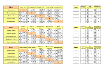 temp 1 Liga Widuch Anna Widuch Anna X Zarówny Jagoda 2 Zaręba Anita 1 Wysłocka Olga 0 Wolska Karolina 0 11 3 9 2 11 7 2 11 7 2 11 0 Zarówny Jagoda 0 1 5 11 8 5 11 4 11 0 0 2 0 11 0 0 0 0 0 0 2 Zaręba Anita 3 5 11 1 2 X 2 3 11 5 2 11 3 2 11 2 1 11 4 11 5 11 0 0 0 0 0 0 2 0 Wysłocka Olga Wolska Karolina 11 9 11 0 3 8 11 2 11 2 11 2 1 X 2 1 9 11 12 0 10 2 5 11 11 9 0 0 0 0 0 11 7 11 0 5 11 0 9 0 11 5 11 4 11 5 X 2 2 2 0 2 11 7 11 0 3 10 2 12 11 0 5 0 5 4 0 11 11 0 11 4 11 5 9 11 11 4 X miejsce wygrane mecze 2 3 1 4 3 1 4 1 5 1 miejsce wygrane mecze 4 1 2 3 3 2 1 4 5 0 miejsce wygrane mecze 4 2 5 0 3 2 1 3 2 3 sety z/s różnica 6 3 3 8 8 0 3 -3 6 2 -4 6 2 -4 6 małe punkty z/s różnica 82 25 57 78 49 29 67 -22 89 57 -18 75 51 -34 85 sety z/s różnica 2 -4 6 7 4 3 5 0 5 8 7 1 1 -7 8 małe punkty z/s różnica 59 -22 81 106 13 93 89 7 82 100 43 57 54 -41 95 sety z/s różnica 4 -2 6 2 -6 8 5 1 4 7 4 3 7 3 4 małe punkty z/s różnica 85 -7 92 86 -25 111 81 10 71 113 25 88 107 -3 110 temp 2 Liga Lisowksa Joanna Lisowksa Joanna X Krypczyk Barbara 2 Skulimowska Sylwia 2 Szczepańska Paulina 2 Moser Aleksandra 0 11 9 11 0 4 11 0 4 6 2 11 0 11 6 11 8 11 6 9 11 Krypczyk Barbara 9 6 0 2 11 11 0 0 0 1 0 0 2 0 0 0 0 X 9 11 9 1 11 5 2 11 2 11 7 14 12 10 12 9 11 11 9 0 0 Skulimowska Szczepańska Sylwia Paulina 4 8 4 6 0 2 0 2 11 11 11 11 11 7 11 11 12 9 2 1 1 2 9 11 9 9 14 11 6 4 X 0 2 11 11 11 11 0 2 0 X 6 4 0 4 11 4 2 3 0 1 2 0 2 11 6 11 11 11 0 2 2 2 2 Moser Aleksandra 11 11 0 6 9 11 12 0 5 10 11 6 11 1 4 11 4 11 11 0 2 3 X temp 3 Liga Kanafa Zuzanna Kanafa Zuzanna X Sobas Danuta 1 Cylkowksa Marta 2 Boniakowska Małgorzata 2 Hamczyk Sylwia 1 8 11 11 0 6 11 0 9 10 2 12 2 11 3 11 4 11 8 12 10 5 11 0 0 0 0 2 11 Cylkowksa Sobas Danuta Marta 11 3 11 6 4 2 1 0 2 8 11 5 11 11 6 5 X 0 2 11 11 11 11 0 2 0 X 6 5 0 15 11 11 11 11 0 2 1 2 0 13 13 7 5 5 0 11 16 0 11 7 10 2 0 2 1 4 14 0 4 11 12 Boniakowska Małgorzata 9 8 0 2 11 11 13 13 7 1 2 15 11 11 5 5 0 2 11 11 X 2 1 7 9 12 11 11 10 Hamczyk Sylwia 2 0 1 1 12 10 4 2 11 4 2 11 11 2 7 1 X 10 12 14 16 11 7 11 9 11 2 12 10 10 12