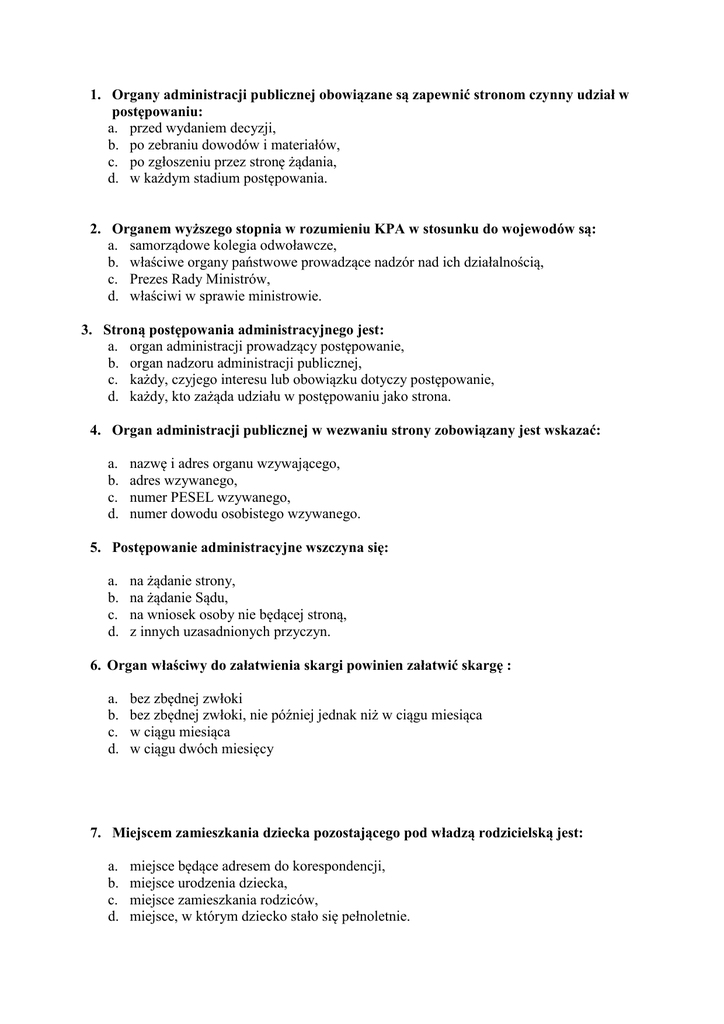 1. Organy administracji publicznej obowiązane są zapewnić stronom czynny udział w postępowaniu: a. przed wydaniem decyzji, b. po zebraniu dowodów i materiałów, c. po zgłoszeniu przez stronę żądania, d. w każdym stadium postępowania. 2. Organem wyższego stopnia w rozumieniu KPA w stosunku do wojewodów są: a. samorządowe kolegia odwoławcze, b. właściwe organy państwowe prowadzące nadzór nad ich działalnością, c. Prezes Rady Ministrów, d. właściwi w sprawie ministrowie. 3. Stroną postępowania administracyjnego jest: a. organ administracji prowadzący postępowanie, b. organ nadzoru administracji publicznej, c. każdy, czyjego interesu lub obowiązku dotyczy postępowanie, d. każdy, kto zażąda udziału w postępowaniu jako strona. 4. Organ administracji publicznej w wezwaniu strony zobowiązany jest wskazać: a. b. c. d. nazwę i adres organu wzywającego, adres wzywanego, numer PESEL wzywanego, numer dowodu osobistego wzywanego. 5. Postępowanie administracyjne wszczyna się: a. b. c. d. na żądanie strony, na żądanie Sądu, na wniosek osoby nie będącej stroną, z innych uzasadnionych przyczyn. 6. Organ właściwy do załatwienia skargi powinien załatwić skargę : a. b. c. d. bez zbędnej zwłoki bez zbędnej zwłoki, nie później jednak niż w ciągu miesiąca w ciągu miesiąca w ciągu dwóch miesięcy 7. Miejscem zamieszkania dziecka pozostającego pod władzą rodzicielską jest: a. b. c. d. miejsce będące adresem do korespondencji, miejsce urodzenia dziecka, miejsce zamieszkania rodziców, miejsce, w którym dziecko stało się pełnoletnie. 8. Przedsiębiorcą jest: a. starostwo powiatowe, b. osoba fizyczna prowadząca we własnym imieniu działalność gospodarczą lub zawodową, c. urząd marszałkowski, d. urząd wojewódzki. 9. Mieniem, w rozumieniu przepisów Kodeksu Cywilnego jest: a. b. c. d. prawo własności przedmiotów materialnych, dzierżawa, służebność gruntowa, własność. 10. Osobami prawnymi są: a. b. c. d. wojewoda, marszałek województwa, starosta, Skarb Państwa. 11. Oświadczenie woli jest nieważne jeżeli: a. b. c. d. nie zostało złożone w formie pisemnej, zostało złożone przez osobę chorą psychicznie, nie zostało sporządzone w formie aktu notarialnego, nie zostało sporządzone w obecności pracownika administracji publicznej. 12. Prokura powinna być pod rygorem nieważności udzielona: a. b. c. d. w formie aktu notarialnego, ustnie w obecności stron zainteresowanych, na piśmie, ustnie w obecności dwóch świadków. 13. Roszczenia wynikające z umowy o dzieło przedawniają się z upływem: a. b. c. d. 1 roku od dnia oddania dzieła, 2 lat od dnia oddania dzieła, 3 lat od dnia oddania dzieła, 5 lat od dnia oddania dzieła. 14. W jakim terminie należy zgłaszać prace geodezyjne i kartograficzne? a. b. c. d. uzgodnionym z właściwym miejscowo i rzeczowo ośrodkiem, przed przewidzianym terminem rozpoczęcia tych prac, co najmniej 3 dni przed przewidzianym terminem rozpoczęcia tych prac, co najmniej 7 dni przed przewidzianym terminem rozpoczęcia tych prac. 15. Prace geodezyjne to: a. b. c. d. sporządzanie projektów zagospodarowania terenu, wykonywanie zdjęć lotniczych, sporządzanie operatów szacunkowych, prace polegające na przebudowie obiektów budowlanych. 16. Projekty szczegółowych osnów geodezyjnych zatwierdza: a. b. c. d. wojewoda, wojewódzki inspektor nadzoru geodezyjnego i kartograficznego, geodeta województwa, starosta. 17. Tereny zamknięte ustalają: a. b. c. d. 18. a. b. c. d. starostowie, wojewodowie, właściwi ministrowie lub kierownicy urzędów centralnych, Główny Geodeta Kraju. Koszty zakładania osnów geodezyjnych pokrywa się: z budżetu gminy, z budżetu państwa, ze środków budżetowych wojewody, ze środków marszałka województwa. 19. Organami administracji geodezyjnej i kartograficznej są: a. b. c. d. Główny Geodeta Kraju, wojewoda, marszałek województwa, geodeta powiatowy. 20. Do zadań marszałka województwa w zakresie geodezji i kartografii należy: a. b. c. d. zakładanie osnów geodezyjnych, zakładanie baz danych opracowań kartograficznych w skalach 1:500 i 1:1000, prowadzenie wojewódzkiego zasobu geodezyjnego i kartograficznego, prowadzenie szkoleń dla administracji geodezyjnej szczebla powiatowego. 21. Osoby wykonujące prace geodezyjne i kartograficzne mają prawo: a. umieszczania znaków granicznych bez poinformowania stron zainteresowanych, b. wykonywania odkrywek zasypanych urządzeń podziemnych w celu ich inwentaryzacji powykonawczej. c. wykonywania przecinek drzew na terenach lasów państwowych, d. umieszczania na gruntach i obiektach budowlanych budowli triangulacyjnych. 22. Właściciele nieruchomości są obowiązani zgłaszać właściwemu staroście zmiany danych objętych ewidencją gruntów i budynków w terminie: a. b. c. d. 14 dni od dnia powstania zmian, 30 dni od dnia powstania zmian, niezwłocznie, w ciągu 1 roku od powstania zmian. 23. Starosta udostępnia dane ewidencji gruntów i budynków w formie: a. b. c. d. wyrysów z mapy zasadniczej, wypisów z rejestru, kopii z protokołów ze wznowienia położenia znaków granicznych, informacji ustnej, stosownie do żądania zainteresowanego. 24. Inwestorzy sieci uzbrojenia terenu są zobowiązani: a. do opracowania projektu usytuowania sieci przez jednostkę wykonawstwa geodezyjnego, b. do ustanowienia nadzoru geodezyjnego nad realizacją sieci, c. do uzgadniania usytuowania projektowanych sieci uzbrojenia terenu z właściwymi starostami, d. do przekazania do właściwego ośrodka dokumentacji geodezyjnej i kartograficznej, projektu usytuowania sieci uzbrojenia terenu. 25. Rozgraniczenie nieruchomości ma na celu: a. b. c. d. ustalenie przebiegu ich granic przez określenie położenia punktów i linii granicznych, wznowienie zniszczonych lub uszkodzonych znaków granicznych, ustalenie właścicieli i władających sąsiednimi nieruchomościami, likwidację sporów 