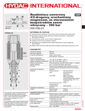 32l/min. 350 bar FUNKCJA Rozdzielacz zaworowy 4/2-drogowy, uruchamiany magnesem, ze sterowaniem bezpośrednim zawór wkręcany – 350 bar WK10N-01 Informacje ogólne zz Powierzchnie zewnętrzne są chronione przed korozją przez cynkowanie zz Minimalne zużycie i długa żywotność dzięki hartowanym i szlifowanym elementom zaworów zz Uszczelnienie cewek chroni system magnetyczny zz Dostępna duża liczba wariantów wtyków zz Doskonała moc przełączeniowa dzięki magnesom o dużej wydajności firmy HYDAC zz Niskie straty ciśnienia dzięki geometrii przepływu optymalizowanej przez CFD PARAMETRY Zakres temperatury medium hydraulicznego: Zakres temperatury otoczenia: Medium hydrauliczne: Zakres lepkości: Filtracja: Położenie montażowe: Materiał: Przestrzeń montażowa: Ciężar: W przypadku cewki elekromagnetycznej niezasilanej prądem przepływ przez zawór może się odbywać od przyłącza 3 do 1 oraz w kierunku przeciwnym, podczas gdy przyłącza 2 i 4 są zamknięte. W przypadku cewki elekromagnetycznej zasilanej prądem przepływ przez zawór może się odbywać od przyłącza 3 do 4 i od przyłącza 1 do 2 oraz w kierunku przeciwnym. Instalacja elektryczna: Rodzaj napięcia: Prąd znamionowy przy temp. 20 °C: Tolerancja napięcia: Czas załączenia: Wersja cewki: 350 bar 32 l/min. maks. 140 cm³/min przy 250 bar i 34 mm²/s min. -20 °C do maks. +100 °C min. -20 °C do maks. +60 °C Olej hydrauliczny wg DIN 51524 część 1 + część 2 min. 7,4 mm²/s do maks. 420 mm²/s Dopuszczalny stopień zanieczyszczenia cieczy roboczej wg ISO 4406 klasa 21/03/12 lub lepsza dowolne Korpus zaworu: stal automatowa Tłok stal hartowana i szlifowana Uszczelki: NBR (standard) FPM (opcjonalnie, zakres temperatury medium hydraulicznego -20 °C do +120 °C) Pierścienie oporowe: PTFE Cewka elektromagnetyczna: stal /poliamid FC10-4 Zawór kompl.: 0,48 kg tylko cewka: 0,23 kg Elektromagnes zasilany prądem stałym, napięcie zmienne jest wyrównywane za pomocą prostownika zintegrowanego w cewce 2,22 A przy 12 V DC 1,13 A przy 24 V DC ± 15% napięcia znamionowego 100 % ED (praca ciągła) do maks. 115 % napięcia znamionowego przy temp. otoczenia 60 °C Coil…-50-1836 PL 5.974.0/08.15 Ciśnienie robocze: Strumień objętości: Przeciek wewnętrzny: 1 OZNACZENIE TYPU WYMIARY 6kt. 1" Moment obrotowy dokręcania 45+10 Nm Wersja z trybem awaryjnym ręcznym, z nakładką gumową HNBR Po odkręceniu nakrętki mocującej można obrócić cewkę o 360° i ściągnąć. Moment obrotowy dokręcania 4+2 Nm WK10N – 01 M – C – N – 24 DG Oznaczenie Drogowy zawór suwakowy, UNF Wersja 01 = standard Awaryjne uruchomienie ręczne brak informacji = bez awaryjnego uruchomienia ręcznego M = z awaryjnym uruchomieniem ręcznym Rodzaj przyłącza* C = tylko zawór wkręcany (kaseta) SB4= G1/2 obudowa z przyłączami, stalowa AB4= G1/2 obudowa z przyłączami, aluminium Materiał uszczelniający N = NBR (standard) V = FPM Napięcie znamionowe dla magnesu uruchamiającego Napięcie stałe 12 = 12 VDC 24 = 24 VDC Napięcie zmienne (prostownik zintegrowany w cewce) 24 = 24 V AC 230 = 230 V AC inne napięcia na zamówienie Wersja cewki elektromagnetycznej (typ 50-1836) DC: DG = wtyczka urządzenia DIN według EN 175301-803 DK = przyłącze śrubowe KOSTAL M27x1 DL = 2 wolne skrętki, długość 457 mm, 0,75 mm² DN = wtyczka niemiecka, 2-bieg. osiowa DT = AMP Junior Timer, 2-bieg., promieniowy AC: AG = wtyczka urządzenia DIN według EN 175301-803 inne rodzaje przyłącza na zamówienie Wersje standardowe Oznaczenie WK10N-01-C-N-24DG WK10N-01-C-N-230AG więcej modeli na zamówienie Nr mat. 3109892 3109893 *Obudowa przyłącza rury grubość Milimetr (cal) Zastrzega się prawo do zmian technicznych Oznaczenie Nr mat. Materiał Przyłącza FH104-SB4 3037784 Stal, ocynkowana G1/2 FH104-AB4 3038097 Aluminium, eloksalowane G1/2 więcej obudów z przyłączami na zamówienie Zestawy uszczelek Oznaczenie FS104-N SEAL KIT FS104-V SEAL KIT Przestrzeń montażowa FC10-4 Materiał NBR FPM Ciśnienie 420 bar 245 bar Nr mat. 3051912 3071275 CHARAKTERYSTYKA mierzony przy ν = 34 mm²/s, Tolej = +46 °C Strata ciśnienia Strata ciśnienia Strumień objętości mierzony przy ν = 34 mm²/s, Tolej = +46 °C PL 5.974.0/08.15 Ciśnienie robocze Granice zastosowania 2 Formujące narzędzia wiertnicze Oznaczenie Nr mat. Pogłębiacz 176174 stopniowy FC10-4 Rozwiertak FC10-4 176175 Strumień objętości Uwaga Milimetr (cal) Zastrzega się prawo do zmian technicznych Dane zawarte w niniejszym prospekcie odnoszą się do opisanych warunków eksploatacji i zastosowań. W przypadku innych zastosowań należy zwrócić się do odpowiedniego działu. Zastrzega się prawo do wprowadzania zmian technicznych. HYDAC Fluidtechnik GmbH Justus-von-Liebig-Str. D-66280 Sulzbach/Saar Tel.: +49 (0) 68 97 /509 -01 Faks:+49 (0) 68 97 /509 -598 e-mail: [email protected]
