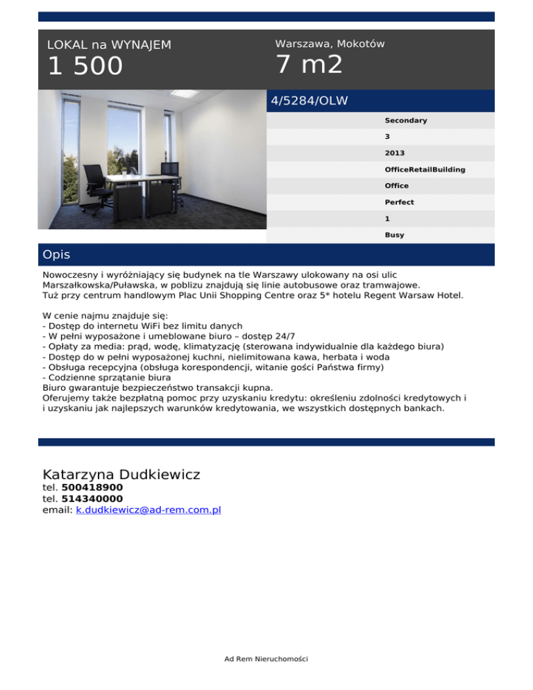 Warszawa, Mokotów LOKAL na WYNAJEM 7 m2 1 500 4/5284/OLW Secondary 3 2013 OfficeRetailBuilding Office Perfect 1 Busy Opis Nowoczesny i wyróżniający się budynek na tle Warszawy ulokowany na osi ulic Marszałkowska/Puławska, w poblizu znajdują się linie autobusowe oraz tramwajowe. Tuż przy centrum handlowym Plac Unii Shopping Centre oraz 5* hotelu Regent Warsaw Hotel. W cenie najmu znajduje się: - Dostęp do internetu WiFi bez limitu danych - W pełni wyposażone i umeblowane biuro – dostęp 24/7 - Opłaty za media: prąd, wodę, klimatyzację (sterowana indywidualnie dla każdego biura) - Dostęp do w pełni wyposażonej kuchni, nielimitowana kawa, herbata i woda - Obsługa recepcyjna (obsługa korespondencji, witanie gości Państwa firmy) - Codzienne sprzątanie biura Biuro gwarantuje bezpieczeństwo transakcji kupna. Oferujemy także bezpłatną pomoc przy uzyskaniu kredytu: określeniu zdolności kredytowych i i uzyskaniu jak najlepszych warunków kredytowania, we wszystkich dostępnych bankach. Katarzyna Dudkiewicz tel. 500418900 tel. 514340000 email: [email protected] Ad Rem Nieruchomości Powered by TCPDF (www.tcpdf.org)