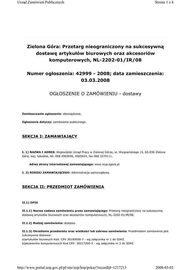 Urząd Zamówień Publicznych Strona 1 z 4 Zielona Góra: Przetarg nieograniczony na sukcesywną dostawę artykułów biurowych oraz akcesoriów komputerowych, NL-2202-01/IR/08 Numer ogłoszenia: 42999 - 2008; data zamieszczenia: 03.03.2008 OGŁOSZENIE O ZAMÓWIENIU - dostawy Zamieszczanie ogłoszenia: obowiązkowe. Ogłoszenie dotyczy: zamówienia publicznego. SEKCJA I: ZAMAWIAJĄCY I. 1) NAZWA I ADRES: Wojewódzki Urząd Pracy w Zielonej Górze, ul. Wyspiańskiego 15, 65-036 Zielona Góra, woj. lubuskie, tel. 068 4565656, 4565624, fax 068 3270111. Adres strony internetowej zamawiającego: www.wup.zgora.pl I. 2) RODZAJ ZAMAWIAJĄCEGO: Administracja samorządowa. SEKCJA II: PRZEDMIOT ZAMÓWIENIA II.1) OPIS II.1.1) Nazwa nadana zamówieniu przez zamawiającego: Przetarg nieograniczony na sukcesywną dostawę artykułów biurowych oraz akcesoriów komputerowych, NL-2202-01/IR/08. II.1.2) Rodzaj zamówienia: dostawy. II.1.3) Określenie przedmiotu oraz wielkości lub zakresu zamówienia: Przedmiotem zamówienia jest sukcesywna dostawa: a)artykułów biurowych Kod: CPV 30190000-7 - wg załącznika nr 1 do SIWZ b)akcesoriów komputerowych Kod CPV: 30217200-5 - wg załącznika nr 2 do SIWZ http://www.portal.uzp.gov.pl/pl/site/uzp/bzp/pokaz?recordId=1217213 2008-03-03 Urząd Zamówień Publicznych Strona 2 z 4 c)akcesoriów komputerowych Kod CPV: 30217200-5 - wg załącznika nr 3 do SIWZ Dostawa obejmuje artykuły biurowe i nowe akcesoria komputerowe oraz materiały eksploatacyjne do drukarek i kserokopiarek II.1.4) Wspólny Słownik Zamówień (CPV): 30.21.72.00-5, 30.19.00.00-7. II.1.5) Czy dopuszcza się złoŜenie oferty częściowej: Tak, ilość części: 3. II.1.6) Czy dopuszcza się złoŜenie oferty wariantowej: Nie. II.2) CZAS TRWANIA ZAMÓWIENIA LUB TERMIN WYKONANIA: data zakończenia: 31.12.2008. SEKCJA III: INFORMACJE O CHARAKTERZE PRAWNYM, EKONOMICZNYM, FINANSOWYM I TECHNICZNYM III.1) WARUNKI DOTYCZĄCE ZAMÓWIENIA Informacja na temat wadium: nie dotyczy. III.2) WARUNKI UDZIAŁU Opis warunków udziału w postępowaniu oraz opis sposobu dokonywania oceny spełniania tych warunków: 1)Warunkiem udziału w postępowaniu jest złoŜenie kompletnej i podpisanej oferty według formularzy stanowiących załącznik nr 1, 2 i 3 do SIWZ, podpisanych przez Wykonawcę lub osobę upowaŜnioną do reprezentowania Wykonawcy. 2)Wykonawcy muszą równieŜ spełniać warunki określone w art. 22 ust. 1 ustawy z dnia 29 stycznia 2004 r Prawo zamówień publicznych (t.j.: Dz. U. z 2007 r. Nr 223 poz.1655). 3)Wykonawcy nie mogą podlegać wykluczeniu na podstawie warunków określonych w art. 24 ust. 1 ustawy z dnia 29 stycznia 2004r Prawo zamówień publicznych (t.j.: Dz. U. z 2007 r. Nr 223 poz.1655). 4)Oceny spełnienia tych warunków pod względem kompletności, zgodności z ustawą Prawo zamówień publicznych i przepisami dotyczącymi udzielania pełnomocnictwa dokona Zamawiający na podstawie dokumentów złoŜonych przez Wykonawcę zgodnie ze Specyfikacją Istotnych Warunków Zamówienia, według formuły spełnia/nie spełnia. Informacja o oświadczeniach i dokumentach, jakie mają dostarczyć wykonawcy w celu potwierdzenia spełniania warunków udziału w postępowaniu: W celu potwierdzenia spełnienia przez Wykonawców warunków, o których mowa w artykule 22 ust. 1 oraz art. 24 ustawy Prawo zamówień publicznych Wykonawcy dostarczają wraz z ofertą: a) stosowne oświadczenie, którego wzór stanowi załącznik nr 4 do SIWZ, b) aktualne odpisy z właściwych rejestrów albo aktualne zaświadczenie o wpisie do ewidencji działalności gospodarczej - wystawione nie wcześniej niŜ 6 miesięcy przed upływem terminu składania ofert W przypadku składania oferty przez Wykonawców ubiegających się wspólnie o udzielenie zamówienia, wymagany dokument musi być złoŜony przez kaŜdego Wykonawcę. Wszystkie ww. dokumenty mogą być złoŜone w formie oryginałów lub uwierzytelnionych kopii, potwierdzonych za zgodność z oryginałem przez osobę uprawnioną do podpisania oferty z dopiskiem za zgodność z oryginałem oraz datą. http://www.portal.uzp.gov.pl/pl/site/uzp/bzp/pokaz?recordId=1217213 2008-03-03 Urząd Zamówień Publicznych Strona 3 z 4 SEKCJA IV: PROCEDURA IV.1) TRYB UDZIELENIA ZAMÓWIENIA IV.1.1) Tryb udzielenia zamówienia: przetarg nieograniczony. IV.2) KRYTERIA OCENY OFERT IV.2.1) Kryteria oceny ofert: najniŜsza cena. IV.2.2) Wykorzystana będzie aukcja elektroniczna: Nie. IV.3) INFORMACJE ADMINISTRACYJNE IV.3.1) Adres strony internetowej, na której dostępna jest specyfikacja istotnych warunków zamówienia: www.wup.zgora.pl Specyfikację istotnych warunków zamówienia moŜna uzyskać pod adresem: Miejscem składania ofert jest siedziba Zamawiającego - Wojewódzki Urząd Pracy w Zielonej Górze ul. Wyspiańskiego 15, II piętro, Sekretariat pok. 210.. IV.3.2) Opis potrzeb i wymagań zamawiającego określonych w sposób umoŜliwiający przygotowanie się wykonawców do udziału w dialogu konkurencyjnym lub informacja o sposobie uzyskania tego opisu: nie dotyczy IV 3.3) Informacja o wysokości nagród dla wykonawców, którzy podczas dialogu konkurencyjnego przedstawili rozwiązania stanowiące podstawę do składania ofert, jeŜeli zamawiający przewiduje nagrody: nie dotyczy IV.3.4) Termin składania wniosków o dopuszczenie do udziału w postępowaniu lub ofert: 11.03.2008 godzina 10:00, miejsce: Miejscem składania ofert jest siedziba Zamawiającego - Wojewódzki Urząd Pracy w Zielonej Górze ul. Wyspiańskiego 15, II piętro, Sekretariat pok. 210.. IV.3.5) Termin związania ofertą: okres w dniach: 30 (od ostatecznego terminu składania ofert). IV.3.6) Informacje dodatkowe, w tym dotyczące finansowania projektu/programu ze środków Unii Europejskiej: nie dotyczy ZAŁĄCZNIK I - INFORMACJE DOTYCZĄCE OFERT CZĘŚCIOWYCH CZĘŚĆ Nr: 1 NAZWA: sukcesywna dostawa artykułów biurowych. 1) Krótki opis ze wskazaniem wielkości lub zakresu zamówienia: Materiały biur