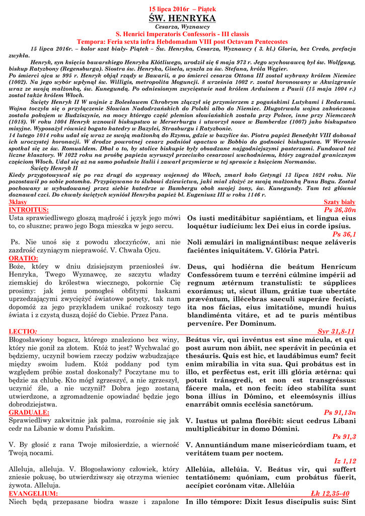 15 lipca 2016r – Piątek ŚW. HENRYKA Cesarza, Wyznawcy S. Henrici Imperatoris Confessoris - III classis Tempora: Feria sexta infra Hebdomadam VIII post Octavam Pentecostes 15 lipca 2016r. – kolor szat biały- Piątek – Św. Henryka, Cesarza, Wyznawcy ( 3. kl.) Gloria, bez Credo, prefacja zwykła. Henryk, syn księcia bawarskiego Henryka Kłótliwego, urodził się 6 maja 973 r. Jego wychowawcą był św. Wolfgang, biskup Ratyzbony (Regensburga). Siostra św. Henryka, Gisela, wyszła za św. Stefana, króla Węgier. Po śmierci ojca w 995 r. Henryk objął rządy w Bawarii, a po śmierci cesarza Ottona III został wybrany królem Niemiec (1002). Na jego wybór wpłynął św. Willigis, metropolita Moguncji. 8 września 1002 r. został koronowany w Akwizgranie wraz ze swoją małżonką, św. Kunegundą. Po odniesionym zwycięstwie nad królem Arduinem z Pawii (15 maja 1004 r.) został także królem Włoch. Święty Henryk II W wojnie z Bolesławem Chrobrym złączył się przymierzem z pogańskimi Lutykami i Redarami. Wojna toczyła się o przyłączenie Słowian Nadodrzańskich do Polski albo do Niemiec. Długotrwała wojna zakończona została pokojem w Budziszynie, na mocy którego część plemion słowiańskich została przy Polsce, inne przy Niemczech (1018). W roku 1004 Henryk wznowił biskupstwo w Merserburgu i utworzył nowe w Bamberdze (1007) jako biskupstwo misyjne. Wyposażył również bogato katedry w Bazylei, Strasburgu i Ratyzbonie. 14 lutego 1014 roku udał się wraz ze swoją małżonką do Rzymu, gdzie w bazylice św. Piotra papież Benedykt VIII dokonał ich uroczystej koronacji. W drodze powrotnej cesarz podniósł opactwo w Bobbio do godności biskupstwa. W Weronie spotkał się ze św. Romualdem. Dbał o to, by stolice biskupie były obsadzane najgodniejszymi pasterzami. Fundował też liczne klasztory. W 1022 roku na prośbę papieża wyruszył przeciwko cesarzowi wschodniemu, który zagrażał granicznym częściom Włoch. Udał się aż na samo południe Italii i zawarł przymierze w tej sprawie z księciem Normanów. Święty Henryk II Kiedy przygotowywał się po raz drugi do wyprawy wojennej do Włoch, zmarł koło Getyngi 13 lipca 1024 roku. Nie pozostawił po sobie potomka. Przypisywano to ślubowi dziewictwa, jaki miał złożyć ze swoją małżonką Panu Bogu. Został pochowany w wybudowanej przez siebie katedrze w Bambergu obok swojej żony, św. Kunegundy. Tam też głównie doznawał czci. Do chwały świętych wyniósł Henryka papież bł. Eugeniusz III w roku 1146 r. 3klasy Szaty biały INTROITUS: Ps 36,30n Usta sprawiedliwego głoszą mądrość i język jego mówi Os iusti meditábitur sapiéntiam, et lingua eius to, co słuszne; prawo jego Boga mieszka w jego sercu. loquétur iudícium: lex Dei eius in corde ipsíus. Ps 36,1 Ps. Nie unoś się z powodu złoczyńców, ani nie Noli æmulári in malignántibus: neque zeláveris zazdrość czyniącym nieprawość. V. Chwała Ojcu. faciéntes iniquitátem. V. Glória Patri. ORATIO: Boże, który w dniu dzisiejszym przeniosłeś św. Deus, qui hodiérna die beátum Henrícum Henryka, Twego Wyznawcę, ze szczytu władzy Confessórem tuum e terréni cúlmine impérii ad ziemskiej do królestwa wiecznego, pokornie Cię regnum ætérnum transtulísti: te súpplices prosimy: jak jemu pomogłeś obfitymi łaskami exorámus; ut, sicut illum, grátiæ tuæ ubertáte uprzedzającymi zwyciężyć światowe ponęty, tak nam prævéntum, illécebras saeculi superáre fecísti, dopomóż za jego przykładem unikać rozkoszy tego ita nos fácias, eius imitatióne, mundi huius świata i z czystą duszą dojść do Ciebie. Przez Pana. blandiménta vitáre, et ad te puris méntibus perveníre. Per Dominum. LECTIO: Syr 31,8-11 Błogosławiony bogacz, którego znaleziono bez winy, Beátus vir, qui invéntus est sine mácula, et qui który nie gonił za złotem. Któż to jest? Wychwalać go post aurum non ábiit, nec sperávit in pecúnia et będziemy, uczynił bowiem rzeczy podziw wzbudzające thesáuris. Quis est hic, et laudábimus eum? fecit między swoim ludem. Któż poddany pod tym enim mirabília in vita sua. Qui probátus est in względem próbie został doskonały? Poczytane mu to illo, et perféctus est, erit illi glória ætérna: qui będzie za chlubę. Kto mógł zgrzeszyć, a nie zgrzeszył, potuit tránsgredi, et non est transgréssus: uczynić źle, a nie uczynił? Dobra jego zostaną fácere mala, et non fecit: ídeo stabilíta sunt utwierdzone, a zgromadzenie opowiadać będzie jego bona illíus in Dómino, et eleemósynis illíus dobrodziejstwa. enarrábit omnis ecclésia sanctórum. GRADUALE: Ps 91,13n Sprawiedliwy zakwitnie jak palma, rozrośnie się jak V. Iustus ut palma florébit: sicut cedrus Líbani cedr na Libanie w domu Pańskim. multiplicábitur in domo Dómini. Ps 91,3 V. By głosić z rana Twoje miłosierdzie, a wierność V. Annuntiándum mane misericórdiam tuam, et Twoją nocami. veritátem tuam per noctem. Iz 1,12 Alleluja, alleluja. V. Błogosławiony człowiek, który Allelúia, allelúia. V. Beátus vir, qui suffert zniesie pokusę, bo utwierdziwszy się otrzyma wieniec tentatiónem: quóniam, cum probátus fúerit, żywota. Alleluja. accípiet corónam vitæ. Allelúia EVANGELIUM: Łk 12,35-40 Niech będą przepasane biodra wasze i zapalone In illo témpore: Dixit Iesus discípulis suis: Sint pochodnie! A wy [bądźcie] podobni do ludzi, oczekujących swego pana, kiedy z uczty weselnej powróci, aby mu zaraz otworzyć, gdy nadejdzie i zakołacze. Szczęśliwi owi słudzy, których pan zastanie czuwających, gdy nadejdzie. Zaprawdę, powiadam wam: Przepasze się i każe im zasiąść do stołu, a obchodząc będzie im usługiwał. Czy o drugiej, czy o trzeciej straży przyjdzie, szczęśliwi oni, gdy ich tak zastanie. A to rozumiejcie, że gdyby gospodarz wiedział, o której godzinie złodziej ma przyjść, nie pozwoliłby włamać się do swego domu. Wy też bądźcie goto