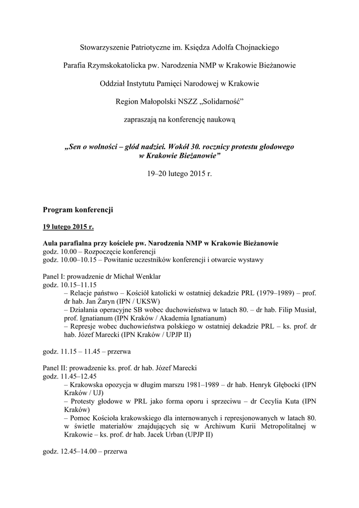 Stowarzyszenie Patriotyczne im. Księdza Adolfa Chojnackiego Parafia Rzymskokatolicka pw. Narodzenia NMP w Krakowie BieŜanowie Oddział Instytutu Pamięci Narodowej w Krakowie Region Małopolski NSZZ „Solidarność” zapraszają na konferencję naukową „Sen o wolności – głód nadziei. Wokół 30. rocznicy protestu głodowego w Krakowie BieŜanowie” 19–20 lutego 2015 r. Program konferencji 19 lutego 2015 r. Aula parafialna przy kościele pw. Narodzenia NMP w Krakowie BieŜanowie godz. 10.00 – Rozpoczęcie konferencji godz. 10.00–10.15 – Powitanie uczestników konferencji i otwarcie wystawy Panel I: prowadzenie dr Michał Wenklar godz. 10.15–11.15 – Relacje państwo – Kościół katolicki w ostatniej dekadzie PRL (1979–1989) – prof. dr hab. Jan śaryn (IPN / UKSW) – Działania operacyjne SB wobec duchowieństwa w latach 80. – dr hab. Filip Musiał, prof. Ignatianum (IPN Kraków / Akademia Ignatianum) – Represje wobec duchowieństwa polskiego w ostatniej dekadzie PRL – ks. prof. dr hab. Józef Marecki (IPN Kraków / UPJP II) godz. 11.15 – 11.45 – przerwa Panel II: prowadzenie ks. prof. dr hab. Józef Marecki godz. 11.45–12.45 – Krakowska opozycja w długim marszu 1981–1989 – dr hab. Henryk Głębocki (IPN Kraków / UJ) – Protesty głodowe w PRL jako forma oporu i sprzeciwu – dr Cecylia Kuta (IPN Kraków) – Pomoc Kościoła krakowskiego dla internowanych i represjonowanych w latach 80. w świetle materiałów znajdujących się w Archiwum Kurii Metropolitalnej w Krakowie – ks. prof. dr hab. Jacek Urban (UPJP II) godz. 12.45–14.00 – przerwa Panel III: prowadzenie dr Cecylia Kuta godz. 14.00–15.05 – Bądźmy solidarni w walce ze złem – geneza, przebieg i konsekwencje protestu głodowego w kościele pw. Narodzenia NMP w Krakowie BieŜanowie w 1985 r. – dr Monika Litwińska (IPN Kraków) – Ksiądz Adolf Chojnacki jako patriota i kustosz pamięci narodowej – dr Łucja Marek (IPN Katowice) – Represje wobec ks. Adolfa Chojnackiego – Michał Malec (IPN Kraków) godz. 15.05–15.35 – Dyskusja i podsumowanie godz. 17.00 Koncert pieśni patriotycznych w wykonaniu chóru „Wspólnota” z Morawicy – kościół pw. Narodzenia NMP godz. 18.00 – Msza św. w intencji uczestników protestu i złoŜenie kwiatów godz. 19.15 – Koncert bardów „Solidarności” w auli parafialnej 20 lutego 2015 r. – drugi dzień konferencji godz. 9.00 – Modlitwa Głodujących (kościół pw. Narodzenia NMP) Część I: prowadzenie dr Maciej Korkuć (naczelnik OBEP IPN Kraków) godz. 9.30–11.00 – Panel dyskusyjny z udziałem uczestników głodówki (aula parafialna) godz. 11.00–11.30 – przerwa Część II: prowadzenie Bogusława Jaglarz (prezes Stowarzyszenia Patriotycznego im. Księdza Adolfa Chojnackiego) godz. 11.30–13.30 – Dyskusja i wspomnienia uczestników głodówki godz. 14.00 – Wspólna modlitwa w kościele pw. Narodzenia NMP (Droga KrzyŜowa Głodujących z 1985 r. )