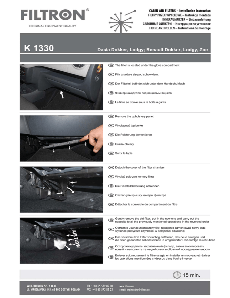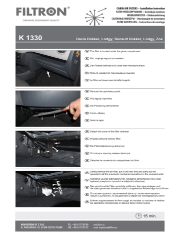 K 1330 Dacia Dokker, Lodgy; Renault Dokker, Lodgy, Zoe The filter is located under the glove compartment Filtr znajduje siĊ pod schowkiem. Der Filterteil befindet sich unter dem Handschuhfach Ɏɢɥɶɬɪ ɧɚɯɨɞɢɬɫɹ ɩɨɞ ɜɟɳɟɜɵɦ ɹɳɢɤɨɦ Le filtre se trouve sous la boîte à gants Remove the upholstery panel. Wyciągnąü tapicerkĊ Die Polsterung demontieren ɋɧɹɬɶ ɨɛɢɜɤɭ Sortir le tapis Detach the cover of the filter chamber Wypiąü pokrywĊ komory filtra Die Filterteilabdeckung abtrennen Oɬɫɬɟɝɧɭɬɶ ɤɪɵɲɤɭ ɤɚɦɟɪɵ ɮɢɥɶɬɪɚ Détacher le couvercle du compartiment du filtre Gently remove the old filter, put in the new one and carry out the opposite to all the previously mentioned operations in the reversed order OstroĪnie usunąü zabrudzony filtr, nastĊpnie zamontowaü nowy oraz wykonaü powyĪsze czynnoĞci w kolejnoĞci odwrotnej Das verschmutzte Filter vorsichtig entfernen, das neue einlegen und die oben genannten Arbeitsschritte in umgekehrter Reihenfolge durchführen Ɉɫɬɨɪɨɠɧɨ ɭɞɚɥɢɬɶ ɡɚɝɪɹɡɧɟɧɧɵɣ ɮɢɥɶɬɪ, ɡɚɬɟɦ ɜɦɨɧɬɢɪɨɜɚɬɶ ɧɨɜɵɣ ɢ ɜɵɩɨɥɧɢɬɶ ɬɟ ɠɟ ɞɟɣɫɬɜɢɹ ɜ ɨɛɪɚɬɧɨɣ ɩɨɫɥɟɞɨɜɚɬɟɥɶɧɨɫɬɢ Enlever soigneusement le filtre usagé, en installer un nouveau et réaliser les opérations mentionnées ci-dessus dans l’ordre inverse 15 min.