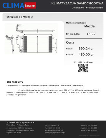 Skraplacz do Mazda 3 Marka samochodu: Mazda G922 Nr. produktu: Cena Netto: 390,24 zł Brutto: 480,00 zł Przejdź do sklepu OPIS PRODUKTU Kod produktu:G922Opis produktu:Numer oryginału: BBM461480C / BBP261480B / BBY26148ZA Czynnik chłodniczy:Wymiary skraplacza (szerxwysxgr): 371 x 573 x 16Rozmiar przyłączy: Rocznik pojazdu: 3 (09-)Pojemność silnika: 1.6 MZR / 2.0 MZR DISI / 2.0 MZR / 2.2 MZR-CD / 2.3 MPS TurboSkraplacz posiada 1 rok gwarancji. © CLIMA TEAM Spółka z o.o. Doradztwo i Profesjonalizm Tel: (022) 817 83 01 Mobile: 0 501 642 528 ul. Staniewicka 2 03-310 Warszawa Fax: (022) 817 84 49 Mobile: 0 501 642 529 Zapraszamy od poniedziałku do piątku [email protected] Mobile: 0 500 119 528 w godz. 9:00 - 17:00 [email protected] projekt GRAFCOM | Netler Shop 1.020