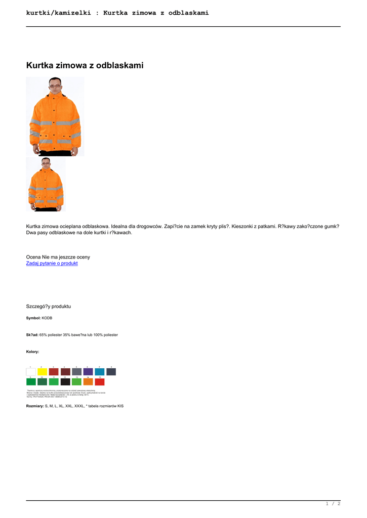 kurtki/kamizelki : Kurtka zimowa z odblaskami Kurtka zimowa z odblaskami Kurtka zimowa ocieplana odblaskowa. Idealna dla drogowców. Zapi?cie na zamek kryty plis?. Kieszonki z patkami. R?kawy zako?czone gumk? Dwa pasy odblaskowe na dole kurtki i r?kawach. Ocena Nie ma jeszcze oceny Zadaj pytanie o produkt Szczegó?y produktu Symbol: KODB Sk?ad: 65% poliester 35% bawe?na lub 100% poliester Kolory: Rozmiary: S, M, L, XL, XXL, XXXL, * tabela rozmiarów KIS 1 / 2 kurtki/kamizelki : Kurtka zimowa z odblaskami Cennik naszych wyrobów otrzymaj? Pa?stwo dzwoni?c pod numer: 17 2270 465, wysy?aj?c e-mail z zapytaniem lub konsultuj?c si? z naszymi doradcami on-line przez komunikator GG. 2 / 2 Powered by TCPDF (www.tcpdf.org)