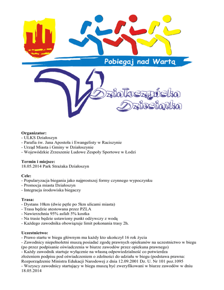 Organizator: - ULKS Działoszyn w. Jana Apostoła i Ewangelisty w Raciszynie - Parafia św. - Urządd Miasta i Gminy w Działoszynie - Wojewódzkie Zrzeszenie Ludowe Zespoły Sportowe w Łodzi Termin i miejsce: 18.05.2014 Park StraŜaka aka Działoszyn Cele: - Popularyzacja biegania jako najprostszej formy czynnego wypoczynku - Promocja miasta Działoszyn - Integracja środowiska biegaczy Trasa: - Dystans 10km (dwie pętle tle po 5km ulicami miasta) - Trasa będzie dzie atestowana przez PZLA - Nawierzchnia 95% asfalt 5% kostka kos - Na trasie będzie dzie ustawiony punkt odŜywczy od z wodą - KaŜdego zawodnika obowiązuje ązuje limit pokonania trasy 2h. Uczestnictwo: - Prawo startu w biegu głównym ma kaŜdy ka kto ukończył 16 rok Ŝycia - Zawodnicy niepełnoletni muszą posiadać posiada zgodę prawnych opiekunów ów na uczestnictwo w biegu (po przez podpisanie oświadczenia wiadczenia w biurze zawodów przez opiekuna prawnego) - KaŜdy zawodnik startuje wyłącznie ącznie na własną własn odpowiedzialność co potwierdza złoŜeniem podpisu pod oświadczeniem wiadczeniem o zdolności zdolno ci do udziału w biegu (podstawa prawna: Rozporządzenie dzenie Ministra Edukacji Narodowej z dnia 12.09.2001 Dz. U. Nr 101 poz.1095 - Wszyscy zawodnicy startujący ący w biegu muszą musz być zweryfikowani w biurze zawodów w dniu 18.05.2014 - Bieg odbędzie się w ograniczonym ruchu ulicznym, kaŜdy zawodnik ma obowiązek zachować szczególną ostroŜność i stosować się do poleceń organizatorów, policji i słuŜb porządkowych - Bieg odbędzie się bez względu na warunki atmosferyczne - Wyniki końcowe dostępne będą na stronie organizatora oraz maratonachpolskich - Zawodnicy wyraŜają zgodę na przetwarzanie ich danych osobowych dla potrzeb wewnętrznych organizatora imprezy oraz na wykorzystanie ich wizerunku w materiałach informacyjnych i reklamowych Zgłoszenia: - Zgłoszenia przyjmowane są poprzez wypełnienie formularza zgłoszeniowego dostępnego na stronie www.maratonypolskie.pl lub na stronie organizatora do dnia 14.05.2014 lub w dniu 18.05.2014 w biurze zawodów. Od dnia 14.05.2014 do 17.05.2014 organizator nie przyjmuje zgłoszeń. - Za zgłoszenie uwaŜa się wypełnienie formularza zgłoszeniowego i uiszczenie opłaty Startowej -Opłata startowa obowiązuje zawodników startujących w biegu głównym oraz uczestników Nordic Walking - KaŜdy z uczestników biegu ma obowiązek sprawdzenia przed biegiem czy jest umieszczony na liście startowej Od zgłaszających się do dnia 14.05.2014r pobiera się opłatę startową w wysokości 30,- zł Opłata startowa dla uczestników w wieku 65 lat i starszych wynosi 15zł – decyduje rok urodzeni Wpłatę naleŜy kierować na konto organizatora: Parafia Katolicka św. Jana Apostoła i Ewangelisty w Raciszynie, Raciszyn ul. Ogrodowa 2a, 98-355 Działoszyn konto 05 9251 0009 0000 0345 2000 0030 Tytuł wpłaty: Działoszyńska Dziesiątka. Przy wpłacie proszę podać nazwisko zawodnika za którego ma wpłynąć zapłata W tytule wpłaty naleŜy wpisać: Opłata startowa oraz imię i nazwisko uczestnika. W przypadku wpłat zbiorowych naleŜy wpisać imiona i nazwiska wszystkich uczestników biegu, za których dokonywana jest opłata startowa Po 14.05.2014 wpłaty będą przyjmowane w dniu zawodów w wysokości 50zł Informacja o uiszczeniu opłaty startowej pojawi się na liście zgłoszeń najpóźniej w ciągu 7 dni od dnia wpłaty Program zawodów: 10.30 Otwarcie biura zawodów- Park StraŜaka 13.00 Biegi dla dzieci i młodzieŜy 14.00 Start Nordic Walking 15.00 Dekoracja zwycięzców w biegach dzieci i młodzieŜy 15.30 Zamknięcie biura zawodów 15.50 Powitanie zawodników na linii startu 16.00 Start biegu głównego 17.15 Dekoracja zwycięzców Nordic Walking 17.30 Wręczenie nagród w klasyfikacji generalnej kobiet i męŜczyzn 18.00 Wręczenie nagród zwycięzcą w pozostałych klasyfikacjach i losowanie upominków Klasyfikacja: Klasyfikacja generalna kobiet i męŜczyzn Kategorie wiekowe kobiet i męŜczyzn MęŜczyźni Kobiety M16 16-19 lat (1998-1995) K16 16-29 lat (1998-1985) M20 20-29 lat (1994-1985) K30 30-39 lat (1984-1975) M30 30-39 lat (1984-1975) K40 40-49 lat (1974-1965) M40 40-49 lat (1974-1965) K50 50 lat i więcej (1964 i starsze) M50 50-59 lat (1964-1955) M60 60-69 lat (1954-1945) M70 70 lat i więcej (1944 i starsi) O przynaleŜności do klasyfikacji wiekowych decyduje rok urodzenia. Nagrody: - Lista nagród biegu głównego: Klasyfikacja generalna MęŜczyźni i kobiety: Nagrody w V Działoszyńskiej Dziesiątce Działoszyńska Dziesiątka dba o ideę zdrowego sportu i uczciwości dlatego, podczas biegu przeprowadzane będą badania antydopingowe. Zapraszamy do rywalizacji Od nagród zostanie potrącony podatek dochodowy - Nagrody pienięŜne otrzymają osoby zajmujące kolejno miejsca od 1 do 6 w klasyfikacji wśród kobiet i męŜczyzn. Zdobywcom nagród pienięŜnych zostanie potrącony podatek dochodowy zgodnie z obowiązującymi przepisami. Po dekoracji zawodnik ma obowiązek złoŜenia podpisu na liście nagród w strefie podium oraz wypełnienia stosownego oświadczenia - W poszczególnych kategoriach wiekowych kobiet i męŜczyzn za miejsca od 1 do 3 zostaną rozdane nagrody rzeczowe - Zawodnicy nagradzani w kategorii generalnej nie będą nagradzani w kategoriach wiekowych -W Klasyfikacji Nordic Walking przewidziane są nagrody rzeczowe bądź pienięŜne - Dodatkowo upominki rzeczowe otrzyma: Najlepszy mieszkaniec Gminy Działoszyn Najlepszy mieszkaniec powiatu Pajęczańskiego Najstarszy i najmłodszy uczestnik biegu - Lista nagród Nordic Walking: Klasyfikacja generalna Kobiet i MęŜczyzn I-III miejsce nagrody rzeczowe Klasyfikacja wiekowa Nordic Walking M. 16-39 lat M. 40 lat i więcej K. 16-39 lat K. 40 i więcej W ramach opłaty startowej uczestnicy biegu głównego oraz Nordic Walking otrzymują numer startowy wraz z agrafkami, poczęstunek po biegu za okazaniem numeru startowego, 