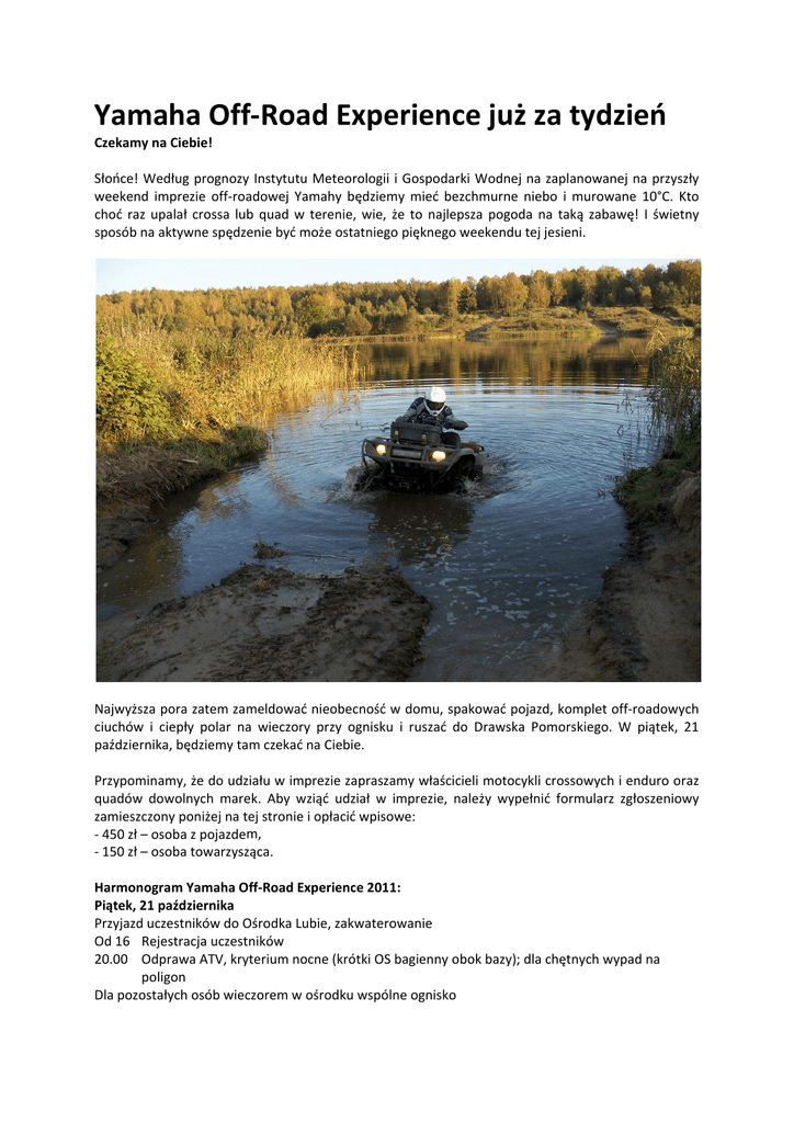 Yamaha Off‐Road Experience już za tydzień Czekamy na Ciebie! Słońce! Według prognozy Instytutu Meteorologii i Gospodarki Wodnej na zaplanowanej na przyszły weekend imprezie off‐roadowej Yamahy będziemy mieć bezchmurne niebo i murowane 10°C. Kto choć raz upalał crossa lub quad w terenie, wie, że to najlepsza pogoda na taką zabawę! I świetny sposób na aktywne spędzenie być może ostatniego pięknego weekendu tej jesieni. Najwyższa pora zatem zameldować nieobecność w domu, spakować pojazd, komplet off‐roadowych ciuchów i ciepły polar na wieczory przy ognisku i ruszać do Drawska Pomorskiego. W piątek, 21 października, będziemy tam czekać na Ciebie. Przypominamy, że do udziału w imprezie zapraszamy właścicieli motocykli crossowych i enduro oraz quadów dowolnych marek. Aby wziąć udział w imprezie, należy wypełnić formularz zgłoszeniowy zamieszczony poniżej na tej stronie i opłacić wpisowe: ‐ 450 zł – osoba z pojazdem, ‐ 150 zł – osoba towarzysząca. Harmonogram Yamaha Off‐Road Experience 2011: Piątek, 21 października Przyjazd uczestników do Ośrodka Lubie, zakwaterowanie Od 16 Rejestracja uczestników 20.00 Odprawa ATV, kryterium nocne (krótki OS bagienny obok bazy); dla chętnych wypad na poligon Dla pozostałych osób wieczorem w ośrodku wspólne ognisko Sobota, 22 października 8.00 Śniadanie 9.00 Odprawa wszystkich uczestników, podział na grupy, wyjazd na trasy 14.00 Lunch w terenie w wyznaczonym miejscu 15.00 Dalszy ciąg jazd w terenie 18.00 Zjazd do bazy w Ośrodku Lubie 19.00 Kolacja grillowa Niedziela, 23 października 9.00 Śniadanie 10.00 Dla chętnych dalszy ciąg jazd w terenie 15.00 Zamknięcie tras, wyjazd do domów
