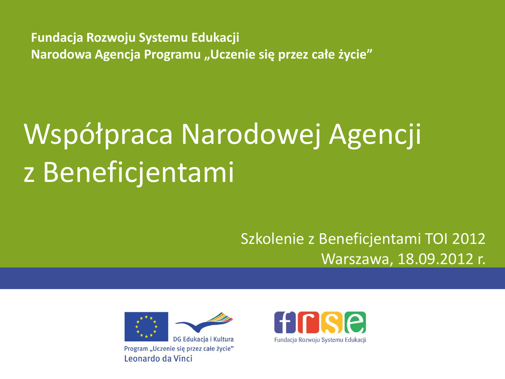 Fundacja Rozwoju Systemu Edukacji Narodowa Agencja Programu „Uczenie się przez całe życie” Współpraca Narodowej Agencji z Beneficjentami Szkolenie z Beneficjentami TOI 2012 Warszawa, 18.09.2012 r. Cykl projektu Ogłoszenie konkursu sierpień 2011 Składanie wniosków 2 lutego 2012 Selekcja luty-sierpień 2012 Ogłoszenie wyników Sierpień 2012 Raport cząstkowy Raport przejściowy październik 2012wrzesień 2013 październik 2012kwiecień 2013 Ocena raportu Raport końcowy październik-grudzień 2013 październik 2012-wrzesień 2014 Rozpoczęcie realizacji projektów* Podpisywanie umów 1 października 2012 wrzesień –grudzień 2012 Ocena raportu październik grudzień 2014 *Daty zostały podane przykładowo dla projektu rozpoczynającego się 1 października 2012 r. PROGRAM LEONARDO DA VINCI Wypłata ostatniej transzy Cykl projektu-start projektu 1 października 2012 – rozpoczęcie realizacji projektu Spotkania partnerskie o ustalenie zasad współpracy podczas pierwszego spotkania; o ustalenie ról partnerów w projekcie. Partnerstwo o upewnienie się, że wszyscy partnerzy rozumieją swoją rolę w projekcie; o podpisanie umów z partnerami (rekomendacja). Zarządzanie projektem o ustalenie zasad podczas pierwszego spotkania, rola narzędzi do zarządzania; o współpraca przy przygotowywaniu formularza kontraktowego, formularza do wizyty monitorującej, raportu przejściowego, cząstkowego i końcowego oraz wniosku o aneks; o zmiany w budżecie – aneksowanie powyżej 10% przesunięć pomiędzy kategoriami (wniosek o aneks, decyzja NA, aneks); o informowanie partnerów nt. informacji zwrotnych z NA (po ocenie raportów), wniosku o aneks, zaleceń po wizycie monitorującej. PROGRAM LEONARDO DA VINCI Współpraca NA-Beneficjent Zarządzanie projektem – współpraca z Narodową Agencją PROGRAM LEONARDO DA VINCI Współpraca NA-Beneficjent 1 października 2012 rozpoczęcie realizacji projektu i współpraca z NA o Opiekun projektu w NA – osoba kontaktowa w instytucji beneficjenta (pytania bieżące, podpisywanie umowy, sprawozdawczość, wnioski o aneks, trudności w projekcie itp.) [email protected] PROGRAM LEONARDO DA VINCI Współpraca NA-Beneficjent 1 października 2012 rozpoczęcie realizacji projektu i współpraca z NA o Szkolenia i spotkania organizowane przez NA o sprawozdanie cząstkowe (jesień 2013) o sprawozdanie końcowe (jesień 2014) przygotowanie raportu – 2 miesiące (raport eForm składany on-line, tabele finansowe G-1-G7 wraz z dokumentacją do podwykonawstwa oraz wyciągi do partnerów, wytyczne do składania raportu, produkty, materiały upowszechniające, sprawozdania ze spotkań itp.) o Wizyty monitorujące m.in. w siedzibie beneficjenta PROGRAM LEONARDO DA VINCI Współpraca NA-Beneficjent 1 października 2012 rozpoczęcie realizacji projektu i współpraca z NA o Spotkania informacyjne i działania promocyjne (konferencje, seminaria, seminaria monitoringu tematycznego, biuletyny LdV, inne publikacje FRSE oraz KE) o Działania upowszechniające i wykorzystujące rezultaty projektu na stronie www.leonardo.org.pl PROGRAM LEONARDO DA VINCI Współpraca NA-Beneficjent 1 października 2012 rozpoczęcie realizacji projektu i współpraca z NA o Działania monitorujące NA: o wizyty monitorujące w trakcie trwania projektu pracowników NA i ekspertów zewnętrznych; o kontrole finansowe w trakcie trwania projektu (on the spot) po zakończeniu projektu desk check, on the spot financial check; o analiza sprawozdań (postępów, cząstkowego i końcowego); o bieżące konsultacje; o spotkania w ramach monitoringu tematycznego (konferencje, seminaria, biuletyny LdV, inne publikacje). PROGRAM LEONARDO DA VINCI Współpraca NA-Beneficjent 1 października 2012 rozpoczęcie realizacji projektu i współpraca z NA Działania monitorujące NA: o wizyty monitorujące w trakcie trwania projektu pracowników NA i ekspertów zewnętrznych Cel wizyty: wsparcie realizacji projektu (ocena postępów realizacji projektu oraz wypracowanych produktów w porównaniu z zatwierdzonym planem pracy; oszacowanie potencjału projektu, jego wpływu na system kształcenia i szkolenia zawodowego, grupy docelowe i możliwości zastosowania w innych sektorach; weryfikacja aktualnego stanu realizacji projektu; zapoznanie się z charakterem i trybem współpracy partnerskiej, podziałem zadań miedzy partnerami oraz ich rezultatami; poznanie ewentualnych problemów oraz ustalenie form pomocy NA w ich rozwiązaniu) - termin wizyty ustalany na ok. 1 miesiąc wcześniej – wysyłane stosowne pismo informujące - przesyłany przez NA formularz do wypełnienia i odesłania na 3 dni przed wizytą - czas trwania wizyty ok. 3-5 godzin - raport po wizycie ok. 1 miesiąca po zakończeniu PROGRAM LEONARDO DA VINCI Współpraca NA-Beneficjent 1 października 2012 rozpoczęcie realizacji projektu i współpraca z NA o Działania monitorujące NA: o kontrole finansowe w trakcie trwania projektu (on the spot) (ustalenie terminu wizyty, pismo informujące o celu, czas trwania ok. 3 godzin, formularz raportu przesłany przed wizytą, raport po wizycie) Cel wizyty: wsparcie realizacji projektu pod kątem finansowym (sprawdzenie realności i poprawności działań wspieranych przez fundusze UE; kontrola poprawności i legalności tych działań) o kontrole finansowe po zakończeniu finansowej analizy podstawowej po zakończeniu projektu: - desk check – wybrani beneficjenci (analiza dokumentacji księgowej po zakończeniu analizy podstawowej, pismo informujące po analizie podstawowej), - on the spot financial check – wybrani beneficjenci (ustalenie terminu wizyty, pismo informujące, raport po zakończeniu) – najczęściej audytor zewnętrzny o PROGRAM LEONARDO DA VINCI Współpraca NA-Beneficjent Mile widziane działania sprzyjające dobrej współpracy: o bieżący kontakt z opiekunem projektu; o aktualizacja danych kontaktowych; o bieżąca wiedza nt. stanu projektu czyli kontakt z partnera
