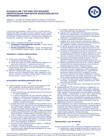 KLAUZULA NR 7 DO OWU PZU WOJAŻER UBEZPIECZENIE NASTĘPSTW NIESZCZĘŚLIWYCH WYPADKÓW (NNW) Załącznik nr 7 do OWU PZU Wojażer ustalonych uchwałą nr UZ/297/2015 Zarządu Powszechnego Zakładu Ubezpieczeń Spółki Akcyjnej z dnia 28 września 2015 r. §1 Z zachowaniem pozostałych niezmienionych niniejszą Klauzulą postanowień OWU oraz pod warunkiem zapłacenia przez ubezpieczającego dodatkowej składki ubezpieczeniowej, ubezpieczenie PZU Wojażer zostaje rozszerzone o ubezpieczenie następstw nieszczęśliwych wypadków, zwane dalej „ubezpieczeniem NNW”. §2 Przez użyte w niniejszej Klauzuli pojęcia rozumie się: 1) następstwa nieszczęśliwego wypadku – trwały uszczerbek na zdrowiu lub śmierć; 2) trwały uszczerbek na zdrowiu – trwałe, nie rokujące poprawy uszkodzenie danego organu, narządu lub układu ciała. PRZEDMIOT I ZAKRES UBEZPIECZENIA §3 1. Przedmiotem ubezpieczenia NNW są: 1) następstwa nieszczęśliwego wypadku; 2) trwały uszczerbek na zdrowiu spowodowany atakiem epilepsji albo omdleniem o nieustalonej przyczynie. 2. PZU SA ponosi odpowiedzialność z tytułu wypadków ubezpieczeniowych, które zaszły w okresie ubezpieczenia podczas podróży ubezpieczonego. 3. Zakresem ubezpieczenia objęty jest trwały uszczerbek na zdrowiu lub śmierć ubezpieczonego, które nastąpiły nie później niż w okresie 12 miesięcy od dnia zajścia wypadku ubezpieczeniowego, o którym mowa w ust. 2. WYŁĄCZENIA ODPOWIEDZIALNOŚCI PZU SA §4 1. Z odpowiedzialności PZU SA wyłączone są następstwa dotyczące wypadków ubezpieczeniowych powstałych: 1) podczas kierowania przez ubezpieczonego pojazdem silnikowym: a) jeżeli ubezpieczony nie posiadał uprawnień do kierowania danym pojazdem, b) w stanie nietrzeźwości lub pod wpływem środków odurzających, substancji psychotropowych lub środków zastępczych w rozumieniu przepisów o przeciwdziałaniu narkomanii, chyba że nie miało to wpływu na zajście wypadku ubezpieczeniowego; 2) podczas kierowania przez ubezpieczonego pojazdem innym niż silnikowy, jeżeli ubezpieczony nie posiadał uprawnień do kierowania danym pojazdem, chyba że nie miało to wpływu na zajście wypadku ubezpieczeniowego; 3) w stanie nietrzeźwości lub pod wpływem środków odurzających, substancji psychotropowych lub środków zastępczych w rozumieniu przepisów o przeciwdziałaniu narkomanii, chyba że nie miało to wpływu na zajście wypadku ubezpieczeniowego; 4) w wyniku zatrucia spowodowanego spożywaniem alkoholu lub używaniem środków odurzających, substancji psychotropowych lub środków zastępczych w rozumieniu przepisów o przeciwdziałaniu narkomanii; 5) w wyniku udziału ubezpieczonego w bójkach, z wyjątkiem działania w obronie koniecznej; 6) w związku z umyślnym popełnieniem albo usiłowaniem popełnienia przez ubezpieczonego przestępstwa lub umyślnego samookaleczenia; 7) w związku z popełnieniem albo usiłowaniem popełnienia przez ubezpieczonego samobójstwa; 8) wskutek utraty przytomności spowodowanej przyczyną chorobową z zastrzeżeniem, że wyłączenie to nie dotyczy utraty przytomności spowodowanej atakiem epilepsji lub omdleniem o nieustalonej przyczynie; 9) w wyniku wykonywania procedur medycznych, bez względu na to, przez kogo były wykonywane, chyba że wykonywanie procedur medycznych dotyczyło bezpośrednich następstw wypadku ubezpieczeniowego; 10) na skutek uprawiania sportów wysokiego ryzyka, chyba że odpowiedzialność PZU SA została rozszerzona w tym zakresie za zapłatą dodatkowej składki ubezpieczeniowej; 11) na skutek rekreacyjnego uprawiania narciarstwa lub snowboardu na oznakowanych trasach zjazdowych, chyba że odpowiedzialność PZU SA została rozszerzona w tym zakresie za zapłatą dodatkowej składki ubezpieczeniowej; 12) na skutek wyczynowego uprawiania sportu, chyba że odpowiedzialność PZU SA została rozszerzona w tym zakresie za zapłatą dodatkowej składki ubezpieczeniowej; 13) podczas wykonywania pracy fizycznej, chyba że odpowiedzialność PZU SA została rozszerzona w tym zakresie za zapłatą dodatkowej składki ubezpieczeniowej; 14) na skutek aktów terroryzmu, działań wojennych, stanu wojennego lub stanu wyjątkowego, które wystąpiły na terytorium państwa znajdującego się w rejonie świata zagrożonym aktami terroryzmu, działaniami wojennymi, stanem wojennym lub stanem wyjątkowym, chyba że odpowiedzialność PZU SA została rozszerzona w tym zakresie za zapłatą dodatkowej składki ubezpieczeniowej; 15) w wyniku czynnego udziału ubezpieczonego w strajkach, rozruchach, zamieszkach, akcjach protestacyjnych, blokadach dróg lub sabotażu; 16) w wyniku skażenia jądrowego, chemicznego lub napromieniowania. 2. Odpowiedzialność PZU SA jest wyłączona za następstwa chorób lub stanów chorobowych, nawet takich, które występują nagle lub zostały ujawnione dopiero w następstwie nieszczęśliwego wypadku lub stanowiących przyczynę zajścia nieszczęśliwego wypadku, z zastrzeżeniem § 3 ust. 1 pkt 2. Jeżeli choroba lub stan chorobowy miał wpływ na zajście nieszczęśliwego wypadku tj. przyczyną nieszczęśliwego wypadku jest zarówno choroba, jak i przyczyna zewnętrzna, odpowiedzialność PZU SA obejmuje trwały uszczerbek na zdrowiu lub śmierć, które są następstwem przyczyny zewnętrznej. 3. Fakt znajdowania się w stanie nietrzeźwości lub fakt znajdowania się pod wpływem środków odurzających, substancji psychotropowych lub środków zastępczych w rozumieniu przepisów o przeciwdziałaniu narkomanii oraz uprawnienia do kierowania pojazdem ocenia się według prawa państwa właściwego dla miejsca zajścia wypadku ubezpieczeniowego. 4. Odpowiedzialność PZU SA nie obejmuje zadośćuczynienia za doznany ból, cierpienia fizyczne i moralne oraz szkód polegających na utracie, uszkodzeniu lub zniszczeniu rzeczy. ŚWIADCZENIA I ICH WYSOKOŚĆ §5 Z tytułu ubezpieczenia NNW przysługują następujące świadczenia: