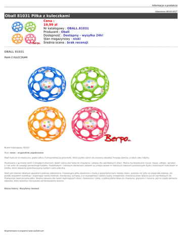 Informacje o produkcie Utworzono 08-03-2017 Oball 81031 Piłka z kuleczkami Cena : 19,99 zł Nr katalogowy : OBALL.81031 Producent : Oball Dostępność : Dostępny - wysyłka 24h! Stan magazynowy : niski Średnia ocena : brak recenzji OBALL 81031 PIŁKA Z KULECZKAMI Numer katalogowy: 81031 Stan: nowe - oryginalnie zapakowane Oball kuleczki to elastyczna, giętka piłka z funkcjonalnością grzechotki, która szybko stanie się ulubioną zabawką Twojego dziecka, a także całej rodziny. Zbudowana z gumowej ramki z okrągłymi otworami, dzięki czemu jest łatwa do chwytania i zabawy dla najmłodszych dzieci. Można nią bezpiecznie rzucać, kopać, odbijać, zgniatać, a i tak wróci do swojego pierwotnego kształtu. Dodatkowym i ciekawym elementem zabawki są umiejscowione w niektórych otworach przeźroczyste dyski z kolorowymi kuleczkami w środku, które zabawnie grzechoczą przy każdym ruchu piłeczką. Oball jest również idealnym gryzakiem podczas ząbkowania. Innowacyjna piłka stworzona z myślą o wszechstronnym rozwoju dzieci, pozwala nie tylko na wspaniałą zabawę, ale przede wszystkim kształtuje i wspomaga rozwój motoryki, koordynacji ruchowej, a w szczególności ułatwia naukę umiejętności chwytania przez dziecko już od najmłodszych lat. Praktycznie niezniszczalna piłka. Idealna zabawka dla nawet najmniejszych dzieci, bezpieczna i lekka, a jednocześnie łatwa do chwytania, gryzienia i rzucania. Jest to często pierwsza zabawka, która wywołuje rzeczywiste zainteresowanie dziecka Różne kolory. Wysyłamy losowo! Wygenerowano w programie www.oscGold.com Dostępność w salonach: Ilość: Sklep - Złotniki: 1 Sklep - zlikwidowany: 0 Sklep - Szczepankowo: 0 Dostępne opcje Oball 81031 Piłka z kuleczkami » Wiek: 0 - 12 m-cy, 12 - 24 m-cy.