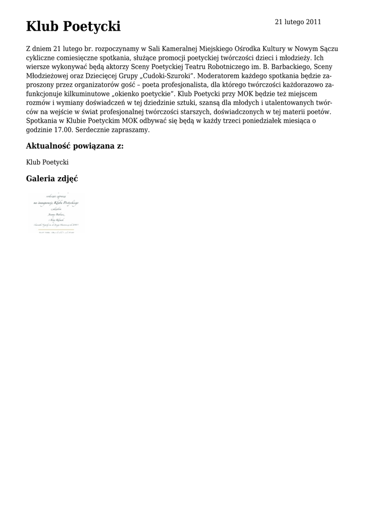 Klub Poetycki 21 lutego 2011 Z dniem 21 lutego br. rozpoczynamy w Sali Kameralnej Miejskiego Ośrodka Kultury w Nowym Sączu cykliczne comiesięczne spotkania, służące promocji poetyckiej twórczości dzieci i młodzieży. Ich wiersze wykonywać będą aktorzy Sceny Poetyckiej Teatru Robotniczego im. B. Barbackiego, Sceny Młodzieżowej oraz Dziecięcej Grupy „Cudoki-Szuroki”. Moderatorem każdego spotkania będzie zaproszony przez organizatorów gość – poeta profesjonalista, dla którego twórczości każdorazowo zafunkcjonuje kilkuminutowe „okienko poetyckie”. Klub Poetycki przy MOK będzie też miejscem rozmów i wymiany doświadczeń w tej dziedzinie sztuki, szansą dla młodych i utalentowanych twórców na wejście w świat profesjonalnej twórczości starszych, doświadczonych w tej materii poetów. Spotkania w Klubie Poetyckim MOK odbywać się będą w każdy trzeci poniedziałek miesiąca o godzinie 17.00. Serdecznie zapraszamy. Aktualność powiązana z: Klub Poetycki Galeria zdjęć