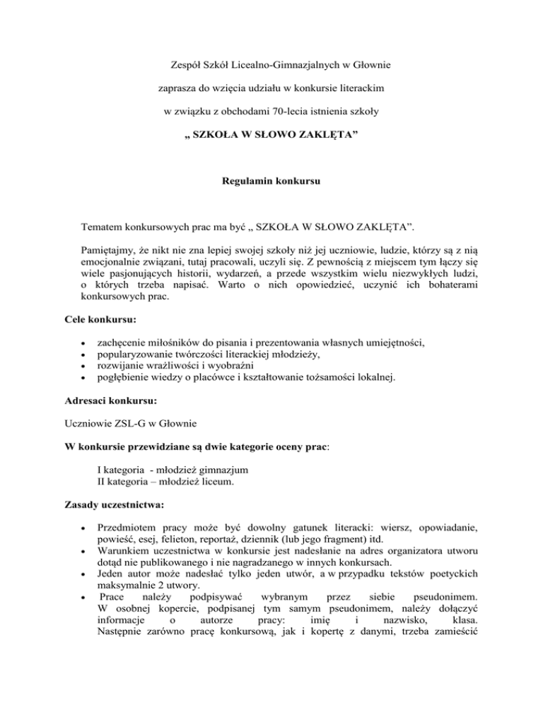 Zespół Szkół Licealno-Gimnazjalnych w Głownie zaprasza do wzięcia udziału w konkursie literackim w związku z obchodami 70-lecia istnienia szkoły „ SZKOŁA W SŁOWO ZAKLĘTA” Regulamin konkursu Tematem konkursowych prac ma być „ SZKOŁA W SŁOWO ZAKLĘTA”. Pamiętajmy, że nikt nie zna lepiej swojej szkoły niż jej uczniowie, ludzie, którzy są z nią emocjonalnie związani, tutaj pracowali, uczyli się. Z pewnością z miejscem tym łączy się wiele pasjonujących historii, wydarzeń, a przede wszystkim wielu niezwykłych ludzi, o których trzeba napisać. Warto o nich opowiedzieć, uczynić ich bohaterami konkursowych prac. Cele konkursu: zachęcenie miłośników do pisania i prezentowania własnych umiejętności, popularyzowanie twórczości literackiej młodzieży, rozwijanie wrażliwości i wyobraźni pogłębienie wiedzy o placówce i kształtowanie tożsamości lokalnej. Adresaci konkursu: Uczniowie ZSL-G w Głownie W konkursie przewidziane są dwie kategorie oceny prac: I kategoria - młodzież gimnazjum II kategoria – młodzież liceum. Zasady uczestnictwa: Przedmiotem pracy może być dowolny gatunek literacki: wiersz, opowiadanie, powieść, esej, felieton, reportaż, dziennik (lub jego fragment) itd. Warunkiem uczestnictwa w konkursie jest nadesłanie na adres organizatora utworu dotąd nie publikowanego i nie nagradzanego w innych konkursach. Jeden autor może nadesłać tylko jeden utwór, a w przypadku tekstów poetyckich maksymalnie 2 utwory. Prace należy podpisywać wybranym przez siebie pseudonimem. W osobnej kopercie, podpisanej tym samym pseudonimem, należy dołączyć informacje o autorze pracy: imię i nazwisko, klasa. Następnie zarówno pracę konkursową, jak i kopertę z danymi, trzeba zamieścić w większej kopercie i oddać polonistce, Matyldzie Muszyńskiej (sala nr 14). Konieczne jest też wysłanie wersji elektronicznej pracy na adres: [email protected] Praca nie może zawierać żadnej informacji identyfikującej jej autora. Obowiązuje czcionka Times New Roman 14, interlinia 1,5, numerownie stron. Termin składania prac: Prace należy składać do 25 maja 2015r. z dopiskiem „konkurs literacki”. Kryteria oceniania: twórczy charakter utworu, poprawność stylistyczna i językowa, poziom literacki pracy, samodzielność i oryginalność, ogólna estetyka pracy. Konkurs zostanie rozstrzygnięty 26 czerwca 2015 r. w czasie uroczystości zakończenia rocznych zajęć dydaktyczno-wychowawczych. Informacja o wynikach zostanie zamieszczona na stronie internetowej szkoły. Dla zwycięzców przewidziano atrakcyjne nagrody, dla pozostałych uczestników dyplomy. Nagrodzone prace bądź ich fragmenty zostaną zaprezentowane w czasie Absolwentów 26 września 2015r. Koordynatorem konkursu jest mgr Matylda Muszyńska. Zjazdu