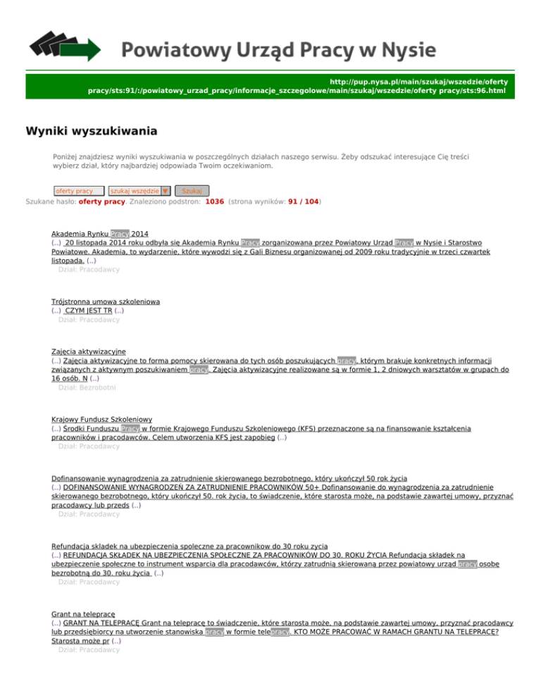 http://pup.nysa.pl/main/szukaj/wszedzie/oferty pracy/sts:91/:/powiatowy_urzad_pracy/informacje_szczegolowe/main/szukaj/wszedzie/oferty pracy/sts:96.html Wyniki wyszukiwania Poniżej znajdziesz wyniki wyszukiwania w poszczególnych działach naszego serwisu. Żeby odszukać interesujące Cię treści wybierz dział, który najbardziej odpowiada Twoim oczekiwaniom. oferty pracy szukaj wszędzie ▼ Szukaj Szukane hasło: oferty pracy. Znaleziono podstron: 1036 (strona wyników: 91 / 104) 901 Akademia Rynku Pracy 2014 (..) 20 listopada 2014 roku odbyła się Akademia Rynku Pracy zorganizowana przez Powiatowy Urząd Pracy w Nysie i Starostwo Powiatowe. Akademia, to wydarzenie, które wywodzi się z Gali Biznesu organizowanej od 2009 roku tradycyjnie w trzeci czwartek listopada. (..) Dział: Pracodawcy 902 Trójstronna umowa szkoleniowa (..) CZYM JEST TR (..) Dział: Pracodawcy 903 Zajęcia aktywizacyjne (..) Zajęcia aktywizacyjne to forma pomocy skierowana do tych osób poszukujących pracy, którym brakuje konkretnych informacji związanych z aktywnym poszukiwaniem pracy. Zajęcia aktywizacyjne realizowane są w formie 1, 2 dniowych warsztatów w grupach do 16 osób. N (..) Dział: Bezrobotni 904 Krajowy Fundusz Szkoleniowy (..) Środki Funduszu Pracy w formie Krajowego Funduszu Szkoleniowego (KFS) przeznaczone są na finansowanie kształcenia pracowników i pracodawców. Celem utworzenia KFS jest zapobieg (..) Dział: Pracodawcy 905 Dofinansowanie wynagrodzenia za zatrudnienie skierowanego bezrobotnego, który ukończył 50 rok życia (..) DOFINANSOWANIE WYNAGRODZEŃ ZA ZATRUDNIENIE PRACOWNIKÓW 50+ Dofinansowanie do wynagrodzenia za zatrudnienie skierowanego bezrobotnego, który ukończył 50. rok życia, to świadczenie, które starosta może, na podstawie zawartej umowy, przyznać pracodawcy lub przeds (..) Dział: Pracodawcy 906 Refundacja skladek na ubezpieczenia spoleczne za pracownikow do 30 roku zycia (..) REFUNDACJA SKŁADEK NA UBEZPIECZENIA SPOŁECZNE ZA PRACOWNIKÓW DO 30. ROKU ŻYCIA Refundacja składek na ubezpieczenie społeczne to instrument wsparcia dla pracodawców, którzy zatrudnią skierowaną przez powiatowy urząd pracy osobę bezrobotną do 30. roku życia (..) Dział: Pracodawcy 907 Grant na telepracę (..) GRANT NA TELEPRACĘ Grant na telepracę to świadczenie, które starosta może, na podstawie zawartej umowy, przyznać pracodawcy lub przedsiębiorcy na utworzenie stanowiska pracy w formie telepracy. KTO MOŻE PRACOWAĆ W RAMACH GRANTU NA TELEPRACĘ? Starosta może pr (..) Dział: Pracodawcy 908 Zaświadczenie (restrukturyzacja zakładu pracy) (..) (..) Dział: Pliki do pobrania 909 Akademia Rynku Pracy 2013 (..) W dniu 25 listopada 2013 roku w Nyskim Domu Kultury odbyła się Akademia Rynku Pracy.W trakcie Akademii został uruchomiony program "Karta Młodego Przedsiębiorcy" oraz wyłoniona została firma roku 2013. Akademia Rynku Pracy - forum dialogu przedsiębiorcy (..) Dział: Pracodawcy 910 Zaświadczenie (likwidacja lub upadłość zakładu pracy) (..) (..) Dział: Pliki do pobrania ● ● ● ● ● ● ● ● ● ● ● ● ● ● ● « Pierwsza < Poprzednia 86 87 88 89 90 91 92 93 94 95 96 Następna > Ostatnia »