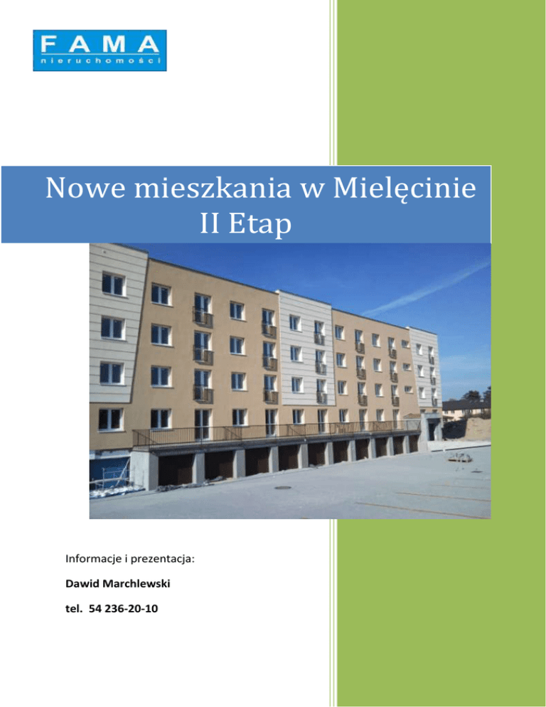 Nowe mieszkania w Mielęcinie II Etap Informacje i prezentacja: Dawid Marchlewski tel. 54 236-20-10 Dostępne lokale: Kondygnacja Nr lokalu Powierzchnia (m2) Cena parter 1, 2, 3, 4 31,33 90.000 zł I piętro 14, 17 31,33 87.000 zł II piętro 30 31,33 85.000 zł III piętro 41 31,33 85.000 zł 2 Parter: 1 piętro: 3 2 piętro: 3 piętro: 4 5 Informacje dodatkowe: Forma własności: pełna własnośd (księga wieczysta na lokal + udział w gruncie) Termin oddanie bud. do użytku: budynek oddany do użytku Ogrzewanie: własna kotłownia gazowa (w mieszkaniach liczniki, nie podzielniki ciepła) Forma zarządzania: wspólnota mieszkaniowa Standard wykooczenia: drzwi wejściowe, okna PCV, grzejniki w pokojach + grzejnik łazienkowy, gładź gipsowa, do każdego z mieszkao piwnica Instalacje: nowa instalacja elektryczna z rozprowadzonymi przewodami, przełącznikami, gniazdami, nowa instalacja wod-kan., wentylacja, nowa instalacja CO Media: CO z sieci, ciepła woda z sieci, prąd, TV kablowa (SATFILM) Parking: miejsca parkingowe przed budynkiem (dodatkowo 3.850 zł), ewentualnie garaż (30.000 zł). Okolica: las, budynki mieszkalne, komunikacja miejska w odległości ok. 350 m Przy nabyciu w/w mieszkao Kupujący zwolniony jest z podatku PCC (2 %) i prowizji Agencji. Informacje i prezentacja: Dawid Marchlewski Agencja Nieruchomości "FAMA" tel. 54 236-20-10 [email protected] Biuro Sprzedaży: Ul. Toruoska 45 87-800 Włocławek www.wloclawek.org 6