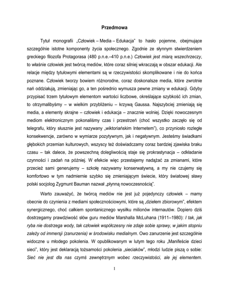 Przedmowa Tytuł monografii „Człowiek – Media – Edukacja” to hasło pojemne, obejmujące szczególnie istotne komponenty życia społecznego. Zgodnie ze słynnym stwierdzeniem greckiego filozofa Protagorasa (480 p.n.e.–410 p.n.e.) Człowiek jest miarą wszechrzeczy, to właśnie człowiek jest twórcą mediów, które coraz silniej wkraczają w obszar edukacji. Ale relacje między tytułowymi elementami są w rzeczywistości skomplikowane i nie do końca poznane. Człowiek tworzy bowiem różnorodne, coraz doskonalsze media, które zwrotnie nań oddziałują, zmieniając go, a ten pośrednio wymusza pewne zmiany w edukacji. Gdyby przypisać trzem tytułowym elementom wartości liczbowe, określające szybkość ich zmian, to otrzymalibyśmy – w wielkim przybliżeniu – krzywą Gaussa. Najszybciej zmieniają się media, a elementy skrajne – człowiek i edukacja – znacznie wolniej. Dzięki nowoczesnym mediom elektronicznym pokonaliśmy czas i przestrzeń (choć wszystko zaczęło się od telegrafu, który słusznie jest nazywany „wiktoriańskim Internetem”), co przyniosło rozległe konsekwencje, zarówno w wymiarze pozytywnym, jak i negatywnym. Jesteśmy świadkami głębokich przemian kulturowych, wszyscy też doświadczamy coraz bardziej zjawiska braku czasu – tak dalece, że powszechną dolegliwością staje się prokrastynacja – odkładanie czynności i zadań na później. W efekcie więc przestajemy nadążać za zmianami, które przecież sami generujemy – szkołę nazywamy konserwatywną, a my nie czujemy się komfortowo w tym nadmiernie szybko się zmieniającym świecie, który światowej sławy polski socjolog Zygmunt Bauman nazwał „płynną nowoczesnością”. Warto zauważyć, że twórcą mediów nie jest już pojedynczy człowiek – mamy obecnie do czynienia z mediami społecznościowymi, które są „dziełem zbiorowym”, efektem synergicznego, choć całkiem spontanicznego wysiłku milionów internautów. Dopiero dziś dostrzegamy prawdziwość słów guru mediów Marshalla McLuhana (1911–1980): I tak, jak ryba nie dostrzega wody, tak człowiek współczesny nie zdaje sobie sprawy, w jakim stopniu zależy od immersji (zanurzenia) w środowisku medialnym. Owo zanurzenie jest szczególnie widoczne u młodego pokolenia. W opublikowanym w lutym tego roku „Manifeście dzieci sieci”, który jest deklaracją tożsamości pokolenia „sieciaków”, młodzi ludzie piszą o sobie: Sieć nie jest dla nas czymś zewnętrznym wobec rzeczywistości, ale jej elementem. 1 My nie korzystamy z sieci, my w niej i z nią żyjemy. Podkreślają tym samym, że nie istnieje już dla nich granica między światem realnym i wirtualnym, że ich realna przestrzeń znajduje się w wirtualnym świecie. Te słowa z kolei uświadamiają nam niezwykłą trafność innej refleksji M. McLuhana: Nowe media nie są pomostem między człowiekiem a naturą, one są naturą. Niewątpliwie ta myśl nie mogła być zrozumiała w czasach współczesnych McLuhanowi, dziś wydaje się nam oczywista, wręcz banalna. Autorzy artykułów tworzących monografię poszukują w swoich tekstach nowego modelu edukacji – adekwatnego dla dzieci sieci. Poszukujemy wspólnie takiego modelu, który – z jednej strony – pozwoli uczniom szeroko korzystać z ich ulubionych narzędzi technologii informacyjnej, z drugiej – umożliwi odkrycie i pełne uwolnienie potencjału intelektualnego oraz kreatywnego tkwiącego w każdym człowieku. Poszukujemy szkoły na miarę potrzeb, możliwości, oczekiwań i marzeń młodego pokolenia. Pamiętać jednak musimy, że szkoła to nie tylko nowe technologie – to przede wszystkim uczeń i jego nauczyciel, to także decydenci. Na drodze ku lepszej edukacji tych dwóch ostatnich grup trzeba się obawiać najbardziej, oni bowiem zwykle „wiedzą lepiej”, bo przecież też kiedyś sami chodzili do szkoły. Tyle tylko, że były to inne czasy, inne technologie, a przede wszystkim inni uczniowie. Epoka Web 2.0 i mediów społecznościowych rozbudziła w uczniach, przynajmniej w znaczącej ich części, aspiracje współtworzenia i współdecydowania o kształcie szkoły, do której uczęszczają. Uczniowie pragną szkoły ciekawej, inspirującej, która nie będzie ich zmuszać do nudnego uczenia się nikomu niepotrzebnych treści, lecz pozwoli odkrywać to, co prawdziwie pasjonujące i przydatne. Myśląc o świecie mediów i uczniach w nim zanurzonych, pamiętajmy jednak, że potrzebują oni holistycznego rozwoju. Niech więc naszą ofertą dla nich będzie też górska bądź rowerowa wycieczka, pływalnia, zwiedzanie pięknych zakątków naszego kraju i świata. Zwiedzanie jak najbardziej realne, a nie z użyciem Google Maps i Wikipedii. Janusz Morbitzer 2