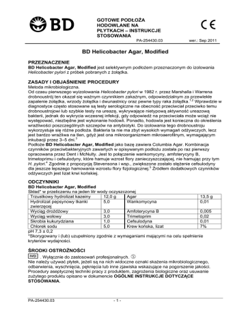 GOTOWE PODŁOŻA HODOWLANE NA PŁYTKACH – INSTRUKCJE STOSOWANIA PA-254430.03 wer.: Sep 2011 BD Helicobacter Agar, Modified PRZEZNACZENIE BD Helicobacter Agar, Modified jest selektywnym podłożem przeznaczonym do izolowania Helicobacter pylori z próbek pobranych z żołądka. ZASADY I OBJAŚNIENIE PROCEDURY Metoda mikrobiologiczna. Od czasu pierwszego wyizolowania Helicobacter pylori w 1982 r. przez Marshalla i Warrena drobnoustrój ten okazał się ważnym czynnikiem zakaźnym, odpowiedzialnym za przewlekłe zapalenie żołądka, wrzody żołądka i dwunastnicy oraz pewne typy raka żołądka.1,2 Wprawdzie w diagnostyce często stosowane są testy serologiczne na obecność przeciwciał przeciwko temu drobnoustrojowi lub szybkie testy na ureazę, wykrywające nietypową aktywność ureazową bakterii, jednak do wykrycia wczesnej infekcji, gdy odpowiedź na przeciwciała może wciąż nie występować, niezbędne jest wykonanie hodowli. Ponadto, hodowla jest konieczna do określenia wrażliwości poszczególnych szczepów na antybiotyki. Do izolowania tego drobnoustroju wykorzystuje się różne podłoża. Bakteria ta nie ma zbyt wysokich wymagań odżywczych, lecz jest bardzo wrażliwa na tlen, gdyż jest ona mikroorganizmem mikroaerofilnym, wymagającym inkubacji przez 3–5 dni.3 Podłoże BD Helicobacter Agar, Modified jako bazę zawiera Columbia Agar. Kombinacja czynników przeciwbakteryjnych zawartych w opisywanym podłożu została po raz pierwszy opracowana przez Dent i McNulty. Jest to połączenie wankomycyny, amfoterycyny B, trimetoprimu i cefsulodyny, które hamuje wzrost flory zanieczyszczającej, nie hamując przy tym H. pylori.4 Zgodnie z propozycją Stevensona i wsp., zwiększone zostało stężenie cefsulodyny dla jeszcze lepszego hamowania wzrostu flory fizjologicznej.5 Źródłem dodatkowych czynników odżywczych jest lizat krwi końskiej. ODCZYNNIKI BD Helicobacter Agar, Modified Skład* w przeliczeniu na jeden litr wody oczyszczonej Trzustkowy hydrolizat kazeiny 12,0 g Agar 13,5 g Hydrolizat pepsynowy tkanki 5,0 Wankomycyna 0,01 zwierzęcej Wyciąg drożdżowy 3,0 Amfoterycyna B 0,005 Wyciąg wołowy 3,0 Trimetoprim 0,02 Skrobia kukurydziana 1,0 Cefsulodyna 0,01 Chlorek sodu 5,0 Krew końska, lizat 7% pH 7,3 ± 0,2 *Skorygowany i (lub) uzupełniony zgodnie z wymaganiami mającymi na celu spełnienie kryteriów wydajności. ŚRODKI OSTROŻNOŚCI . Wyłącznie do zastosowań profesjonalnych. Nie należy używać płytek, jeżeli są na nich widoczne oznaki skażenia mikrobiologicznego, odbarwienia, wyschnięcia, pęknięcia lub inne zjawiska wskazujące na pogorszenie jakości. Procedury aseptycznej techniki pracy z produktem, zagrożenia biologiczne oraz usuwanie zużytego produktu opisano w dokumencie OGÓLNE INSTRUKCJE DOTYCZĄCE STOSOWANIA. PA-254430.03 -1- WARUNKI I OKRES PRZECHOWYWANIA Dostarczone płytki należy umieścić w zacienionym pomieszczeniu, w temperaturze od 2 do 8°C, w oryginalnych opakowaniach w formie rękawa, aż do momentu użycia. Nie zamrażać i nie przegrzewać. Płytki należy wykorzystać do posiewu bakterii przed upływem daty ważności (zobacz etykietę na opakowaniu) i inkubować zgodnie z zalecanymi czasami inkubacji. Płytki z otwartego opakowania zawierającego 10 płytek mogą zostać użyte w ciągu tygodnia pod warunkiem przechowywania w czystym miejscu, w temperaturze od 2 do 8°C. KONTROLA JAKOŚCI PRZEZ UŻYTKOWNIKA Podłoża zaszczepia się reprezentatywnymi próbkami wymienionych szczepów (szczegółowe informacje – zobacz dokument OGÓLNE INSTRUKCJE DOTYCZĄCE STOSOWANIA). Inkubować w temperaturze 35–37°C w atmosferze tlenowej, np. w pojemniku BD GasPak z atmosferą wytworzoną przez system BD CampyPak (z katalizatorem) lub system BD CampyPak Plus, przez 3 do 5 dni. Szczepy bakteryjne Streptococcus pyogenes ATCC 43504 Candida albicans ATCC 10231 Escherichia coli ATCC 25922 Proteus mirabilis ATCC 43071 Staphylococcus aureus ATCC 29213 Bez posiewu Wzrost Wzrost dobry lub bardzo dobry; kolonie od bardzo małych do średnich, przejrzyste Częściowe lub całkowite zahamowanie wzrostu Częściowe lub całkowite zahamowanie wzrostu Częściowe lub całkowite zahamowanie wzrostu; zahamowanie stopniowego wzrostu kolonii Całkowite zahamowanie wzrostu Kolor czerwieni burgundzkiej, nieznacznie przejrzyste PROCEDURA Dostarczane materiały Podłoże BD Helicobacter Agar, Modified (płytki Stacker o śr. 90 mm). Sprawdzane pod kątem obecności mikroorganizmów. Materiały niedostarczane Pomocnicze pożywki hodowlane, odczynniki i wyposażenie laboratoryjne zgodnie z wymaganiami. Rodzaje, pobieranie i transport próbek Od pacjenta należy pobrać kilka świeżych próbek z biopsji żołądka, co najmniej jedną z jamy odźwiernikowej i jedną z trzonu. Próbki umieścić w odpowiednim podłożu transportowym. Sok żołądkowy nie stanowi odpowiedniej próbki. Jeśli istnieje możliwość niezwłocznego przetransportowania próbki i jej wykorzystania, wówczas można użyć roztworu fizjologicznego. W przypadku przewidywanego opóźnienia należy użyć podłoża transportowego takiego jak podłoże Stuarta lub podłoże BD Port-A-Cul. Do czasu rozpoczęcia pracy podłoże z próbką można przechowywać w temperaturze 4–8°C, jednak nie dłużej niż 24 godziny. Badana bakteria jest niezwykle wrażliwa na wysychanie i ekspozycję na tlen.6 Wykazano, że dodanie glicerolu do podłoża transportowego poprawia przeżywalność bakterii, o ile są one przechowywane w warunkach chłodniczych (np. w temperaturze +4°C) lub zamrożone.7 Procedura testowa Powierzchnia podłoża agarowego powinna być gładka i wilgotna, lecz bez nadmiernej wilgoci. Nie należy używać płytek wykazujących oznaki wysychania, takie jak obkurczanie się podłoża. Podczas pracy z próbkami i hodowlami należy unikać przedłużonej ekspozycji na powietrze, gdyż badany drobnoustrój jest bardzo wrażliwy na tlen.6 Przed umieszczeniem próbek biopsyj