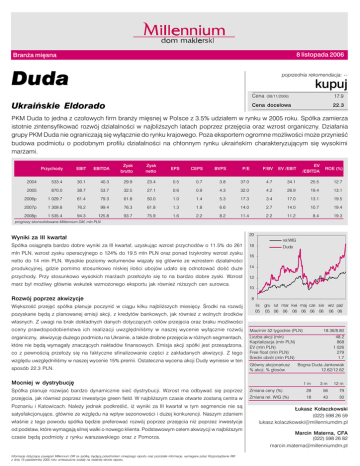 8 listopada 2006 Branża mięsna Duda poprzednia rekomendacja: -- kupuj Cena Ukraińskie Eldorado 17.9 (08/11/2006) Cena docelowa 22.3 PKM Duda to jedna z czołowych firm branży mięsnej w Polsce z 3.5% udziałem w rynku w 2005 roku. Spółka zamierza istotnie zintensyfikować rozwój działalności w najbliższych latach poprzez przejęcia oraz wzrost organiczny. Działania grupy PKM Duda nie ograniczają się wyłącznie do rynku krajowego. Poza eksportem ogromne możliwości może przynieść budowa podmiotu o podobnym profilu działalności na chłonnym rynku ukraińskim charakteryzującym się wysokimi marżami. Przychody EBIT EBITDA Zysk brutto Zysk netto EPS CEPS BVPS P/E P/BV EV /EBIT EV /EBITDA ROE (%) 2004 533.4 30.1 40.3 29.9 23.4 0.5 0.7 3.8 37.0 4.7 34.1 25.5 12.7 2005 870.0 38.7 53.7 32.5 27.1 0.6 0.9 4.3 32.0 4.2 26.9 19.4 13.1 2006p 1 029.7 61.4 79.3 61.8 50.0 1.0 1.4 5.3 17.3 3.4 17.0 13.1 19.5 2007p 1 309.8 76.2 99.4 76.3 61.8 1.3 1.8 6.6 14.0 2.7 14.0 10.7 19.4 2008p 1 535.4 94.3 125.8 93.7 75.9 1.6 2.2 8.2 11.4 2.2 11.2 8.4 19.3 prognozy skonsolidowane Millennium DM, mln PLN Wyniki za III kwartał Spółka osiągnęła bardzo dobre wyniki za III kwartał, uzyskując wzrost przychodów o 11.5% do 261 mln PLN, wzrost zysku operacyjnego o 124% do 19.5 mln PLN oraz ponad trzykrotny wzrost zysku 20 rel.WIG 18 Duda 16 netto do 14 mln PLN. Wysokie poziomy wolumenów wiązały się głównie ze wzrostem działalności produkcyjnej, gdzie pomimo stosunkowo niskiej ilości ubojów udało się odnotować dość duże 14 przychody. Przy stosunkowo wysokich marżach przełożyło się to na bardzo dobre zyski. Wzrost 12 marż był możliwy głównie wskutek wzmożonego eksportu jak również niższych cen surowca. Rozwój poprzez akwizycje Większość przejęć spółka planuje poczynić w ciągu kilku najbliższych miesięcy. Środki na rozwój pozyskane będą z planowanej emisji akcji, z kredytów bankowych, jak również z wolnych środków 10 8 lis gru lut mar kwi maj cze sie wrz pa 05 05 06 06 06 06 06 06 06 06 własnych. Z uwagi na brak dokładnych danych dotyczących celów przejęcia oraz braku możliwości oceny prawdopodobieństwa ich realizacji uwzględniliśmy w naszej wycenie wyłącznie rozwój Max/min 52 tygodnie (PLN) organiczny, akwizycję dużego podmiotu na Ukrainie, a także drobne przejęcia w różnych segmentach, Liczba akcji (mln) Kapitalizacja (mln PLN) EV (mln PLN) Free float (mln PLN) redni obrót (mln PLN) które nie będą wymagały znaczących nakładów finansowych. Emisja akcji spółki jest przesądzona, co z pewnością przełoży się na faktyczne sfinalizowanie części z zakładanych akwizycji. Z tego względu uwzględniliśmy w naszej wycenie 15% premii. Ostateczna wycena akcji Dudy wyniesie w ten sposób 22.3 PLN. G³ówny akcjonariusz % akcji, % g³osów Mocniej w dystrybucję 18.36/8.80 48.2 868 1 026 279 1.7 Bogna Duda Jankowiak 12.62/12.62 1m 3m 12 m Spółka planuje rozwijać bardzo dynamicznie sieć dystrybucji. Wzrost ma odbywać się poprzez Zmiana ceny (%) 28 56 79 przejęcia, jak również poprzez inwestycje green field. W najbliższym czasie otwarte zostaną centra w Zmiana rel. WIG (%) 18 43 30 Poznaniu i Katowicach. Należy jednak podkreślić, iż wyniki za III kwartał w tym segmencie nie są satysfakcjonujące, głównie ze względu na wpływ sezonowości i dużej konkurencji. Naszym zdaniem właśnie z tego powodu spółka będzie preferować rozwój poprzez przejęcia niż poprzez inwestycje od podstaw, które wymagają silnej walki o nowego klienta. Podstawowym celem akwizycji w najbliższym czasie będą podmioty z rynku warszawskiego oraz z Pomorza. Łukasz Kołaczkowski (022) 598 26 59 [email protected] Marcin Materna, CFA (022) 598 26 82 [email protected] Informacje dotyczące powiązań Millennium DM ze spółką, będącą przedmiotem niniejszego raportu oraz pozostałe informacje, wymagane przez Rozporządzenie RM z dnia 19 października 2005 roku umieszczone zostały na ostatniej stronie raportu. Podsumowanie inwestycyjne .................................................................................... 3 Wyniki za III kwartał ................................................................................................... 5 Wycena ........................................................................................................................ 6 Wycena metodą DCF ............................................................................................................ 7 Wycena porównawcza do spółek zagranicznych .............................................................. 8 PKM DUDA .................................................................................................................. 9 Struktura grupy ...................................................................................................................... 9 Historia spółki ........................................................................................................................ 9 Akcjonariat ........................................................................................................................... 10 Dostawcy ............................................................................................................................. 10 Odbiorcy .............................................................................................................................. 11 Rynek i otoczenie konkurencyjne .......................................................................... 12 Rozwój linii biznesowych ......................................................................................... 13 Ekspansja na Ukrainie ............................................................................................. 15 Emisja akcji serii G ................................................................................................... 15 Prognoza wyników finansowych .......................
