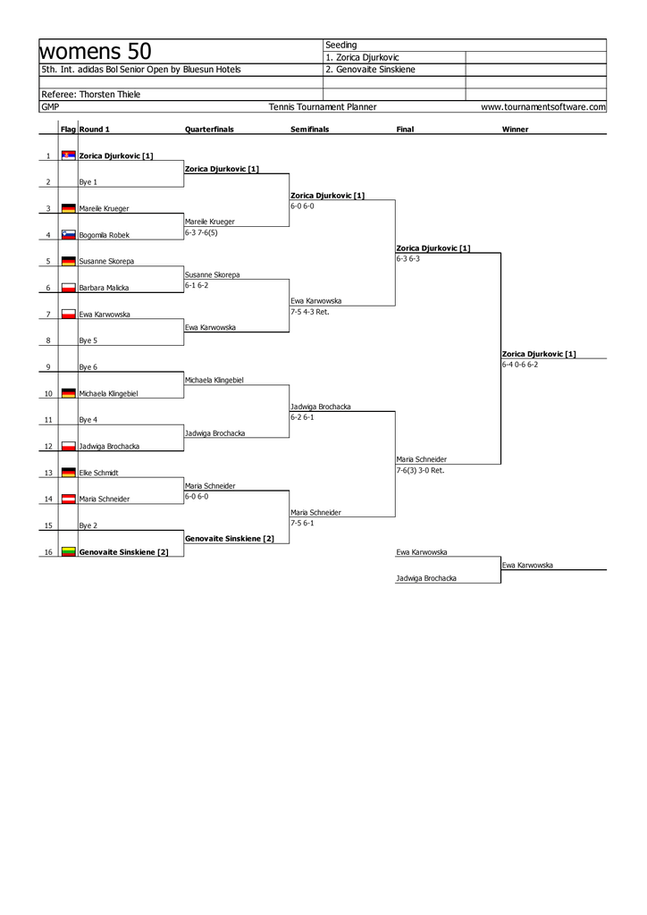 Seeding 1. Zorica Djurkovic 2. Genovaite Sinskiene womens 50 5th. Int. adidas Bol Senior Open by Bluesun Hotels Referee: Thorsten Thiele GMP Flag Round 1 1 Zorica Djurkovic [1] 2 Bye 1 3 Mareile Krueger 4 Bogomila Robek 5 Susanne Skorepa 6 Barbara Malicka 7 Ewa Karwowska Tennis Tournament Planner Quarterfinals Semifinals www.tournamentsoftware.com Final Winner Zorica Djurkovic [1] Zorica Djurkovic [1] 6-0 6-0 Mareile Krueger 6-3 7-6(5) Zorica Djurkovic [1] 6-3 6-3 Susanne Skorepa 6-1 6-2 Ewa Karwowska 7-5 4-3 Ret. Ewa Karwowska 8 Bye 5 9 Bye 6 10 Michaela Klingebiel 11 Bye 4 12 Jadwiga Brochacka 13 Elke Schmidt 14 Maria Schneider 15 Bye 2 16 Genovaite Sinskiene [2] Zorica Djurkovic [1] 6-4 0-6 6-2 Michaela Klingebiel Jadwiga Brochacka 6-2 6-1 Jadwiga Brochacka Maria Schneider 7-6(3) 3-0 Ret. Maria Schneider 6-0 6-0 Maria Schneider 7-5 6-1 Genovaite Sinskiene [2] Ewa Karwowska Ewa Karwowska Jadwiga Brochacka