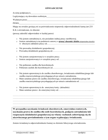 OŚWIADCZENIE Ja niżej podpisany/a___________________________________________________________ Legitymujący się dowodem osobistym____________________________________________ Wydanym przez______________________________________________________________ PESEL_____________________________________________________________________ Mając na uwadze grożącą mi za poświadczenie nieprawdy odpowiedzialność karną (art.233 K.K.) oświadczam, że obecnie: (proszę zakreślić odpowiednie w każdej parze) o Nie jestem zatrudniony/a, nie posiadam żadnej pracy zarobkowej. o Jestem zatrudniony/a na podstawie umowy o pracę/ zlecenie/ dzieło (niepotrzebne skreślić) w obecnym zakładzie pracy od………………………………………………………… o Nie prowadzę działalności gospodarczej. o Prowadzę działalność gospodarczą od……………………….…………...…………….. o Nie jestem zarejestrowany/a w urzędzie pracy. o Jestem zarejestrowany/a w urzędzie pracy od………………………...……..………… o Nie pobieram zasiłku dla bezrobotnych. o Pobieram zasiłek dla bezrobotnych od………………………………………………….. o Nie jestem uprawniony/a do zasiłku chorobowego, świadczenia rehabilitacyjnego lub zasiłku macierzyńskiego przysługujących po utracie zatrudnienia. o Mam ustalone prawo do zasiłku chorobowego, świadczenia rehabilitacyjnego lub zasiłku macierzyńskiego przysługujących po utracie zatrudnienia od ………………... o Nie jestem uprawniony/a do emerytury/renty. (aktualnie) o Mam ustalone prawo do emerytury/renty od……………………………………..……. ………………………………………………………………………………………………… ………………………………………………………………………………………………… ………………………………………………………………………………………………… ………………………………………………………………………………………………… ………………………………………………………………………………………………… W przypadku uzyskania świadczeń chorobowych, emerytalno-rentowych, uzyskania prawa do zasiłku dla osób bezrobotnych, podjęcia zatrudnienia lub rozpoczęcia działalności gospodarczej na własny rachunek zobowiązuję się do niezwłocznego powiadomienia o tym organ wypłacający świadczenia. Jestem świadomy/a odpowiedzialności karnej za złożenie fałszywego oświadczenia. _______________________ (miejscowość i data) ______________________ (podpis)