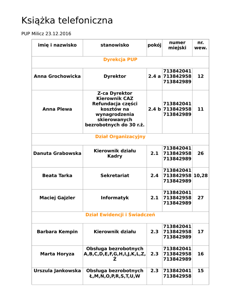 Książka telefoniczna PUP Milicz 23.12.2016 imię i nazwisko stanowisko pokój numer miejski nr. wew. Dyrekcja PUP Anna Grochowicka Anna Plewa 713842041 2.4 a 713842958 713842989 12 Z-ca Dyrektor Kierownik CAZ Refundacja części 713842041 kosztów na 2.4 b 713842958 wynagrodzenia 713842989 skierowanych bezrobotnych do 30 r.ż. 11 Dyrektor Dział Organizacyjny Danuta Grabowska Kierownik działu Kadry 2.1 713842041 713842958 713842989 Beata Tarka Sekretariat 2.4 713842041 713842958 10,28 713842989 Maciej Gajzler Informatyk 2.1 713842041 713842958 713842989 27 17 16 26 Dział Ewidencji i Świadczeń Barbara Kempin Kierownik działu 2.3 713842041 713842958 713842989 Marta Horyza Obsługa bezrobotnych A,B,C,D,E,F,G,H,I,J,K,L,Z, Ż 2.3 713842041 713842958 713842989 Urszula Jankowska Obsługa bezrobotnych Ł,M,N,O,P,R,S,T,U,W 2.3 713842041 713842958 15 713842989 Marta Adamiak Rejestracja 1.4 713842041 713842958 713842989 18 31 Centrum Aktywizacji Zawodowej Malwina Walorska Pośrednik pracy M,N,O,R,V,Wa,Wą,Wn 1.3 713842041 713842958 713842989 Ewa Karpińska Pośrednik pracy B,C,G 1.3 713842041 713842958 713842989 22 Marta Panek Doradca zawodowy A,Ć,E,K,Wl,Wł,Wr,Wu,W ó,Wy 1.3 713842041 713842958 713842989 25 Monika Nojman-Żyto Doradca zawodowy D,F,H,I,J,L,Ł,U,Ż,Wd,We, Wę,Wi 1.3 713842041 713842958 713842989 23 Pośrednik pracy, Oferty 713842041 Agnieszka Zaradna pracy, Oświadczenia dla 1.3 a 713842958 cudzoziemców 713842989 24 Agata Andruszczyszyn Bon zatrudnieniowy, Dofinansowanie wynagrodzenia 50+, Bon na zasiedlenie Katarzyna Lempach-Kowaluk Doradca zawodowy S,Ś,T,Z,Wo Robert Paszkiewicz Projekty EFS Iwona Eliasz Szkolenia, Prace interwencyjne, Studia podyplomowe, KFS, Roboty publiczne, Przygotowanie zawodowe dorosłych P 32 713842041 713842958 713842989 32 1.2 713842041 713842958 713842989 34 713842041 1.2 a 713842958 713842989 19 713842041 713842958 713842989 29 1.5 Anna Sofińska Staże, Prace społecznie użyteczne, PAI 1.5 713842041 713842958 713842989 14 Teresa Mellem Dotacje, Wyposażenie stanowiska pracy 1.6 713842041 713842958 713842989 21 30 Dział finansowy Jadwiga Łysikowska-Klimek Kierownik działu Główny księgowy 1.7 713842041 713842958 713842989 Anna Chlistun Księgowość FP 2.2 713842041 713842958 713842989 33 Lucyna Kuźnik Księgowość Budżet, Płace 2.2 713842041 713842958 713842989 20