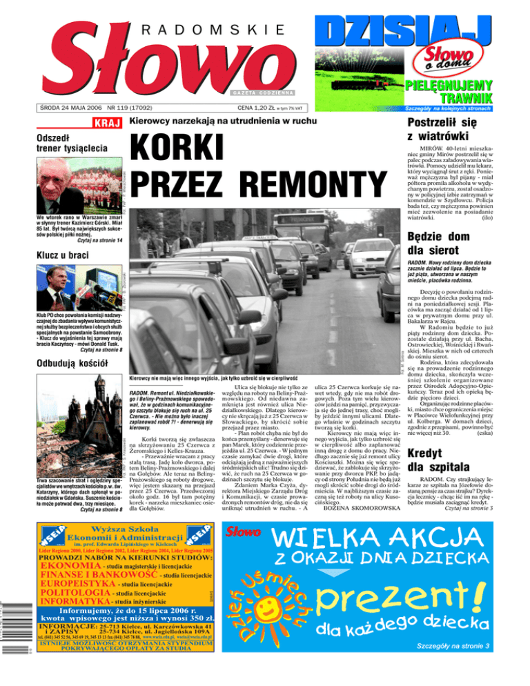 R A D O M S K I E RODA 24 MAJA 2006 NR 119 (17092) CENA 1,20 Z£ w tym 7% VAT KRAJ Kierowcy narzekaj¹ na utrudnienia w ruchu Fot. PAP - P. Wierzchowski Odszed³ trener tysi¹clecia Postrzeli³ siê z wiatrówki KORKI PRZEZ REMONTY MIRÓW. 40-letni mieszkaniec gminy Mirów postrzelił się w palec podczas załadowywania wiatrówki. Pomocy udzielił mu lekarz, który wyciągnął śrut z ręki. Ponieważ mężczyzna był pijany - miał półtora promila alkoholu w wydychanym powietrzu, został osadzony w policyjnej izbie zatrzymań w komendzie w Szydłowcu. Policja bada też, czy mężczyzna powinien mieć zezwolenie na posiadanie wiatrówki. (ilo) We wtorek rano w Warszawie zmar³ w s³ynny trener Kazimierz Górski. Mia³ 85 lat. By³ twórc¹ najwiêkszych sukcesów polskiej pi³ki no¿nej. Czytaj na stronie 14 Bêdzie dom dla sierot Klucz u braci Fot. PAP - B. Zborowski RADOM. Nowy rodzinny dom dziecka zacznie dzia³aæ od lipca. Bêdzie to ju¿ pi¹ta, utworzona w naszym miecie, placówka rodzinna. Fot. M. So³nia Klub PO chce powo³ania komisji nadzwyczajnej do zbadania wp³ywu komunistycznej s³u¿by bezpieczeñstwa i obcych s³u¿b specjalnych na powstanie Samoobrony. - Klucz do wyjanienia tej sprawy maj¹ bracia Kaczyñscy - mówi Donald Tusk. Czytaj na stronie 8 Odbuduj¹ koció³ Kierowcy nie maj¹ wiêc innego wyjcia, jak tylko uzbroiæ siê w cierpliwoæ Fot. PAP - S. Kraszewski RADOM. Remont ul. Niedzia³kowskiego i Beliny-Pra¿mowskiego spowodowa³, ¿e w godzinach komunikacyjnego szczytu blokuje siê ruch na ul. 25 Czerwca. - Nie mo¿na by³o inaczej zaplanowaæ robót ?! - denerwuj¹ siê kierowcy. Trwa szacowanie strat i oglêdziny specjalistów we wnêtrzach kocio³a p.w. w. Katarzyny, którego dach sp³on¹³ w poniedzia³ek w Gdañsku. Suszenie kocio³a mo¿e potrwaæ dwa, trzy miesi¹ce. Czytaj na stronie 8 Korki tworzą się zwłaszcza na skrzyżowaniu 25 Czerwca z Żeromskiego i Kelles-Krauza. - Przeważnie wracam z pracy stałą trasą. Jadę koło dworca, potem Beliny-Prażmowskiego i dalej na Gołębów. Ale teraz na BelinyPrażowskiego są roboty drogowe, więc jestem skazany na przejazd przez 25 Czerwca. Przedwczoraj około godz. 16 był tam potężny korek - narzeka mieszkaniec osiedla Gołębiów. Ulica się blokuje nie tylko ze względu na roboty na Beliny-Prażmowskiego. Od niedawna zamknięta jest również ulica Niedziałkowskiego. Dlatego kierowcy nie skręcają już z 25 Czerwca w Słowackiego, by skrócić sobie przejazd przez miasto. - Plan robót chyba nie był do końca przemyślany - denerwuje się pan Marek, który codziennie przejeżdża ul. 25 Czerwca. - W jednym czasie zamykać dwie drogi, które odciążają jedną z najważniejszych śródmiejskich ulic! Trudno się dziwić, że ruch na 25 Czerwca w godzinach szczytu się blokuje. Zdaniem Marka Czyża, dyrektora Miejskiego Zarządu Dróg i Komunikacji, w czasie prowadzonych remontów dróg, nie da się uniknąć utrudnień w ruchu. - A ulica 25 Czerwca korkuje się nawet wtedy, gdy nie ma robót drogowych. Poza tym wielu kierowców jeździ na pamięć, przyzwyczaja się do jednej trasy, choć mogliby jeździć innymi ulicami. Dlatego właśnie w godzinach szczytu tworzą się korki. Kierowcy nie mają więc innego wyjścia, jak tylko uzbroić się w cierpliwość albo zaplanować inną drogę z domu do pracy. Niedługo zacznie się już remont ulicy Kościuszki. Można się więc spodziewać, że zablokuje się skrzyżowanie przy dworcu PKP, bo jadący od strony Południa nie będą już mogli skrócić sobie drogi do śródmieścia. W najbliższym czasie zaczną się też roboty na ulicy Kusocińskiego. BOŻENA SKOMOROWSKA Decyzję o powołaniu rodzinnego domu dziecka podejmą radni na poniedziałkowej sesji. Placówka ma zacząć działać od 1 lipca w prywatnym domu przy ul. Bakalarza w Rajcu. W Radomiu będzie to już piąty rodzinny dom dziecka. Pozostałe działają przy ul. Bacha, Ostrowieckiej, Wośnickiej i Rwańskiej. Mieszka w nich od czterech do ośmiu sierot. Rodzina, która zdecydowała się na prowadzenie rodzinnego domu dziecka, skończyła wcześniej szkolenie organizowane przez Ośrodek Adopcyjno-Opiekuńczy. Teraz pod ich opieką będzie pięcioro dzieci. Organizując rodzinne placówki, miasto chce ograniczenia miejsc w Placówce Wielofunkcyjnej przy ul. Kolberga. W domach dzieci, zgodnie z przepisami, powinno być nie więcej niż 30. (eska) Kredyt dla szpitala RADOM. Czy strajkujący lekarze ze szpitala na Józefowie dostaną pensje za czas strajku? Dyrekcja lecznicy - chcąc iść im na rękę będzie musiała zaciągnąć kredyt. Czytaj na stronie 3