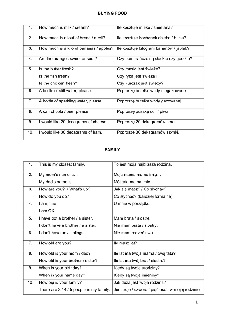 BUYING FOOD 1. How much is milk / cream? Ile kosztuje mleko / śmietana? 2. How much is a loaf of bread / a roll? Ile kosztuje bochenek chleba / bułka? 3. How much is a kilo of bananas / apples? Ile kosztuje kilogram bananów / jabłek? 4. Are the oranges sweet or sour? Czy pomarańcze są słodkie czy gorzkie? 5. Is the butter fresh? Czy masło jest świeże? Is the fish fresh? Czy ryba jest świeża? Is the chicken fresh? Czy kurczak jest świeży? 6. A bottle of still water, please. Poproszę butelkę wody niegazowanej. 7. A bottle of sparkling water, please. Poproszę butelkę wody gazowanej. 8. A can of cola / beer please. Poproszę puszkę coli / piwa. 9. I would like 20 decagrams of cheese. Poproszę 20 dekagramów sera. 10. I would like 30 decagrams of ham. Poproszę 30 dekagramów szynki. FAMILY 1. This is my closest family. To jest moja najbliższa rodzina. 2. My mom’s name is… Moja mama ma na imię… My dad’s name is… Mój tata ma na imię… How are you? / What’s up? Jak się masz? / Co słychać? How do you do? Co słychać? (bardziej formalne) I am, fine. U mnie w porządku. 3. 4. I am OK. 5. I have got a brother / a sister. Mam brata / siostrę. I don’t have a brother / a sister. Nie mam brata / siostry. 6. I don’t have any siblings. Nie mam rodzeństwa. 7. How old are you? Ile masz lat? 8. How old is your mom / dad? Ile lat ma twoja mama / twój tata? How old is your brother / sister? Ile lat ma twój brat / siostra? When is your birthday? Kiedy są twoje urodziny? When is your name day? Kiedy są twoje imieniny? How big is your family? Jak duża jest twoja rodzina? 9. 10. There are 3 / 4 / 5 people in my family. Jest troje / czworo / pięć osób w mojej rodzinie. 1 BUYING CLOTHES & SHOES 1. Can I try on these shoes? Czy mogę przymierzyć te buty? 2. Can I try on these jeans? Czy mogę przymierzyć te dżinsy? 3. Can I try on this dress? Czy mogę przymierzyć tą sukienkę? 4. Where are the fitting rooms? Gdzie są przymierzalnie? Where are the changing rooms? 5. How much are the shoes? Ile kosztują buty? How much is the T-shirt? Ile kosztuje koszula? How much is the sweater? Ile kosztuje sweter? 6. The sleeves are too long. Rękawy są zbyt długie. 7. The legs of the jeans are too short. Nogawki są zbyt krótkie. 8. The jeans are too long. Dżinsy są zbyt długie. 9. The shoes are too small. Buty są zbyt małe. 10. The jacket is too big. Kurtka jest zbyt duża. CITY LIFE 1. Where is a bank? Gdzie jest bank? Where is a post office? Gdzie jest poczta? Where is a hospital? Gdzie jest szpital? 2. I am looking for a McDonald’s / vegie bar. Szukam McDonalda / baru wegetariańskiego. 3. I am looking for a hotel / guesthouse. Szukam hotelu / pensjonatu. 4. How far is to the city center? Jak daleko jest do centrum? 5. How far is to the bus stop? Jak daleko jest do przystanku autobusowego? 6. How far is to the railway station? Jak daleko jest do stacji kolejowej? 7. How much is a bus ticket? Ile kosztuje bilet autobusowy? 8. How much is a tram ticket? Ile kosztuje bilet tramwajowy? 9. How much is a taxi ride? Ile kosztuje przejazd taksówką? 10. Where is the nearest shop? Gdzie jest / znajduje się najbliższy sklep? Where is the nearest restaurant? Gdzie jest / znajduje się najbliższa restauracja? 2 RESTAURANT 1. I am hungry. Jestem głodny. I am thirsty. Chce mi się pić. /Jestem spragniony. Are you hungry? Czy jesteś głodny? Are you thirsty? Czy chce ci się pić? Let’s have a pizza! Zjedzmy pizzę. Let’s have a hot-dog. Zjedzmy hit-doga. Let’s have some ice-cream. Zjedzmy lody. I would like vanilla ice-cream. Chciałabym / Chciałbym lody waniliowe. I would like chocolate ice-cream. Chciałabym / Chciałbym lody czekoladowe. How much is a small pizza? Ile kosztuje mała pizza? How much is a large pizza? Ile kosztuje duża pizza? 6. Can I have a hamburger / cheeseburger? Poproszę hamburgera / cheesburgera. 7. Can I have a cheese / ham sandwich? Poproszę o kanapkę z serem / z szynką. 8. Can I have fish and chips? Poproszę rybę I frytki. 9. An Italian / Greek salad for my mom. Włoska /grecka sałatka dla mojej mamy. 10. A fruit salad for my dad. Sałatka owocowa dla mojego taty. 2. 3. 4. 5. TIME 1. What’s the time? / What time is it? Która godzina? 2. What time do you have breakfast? O której godzinie jesz śniadanie? I have breakfast at … Jem śniadanie o … What time do you have dinner? O której godzinie jesz obiad / kolację? I have dinner at… Jem obiad / kolację o… What time do you wake up? O której godzinie wstajesz? I wake up at … Wstaję o… What time do you go to bed? O której godzinie idziesz spać? I go to bed at … Idę spać o… What time do you start school? O której godzinie zaczynasz szkołę? I start school at… Zaczynam szkołę o… 7. What time do shops open? O której godzinie otwierane są sklepy? 8. What time do shops close? O której godzinie zamykane są sklepy? 9. Call me at 4 o’clock. Zadzwoń o 16:00. 10. Visit me at 6 o’clock Odwiedź mnie o 18:00. 3. 4. 5. 6. 3 DRINKING 1. This tea is too hot. Herbata jest zbyt gorąca. 2. This coffee is too cold. Kawa jest zbyt zimna. 3. Pour me some tea. Nalej mi trochę herbaty. 4. Pour me some juice. Nalej mi trochę soku. 5. Do you like milk? Czy lubisz mleko? Do you like cocoa? /ˈkəʊkəʊ/ Czy lubisz kakao? I will make you some tea. Zrobię ci herbatę. I will make you some coffee. Zrobię ci kawę. Fruits contain vitamins. Owoce zwierają witaminy. Fruits contain carbohydrates. Owoce zawierają węglowodany. I like freshly–squeezed orange / apple Lubię świeżo wyciśnięty sok pomarańczowy / juice. sok jabłkowy. I don’t like carrot / current juice. Nie lubię soku marchewkowego / 6. 7. 8. 9. porzeczkowego. 10. Milk is healthy. Mleko jest zdrowe. Milk contains protein. Mleko zawiera białko PREPARING FOOD 1. Slice some bread. Pokrój (na kromki) chleb. Slice some cheese / ham Pokrój (na plasterki) ser /szynkę. Chop some onion. Po