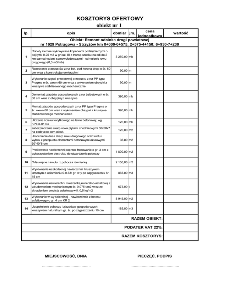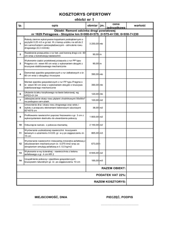 KOSZTORYS OFERTOWY obiekt nr 1 lp. cena wartość jednostkowa Obiekt: Remont odcinka drogi powiatowej nr 1629 Pstrągowa - Strzyżów km 0+000-0+575; 2+575-4+150; 6+930-7+230 opis obmiar jm. 1 Roboty ziemne wykonywane koparkami podsiębiernymi o poj.łyżki 0.25 m3 w gr.kat. III z transp.urobku na odl.do 2 km samochodami samowyładowczymi - odmulenie rowu drogowego (0,3 m3/mb) 2 Rozebranie przepustów z rur bet. pod koroną drogi o śr. 60 cm wraz z konstrukcją nawierzchni 90,00 m 3 Wykonanie części przelotowej przepustu z rur PP typu Pragma o śr. wewn 60 cm wraz z wykonaniem obsypki z kruszywa stabilizowanego mechanicznie 90,00 m 4 Demontaż zjazdów gospodarczych z rur żelbetowych o śr. 60 cm wraz z obsypką z kruszywa 390,00 mb 5 Montaż zjazdów gospodarczych z rur PP typu Pragma o śr. wewn 60 cm wraz z wykonaniem obsypki z kruszywa stabilizowanego mechanicznie 390,00 mb 6 7 Ułożenie ścieku korytkowego na ławie betonowej; wg KPED-01.04 zabezpieczenie skarp rowu płytami chodnikowymi 50x50x7 na podsypce cem-piask. 3 250,00 mb 120,00 mb 120,00 m2 8 Umocnienie dna i skarp rowu drogowego oraz wlotu i wylotu z przepustu elementami betonowymi ażurowymi 60*40*8 cm 9 Profilowanie nawierzchni poprzez frezowanie o gr. 3 cm z wykorzystaniem destruktu do utwardzenia poboczy 1 800,00 m2 10 Odsunięcie namułu z pobocza równiarką 2 150,00 m2 11 Wyrównanie uszkodzonej nawierzchni kruszywem łamanym o uziarnieniu 0-0,63; gr. w-y po zagęszczeniu śr. 15 cm 865,00 m3 12 Wyrównanie nawierzchni mieszanką mineralno-asfaltową z wbudowaniem mechanicznym śr. 0,075 t/m2 wraz ze skropieniem emulsją asfaltową w il. 0,5 kg/m2 673,00 t 13 Wykonanie w-wy ścieralnej - nawierzchnia z betonu asfaltowego o gr. 4 cm KR 2 14 Uzupełnienie poboczy i zjazdóww gospodarczych kruszywem naturalnym gr. śr. po zagęszczeniu 10 cm 36,00 m2 8 945,00 m2 185,00 m3 RAZEM OBIEKT: PODATEK VAT 22%: RAZEM KOSZTORYS: MIEJSCOWOŚĆ, DNIA PIECZĘĆ, PODPIS ........................................... ........................................... KOSZTORYS OFERTOWY obiekt nr 2 lp. opis obmiar jm. cena jednostkowa wartość Obiekt: Remont odcinka drogi powiatowej nr 2405 Jaszczurowa - Wiśniowa km 6+500 - 7+550 1 Roboty ziemne wykonywane koparkami podsiębiernymi o poj.łyżki 0.25 m3 w gr.kat. III z transp.urobku na odl.do 2 km samochodami samowyładowczymi - odmulenie rowu drogowego 1 050,00 mb 2 Odsunięcie namułu z pobocza równiarką 1 050,00 m2 3 Rozebranie uszkodzonej części przelotowej przepustów rurowych o średnicy 60 cm 18,00 m 4 Wykonanie części przelotowej przepustów z rur PVC (8kPa) o średnicy wewn. 60 cm wraz z wykonaniem obsypki z kruszywa stabilizowanego mechanicznie 18,00 m 5 Wykonanie sączków poprzecznych z tłucznia klinowanego klińcem o gł. 0,8 m i szer. 0,6m, stabilizowanych mechanicznie 30,00 m 6 Wyrównanie istniejącej nawierzchni mieszanką mineralnoasfaltową z wbudowaniem mechanicznym śr. 0,100 t/m2 wraz ze skropieniem emulsją asfaltową w il. 0,5 kg/m2 7 8 Wykonanie w-wy ścieralnej - nawierzchnia z betonu asfaltowego o gr. 4 cm KR 2 Uzupełnienie poboczy pospółką gr. śr. po zagęszczeniu 10 cm 577,50 t 5 775,00 m2 1 050,00 m2 RAZEM OBIEKT: PODATEK VAT 22%: RAZEM KOSZTORYS: MIEJSCOWOŚĆ, DNIA PIECZĘĆ, PODPIS ........................................... ...........................................
