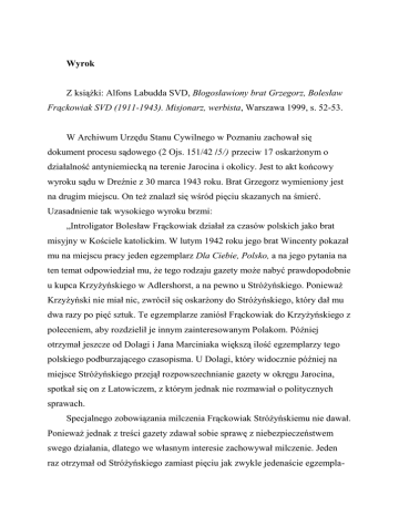 Wyrok Z książki: Alfons Labudda SVD, Błogosławiony brat Grzegorz, Bolesław Frąckowiak SVD (1911-1943). Misjonarz, werbista, Warszawa 1999, s. 52-53. W Archiwum Urzędu Stanu Cywilnego w Poznaniu zachował się dokument procesu sądowego (2 Ojs. 151/42 /5/) przeciw 17 oskarżonym o działalność antyniemiecką na terenie Jarocina i okolicy. Jest to akt końcowy wyroku sądu w Dreźnie z 30 marca 1943 roku. Brat Grzegorz wymieniony jest na drugim miejscu. On też znalazł się wśród pięciu skazanych na śmierć. Uzasadnienie tak wysokiego wyroku brzmi: „Introligator Bolesław Frąckowiak działał za czasów polskich jako brat misyjny w Kościele katolickim. W lutym 1942 roku jego brat Wincenty pokazał mu na miejscu pracy jeden egzemplarz Dla Ciebie, Polsko, a na jego pytania na ten temat odpowiedział mu, że tego rodzaju gazety może nabyć prawdopodobnie u kupca Krzyżyńskiego w Adlershorst, a na pewno u Stróżyńskiego. Ponieważ Krzyżyński nie miał nic, zwrócił się oskarżony do Stróżyńskiego, który dał mu dwa razy po pięć sztuk. Te egzemplarze zaniósł Frąckowiak do Krzyżyńskiego z poleceniem, aby rozdzielił je innym zainteresowanym Polakom. Później otrzymał jeszcze od Dolagi i Jana Marciniaka większą ilość egzemplarzy tego polskiego podburzającego czasopisma. U Dolagi, który widocznie później na miejsce Stróżyńskiego przejął rozpowszechnianie gazety w okręgu Jarocina, spotkał się on z Latowiczem, z którym jednak nie rozmawiał o politycznych sprawach. Specjalnego zobowiązania milczenia Frąckowiak Stróżyńskiemu nie dawał. Ponieważ jednak z treści gazety zdawał sobie sprawę z niebezpieczeństwem swego działania, dlatego we własnym interesie zachowywał milczenie. Jeden raz otrzymał od Stróżyńskiego zamiast pięciu jak zwykle jedenaście egzempla- rzy. Te sześć ponad normę dał Krzyżyński natychmiast Strzelczykowi, który zaniósł je do piekarza Balcerowiaka w Glucksburg. Jemu przyniósł już przedtem gazetę od Stróżyńskiego brat oskarżonego Wincenty. Dla jednego znajdującego się w obozie koncentracyjnym w Dachau katolickiego duchownego (chodzi o ojca Jana Giczela SVD – przypis autora.) zebrał w sumie 250 marek. Przez swoje stosunki ze szczególnie gorliwymi katolickimi kręgami posyłano mu pieniądze dla tego celu nawet z okolicy Grudziądza. Pieniądze chciał on zużyć zgodnie z przeznaczeniem, ponieważ podobne przesyłki pieniężne do więźnia dozwolone były do wysokości 40 marek miesięcznie. Do tego oskarżony przyznał się w głównym przewodzie sądowym: więcej nie zdołano udowodnić”. W rozszerzonym uzasadnieniu wyroku sądowego dodano jeszcze: „Jak Stróżyńskiego (głównego oskarżonego – przypis autora) należy również traktować Bolesława Frąckowiaka. On stale wspomagał Stróżyńskiego przez to, że pewną ilość gazet regularnie odnosił od niego do handlarza towarów kolonialnych Krzyżyńskiego w Adlerhorst. Ten miał rozdzielić dalej te pisma wśród klientów swego sklepu. Ponadto zbierał również sporo pieniędzy celem wsparcia katolickiego duchownego w Dachau, który w najgorszy sposób podburzał i wichrzył przeciw Niemcom. Zakres działalności i jego fanatyczne jezuickie narodowo–polskie nastawienie zmusza nas do tego, by go traktować jako wyższego funkcjonariusza. Wskutek tego i jemu można było wymierzyć wyłącznie karę śmierci”. Brat Grzegorz znalazł się wśród pięciu skazanych na śmierć. Fakt ten świadczy o tym, że ofiara jego została przyjęta. O. Paweł Kiczka, jak widzieliśmy wyżej, wspomina, że już na rok przed uwięzieniem odstąpił od kolportowania gazetki. Wiadomo jednak, że hitlerowcy robili wszystko w „majestacie prawa” i „w imię Narodu Niemieckiego”. Nazwiska wymienione w uzasadnieniu wyroku, oprawcy równie dobrze mogli znać z „przesłuchań” innych oskarżonych. Niemcy wymienili tyle nazwisk, by uwiarygodnić wyrok. Dla przykładu wzmiankowany w tym uzasadnieniu rodzony brat Grzegorza, Wincenty, który pokazał mu w miejscu pracy jeden egzemplarz Dla Ciebie, Polsko, nigdy nie pracował w drukarni jarocińskiej. Przyznanie Bogu ducha winnemu prostemu bratu zakonnemu, który miał ukończoną tylko szkołę powszechną, tytułu „wyższego funkcjonariusza” to już „delikatna” przesada. Trudno tu dopatrzeć się logiki. Jednakże cała zajadłość sędziów niemieckich przeciw Kościołowi i Polsce ujawnia się w określeniu nastawienia Brata jako „fanatycznie jezuickie i narodowo–polskie”. Za takie nastawienie należało oczywiście „wymierzyć wyłącznie karę śmierci".