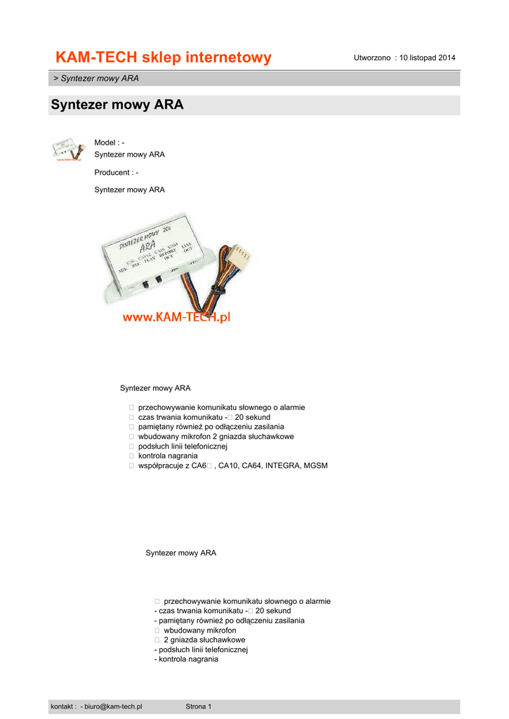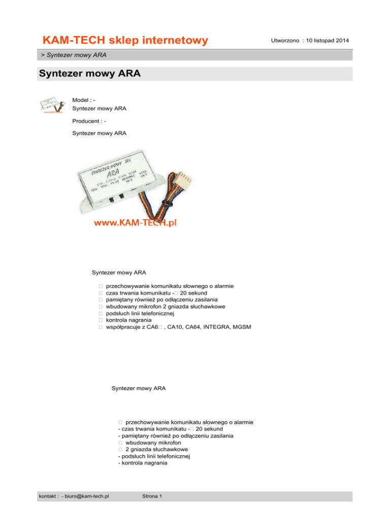KAM-TECH sklep internetowy > Syntezer mowy ARA Syntezer mowy ARA Model : Syntezer mowy ARA Producent : Syntezer mowy ARA Syntezer mowy ARA � przechowywanie komunikatu słownego o alarmie � czas trwania komunikatu -�20 sekund � pamiętany również po odłączeniu zasilania � wbudowany mikrofon 2 gniazda słuchawkowe � podsłuch linii telefonicznej � kontrola nagrania � współpracuje z CA6�, CA10, CA64, INTEGRA, MGSM Syntezer mowy ARA � przechowywanie komunikatu słownego o alarmie - czas trwania komunikatu -�20 sekund - pamiętany również po odłączeniu zasilania � wbudowany mikrofon � 2 gniazda słuchawkowe - podsłuch linii telefonicznej - kontrola nagrania kontakt : - [email protected] Strona 1 Utworzono : 10 listopad 2014 KAM-TECH sklep internetowy > Syntezer mowy ARA Syntezer mowy ARA � � Cena : 60,27 zł Brutto ( 49,00 zł Netto) Dostępność: Produkt dostępny w naszym sklepie od 08 kwiecień 2008 kontakt : - [email protected] Strona 2 Utworzono : 10 listopad 2014