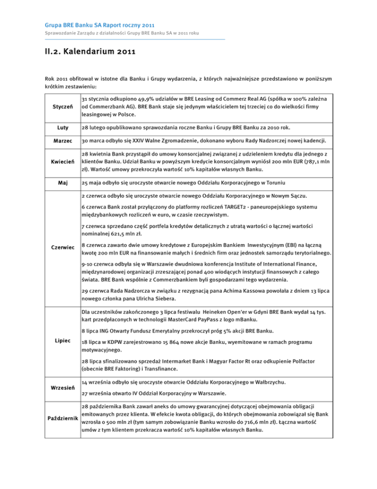 Grupa BRE Banku SA Raport roczny 2011 Sprawozdanie Zarządu z działalności Grupy BRE Banku SA w 2011 roku II.2. Kalendarium 2011 Rok 2011 obfitował w istotne dla Banku i Grupy wydarzenia, z których najważniejsze przedstawiono w poniższym krótkim zestawieniu: Styczeń Luty 31 stycznia odkupiono 49,9% udziałów w BRE Leasing od Commerz Real AG (spółka w 100% zależna od Commerzbank AG). BRE Bank staje się jedynym właścicielem tej trzeciej co do wielkości firmy leasingowej w Polsce. 28 lutego opublikowano sprawozdania roczne Banku i Grupy BRE Banku za 2010 rok. Marzec 30 marca odbyło się XXIV Walne Zgromadzenie, dokonano wyboru Rady Nadzorczej nowej kadencji. Kwiecień 28 kwietnia Bank przystąpił do umowy konsorcjalnej związanej z udzieleniem kredytu dla jednego z klientów Banku. Udział Banku w powyższym kredycie konsorcjalnym wyniósł 200 mln EUR (787,1 mln zł). Wartość umowy przekroczyła wartość 10% kapitałów własnych Banku. Maj 25 maja odbyło się uroczyste otwarcie nowego Oddziału Korporacyjnego w Toruniu 2 czerwca odbyło się uroczyste otwarcie nowego Oddziału Korporacyjnego w Nowym Sączu. 6 czerwca Bank został przyłączony do platformy rozliczeń TARGET2 - paneuropejskiego systemu międzybankowych rozliczeń w euro, w czasie rzeczywistym. 7 czerwca sprzedano część portfela kredytów detalicznych z utratą wartości o łącznej wartości nominalnej 621,5 mln zł. Czerwiec 8 czerwca zawarto dwie umowy kredytowe z Europejskim Bankiem Inwestycyjnym (EBI) na łączną kwotę 200 mln EUR na finansowanie małych i średnich firm oraz jednostek samorządu terytorialnego. 9-10 czerwca odbyła się w Warszawie dwudniowa konferencja Institute of International Finance, międzynarodowej organizacji zrzeszającej ponad 400 wiodących instytucji finansowych z całego świata. BRE Bank wspólnie z Commerzbankiem byli gospodarzami tego wydarzenia. 29 czerwca Rada Nadzorcza w związku z rezygnacją pana Achima Kassowa powołała z dniem 13 lipca nowego członka pana Ulricha Siebera. Dla uczestników zakończonego 3 lipca festiwalu Heineken Open'er w Gdyni BRE Bank wydał 14 tys. kart przedpłaconych w technologii MasterCard PayPass z logo mBanku. 8 lipca ING Otwarty Fundusz Emerytalny przekroczył próg 5% akcji BRE Banku. Lipiec 18 lipca w KDPW zarejestrowano 15 864 nowe akcje Banku, wyemitowane w ramach programu motywacyjnego. 28 lipca sfinalizowano sprzedaż Intermarket Bank i Magyar Factor Rt oraz odkupienie Polfactor (obecnie BRE Faktoring) i Transfinance. 14 września odbyło się uroczyste otwarcie Oddziału Korporacyjnego w Wałbrzychu. Wrzesień 27 września otwarto IV Oddział Korporacyjny w Warszawie. 28 października Bank zawarł aneks do umowy gwarancyjnej dotyczącej obejmowania obligacji emitowanych przez klienta. W efekcie kwota obligacji, do których obejmowania zobowiązał się Bank Październik wzrosła o 500 mln zł (tym samym zobowiązanie Banku wzrosło do 716,6 mln zł). Łączna wartość umów z tym klientem przekracza wartość 10% kapitałów własnych Banku. Grupa BRE Banku SA Raport roczny 2011 Sprawozdanie Zarządu z działalności Grupy BRE Banku SA w 2011 roku 10 listopada otwarto Oddział w Koszalinie nazwany „Placówką Przyszłości” w pełni przystosowany do obsługi zarówno klientów korporacyjnych, jak i detalicznych. To piąty i zarazem ostatni oddział otwierany w 2011 roku. Listopad 19 listopada podpisano kolejną w tym roku umowę na linię kredytową z Europejskim Bankiem Inwestycyjnym (EBI) na 100 mln EUR. Była to trzecia w 2011 roku linia kredytowa z EBI obok linii dla MŚP i dla jednostek samorządów terytorialnych. Skierowana jest do sektora średnich przedsiębiorstw. mBank jako pierwszy w Polsce zaoferował rachunek osobisty z mobilnym internetem w pakiecie, by zwiększyć swoją obecność na rynku mobilnym. Grudzień 9 grudnia pani Karin Katerbau – Wiceprezes Zarządu BRE Banku, Dyrektor Banku ds. Finansów poinformowała o zamiarze rezygnacji z pracy w BRE w pierwszym półroczu 2012 roku w związku z przejściem do Oldenburgische Landesbank w Niemczech. 16 grudnia odbyło się na nowym Stadionie Narodowym w Warszawie uroczyste spotkanie ponad 1 000 klientów z kadrą zarządzająca Banku i spółek Grupy z okazji 25-lecia BRE Banku.