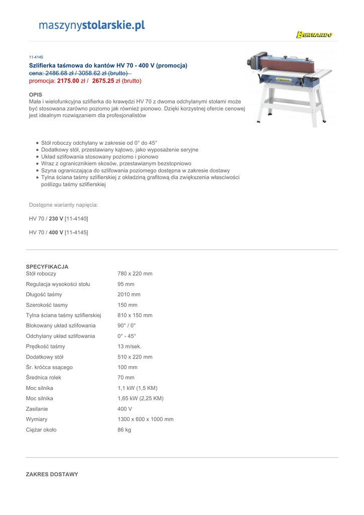 11-4145 Szlifierka taśmowa do kantów HV 70 - 400 V (promocja) cena: 2486.68 zł / 3058.62 zł (brutto) promocja: 2175.00 zł / 2675.25 zł (brutto) OPIS Mała i wielofunkcyjna szlifierka do krawędzi HV 70 z dwoma odchylanymi stołami może być stosowana zarówno poziomo jak również pionowo. Dzięki korzystnej ofercie cenowej jest idealnym rozwiązaniem dla profesjonalistów Stół roboczy odchylany w zakresie od 0° do 45° Dodatkowy stół, przestawiany kątowo, jako wyposażenie seryjne Układ szlifowania stosowany poziomo i pionowo Wraz z ogranicznikiem skosów, przestawianym bezstopniowo Szyna ograniczająca do szlifowania poziomego dostępna w zakresie dostawy Tylna ściana taśmy szlifierskiej z okładziną grafitową dla zwiększenia własciwości poślizgu taśmy szlifierskiej Dostępne warianty napięcia: HV 70 / 230 V [11-4140] HV 70 / 400 V [11-4145] SPECYFIKACJA Stół roboczy 780 x 220 mm Regulacja wysokości stołu 95 mm Długość taśmy 2010 mm Szerokość tasmy 150 mm Tylna ściana taśmy szlifierskiej 810 x 150 mm Blokowany układ szlifowania 90° / 0° Odchylany układ szlifowania 0° - 45° Prędkość taśmy 13 m/sek. Dodatkowy stół 510 x 220 mm Śr. króćca ssącego 100 mm Średnica rolek 70 mm Moc silnika 1,1 kW (1,5 KM) Moc silnika 1,65 kW (2,25 KM) Zasilanie 400 V Wymiary 1300 x 600 x 1000 mm Ciężar około 86 kg ZAKRES DOSTAWY Taśma szlifierska 2510 x 150 mm Podstawa Ogranicznik Powyższy cennik ma charakter informacyjny i nie stanowi oferty handlowej w rozumieniu art.66 paragraf 1 Kodeksu Cywilnego. HAFEN, ul. Artyleryjska 11, 08-110 Siedlce, tel/fax: 25 6440822, kom: 605 607 530, e-mail: [email protected]