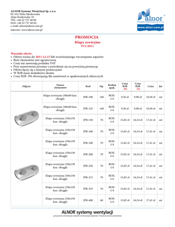 ALNOR Systemy Wentylacji Sp. z o.o. 05-552 Wola Mrokowska Aleja Krakowska 10 TEL +48 22 737 40 00 FAX +48 22 737 40 04 e-mail: [email protected] internet: www.alnor.com.pl PROMOCJA Klapy rewizyjne P11/2011 Warunki oferty: • Oferta ważna do 2011.12.15 lub wcześniejszego wyczerpania zapasów • Ilość elementów jest ograniczona • Ceny nie zawierają podatku VAT • Przy zamówieniu prosimy o powołanie się na powyższą promocję • Oferta łączy się z innymi promocjami • W B2B masz dodatkowe skonta • Ceny B2B -9% obowiązują dla zamówień w opakowaniach zbiorczych Zdjęcie Nazwa elementów Kod Op. Rodzaj opak. Cena B2B -9% Cena B2B -5% Cena Jm Klapa rewizyjna 180x80 kan. okrągły IPR-100 140 BOX1/4 9,56 zł 9,98 zł 10,50 zł szt Klapa rewizyjna 180x80 kan. okrągły IPR-125 140 BOX1/4 9,56 zł 9,98 zł 10,50 zł szt Klapa rewizyjna 250x150 kan. okrągły IPR-150 70 BOX1/4 15,85 zł 16,54 zł 17,41 zł szt Klapa rewizyjna 250x150 kan. okrągły IPR-160 70 BOX1/4 15,85 zł 16,54 zł 17,41 zł szt Klapa rewizyjna 250x150 kan. okrągły IPR-180 70 BOX1/4 15,85 zł 16,54 zł 17,41 zł szt Klapa rewizyjna 250x150 kan. okrągły IPR-200 70 BOX1/4 15,85 zł 16,54 zł 17,41 zł szt Klapa rewizyjna 250x150 kan. okrągły IPR-250 70 BOX1/4 15,85 zł 16,54 zł 17,41 zł szt Klapa rewizyjna 250x150 kan. okrągły IPR-315 70 BOX1/4 15,85 zł 16,54 zł 17,41 zł szt Klapa rewizyjna 250x150 kan. okrągły IPR-355 70 BOX1/4 15,85 zł 16,54 zł 17,41 zł szt Klapa rewizyjna 250x150 kan. okrągły IPR-400 60 BOX1/4 15,85 zł 16,54 zł 17,41 zł szt ALNOR® systemy wentylacji jest prawnie chronionym znakiem i technicznym patentem. Prawo do zmian zastrzeżone. ALNOR Systemy Wentylacji Sp. z o.o. 05-552 Wola Mrokowska Aleja Krakowska 10 TEL +48 22 737 40 00 FAX +48 22 737 40 04 e-mail: [email protected] internet: www.alnor.com.pl Zdjęcie Nazwa elementów Kod Op. Rodzaj opak. Cena B2B -9% Cena B2B -5% Cena Jm Klapa rewizyjna 250x150 kan. okrągły IPR-450 60 BOX1/4 15,85 zł 16,54 zł 17,41 zł szt Klapa rewizyjna 250x150 kan. okrągły IPR-500 60 BOX1/4 15,85 zł 16,54 zł 17,41 zł szt Klapa rewizyjna 300x200 kan. okrągły IPR-560 20 BOX1/4 38,10 zł 39,77 zł 41,86 zł szt Klapa rewizyjna 300x200 kan. okrągły IPR-630 20 BOX1/4 38,10 zł 39,77 zł 41,86 zł szt Klapa rewizyjna 300x200 kan. okrągły IPR-710 15 - 38,10 zł 39,77 zł 41,86 zł szt Klapa rewizyjna 300x200 kan. okrągły IPR-800 15 - 38,10 zł 39,77 zł 41,86 zł szt Klapa rewizyjna ocynkowana na kanał prostokątny IPFQ-200-100 100 BOX1/8 9,78 zł 10,21 zł 10,74 zł szt Klapa rewizyjna ocynkowana na kanał prostokątny IPFQ-300-200 35 BOX1/8 20,68 zł 21,59 zł 22,72 zł szt Klapa rewizyjna ocynkowana na kanał prostokątny IPFQ-400-200 20 BOX1/8 23,82 zł 24,87 zł 26,17 zł szt Klapa rewizyjna ocynkowana na kanał prostokątny IPFQ-400-300 15 BOX1/8 30,96 zł 32,32 zł 34,02 zł szt Klapa rewizyjna ocynkowana na kanał prostokątny IPFQ-500-400 15 BOX1/4 63,30 zł 66,09 zł 69,56 zł szt Klapa rewizyjna ocynkowana na kanał prostokątny IPFQ-600-500 6 BOX1/4 80,85 zł 84,40 zł 88,84 zł szt *Na kanały okrągłe o wymiarach nietypowych jak 224, 600 należy stosować klapę o rozmiar większą na d-224 klapę IPR-250, na d-600 klapę IPR-630 ALNOR® systemy wentylacji jest prawnie chronionym znakiem i technicznym patentem. Prawo do zmian zastrzeżone. ALNOR Systemy Wentylacji Sp. z o.o. 05-552 Wola Mrokowska Aleja Krakowska 10 TEL +48 22 737 40 00 FAX +48 22 737 40 04 e-mail: [email protected] internet: www.alnor.com.pl Dodatkowe skonto za pakiet: • 3 % skonta - zamówienie powyżej 5 000 zł • 5 % skonta - zamówienie powyżej 9 999 zł • 9 % skonta - zamówienie powyżej 15 000 zł • 13 % skonta - zamówienie powyżej 24 999 zł Inne produkty szybciej i taniej zamówisz na www.alnor-b2b.com.pl ALNOR® systemy wentylacji jest prawnie chronionym znakiem i technicznym patentem. Prawo do zmian zastrzeżone.