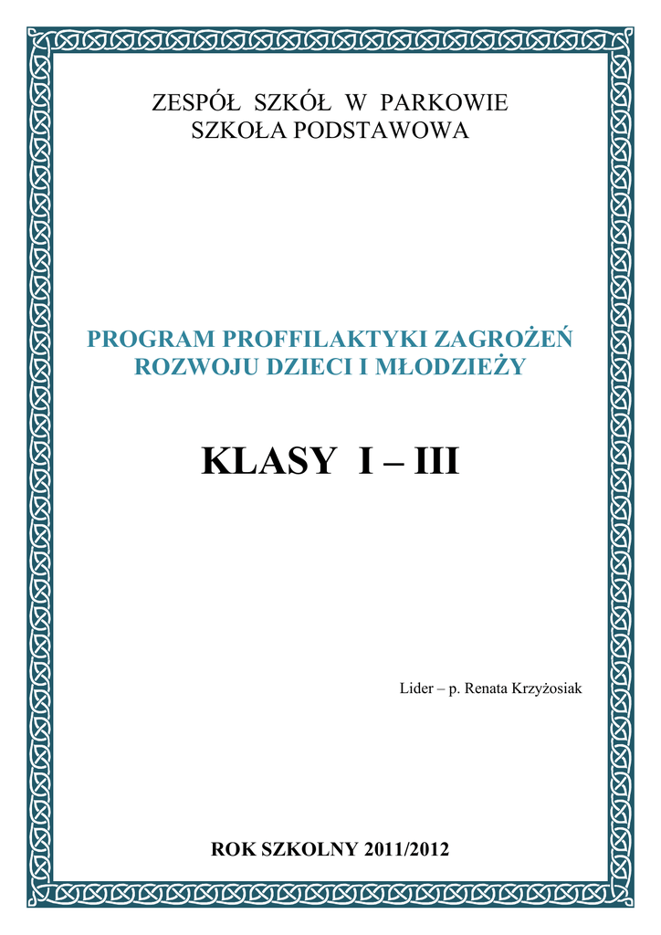 ZESPÓŁ SZKÓŁ W PARKOWIE SZKOŁA PODSTAWOWA PROGRAM PROFFILAKTYKI ZAGROŻEŃ ROZWOJU DZIECI I MŁODZIEŻY KLASY I – III Lider – p. Renata Krzyżosiak ROK SZKOLNY 2011/2012 I. PRIORYTETY 1. Zapobieganie zagrożeniom dzieci i młodzieży. a/ zapobieganie agresji fizycznej i słownej wśród dzieci wobec kolegów, nauczycieli i starszych; b/ zapobieganie trudnościom wychowawczym w klasie: praca z dzieckiem nadpobudliwym psychoruchowo poprawianie dyscypliny w klasie i w szkole; c/ zapobieganie niepowodzeniom szkolnym. 2. Poprawienie bezpieczeństwa w szkole i poza nią (bezpieczeństwo w drodze do szkoły, na wycieczkach szkolnych, w autobusie, na przerwach, w czasie lekcji. 3. Kształtowanie nawyków efektywnego spędzania wolnego czasu, aktywności poprzez udział w zajęciach pozalekcyjnych. 4. Podnoszenie kultury osobistej dzieci (savoir vivre). 5. Kształtowanie nawyków zdrowego i higienicznego życia. 1a. ZAPOBIEGANIE ZAGROŻENIOM DZIECI I MŁODZIEŻY. II. Efekty dla szkoły. - eliminacja zachowań agresywnych dzieci podczas przerwy i lekcji – obniżenie stopnia agresji wśród dzieci; - nabywanie umiejętności rozwiązywanie konfliktów i sporów w sposób akceptowany społecznie. III. Konieczne zasady. - materialne: klasa szkolna, filmy, bajki, telewizor, wideo; - ludzkie: nauczyciel – wychowawca, policjant, rodzice. IV. Monitorowanie efektów. - obserwacja zachowań dzieci na lekcjach i przerwach (cały rok szkolny); - prowadzenie zeszytów obserwacji; - korzystanie z dzienniczków ucznia i dzienników lekcyjnych do bieżącej obserwacji zachowań uczniów. V. Harmonogram. Lp. Zadania 1a Pogadanki z dziećmi na temat niewłaściwych – agresywnych zachowań z wykorzystaniem dramy, bajki terapeutycznej – negowanie zachowań niepożądanych, chwalenie pozytywnych. Czas trwania Cały rok szkolny Wykonawcy Odpowiedzialni Efekty działań Nauczyciel – Dyrektor - poprawa zachowań wychowawca szkoły – dzieci: zmniejszenie wychowawca liczby zachowań typu bicie się, popychanie, kopanie, wyzwiska, wulgaryzmy. Zapoznanie uczniów z regulaminem zachowania. Konsekwentne egzekwowanie przyjętego regulaminu Udzielanie pochwał i podkreślenie znaczenia dobrego zachowania wobec innych – dyplomy, odznaki, nagrody. Cały rok szkolny. Nauczyciel – Dyrektor Poprawa zachowania wychowawca szkoły – dzieci względem wychowawca siebie. Pogadanki z rodzicami na temat wpływu mediów na zwiększenie agresji wśród dzieci. I semestr Nauczyciel – Dyrektor - ograniczenie ilości wychowawca szkoły – oglądanych przez wychowawca dzieci filmów, programów zawierających agresywne zachowania, - kontrola czasu wolnego dziecka przez rodziców, - podniesienie świadomości rodziców dotyczącej agresji wśród dzieci 1a Uczenie dzieci pozytywnych sposobów rozwiązywania konfliktów i uczenie zachowań kulturalnych. Cały rok szkolny Nauczyciel Dyrektor - nabywanie wychowawca szkoły – nawyków wychowawca kulturalnego zachowania się wobec kolegów, nauczycieli, osób starszych 1b. ZAPOBIEGANIE TRUDNOŚCIOM WYCHOWAWCZYM W KLASIE: PRACA Z DZIECKIEM NADPOBUDLIWYM PSYCHORUCHOWO, POPRAWIENIE DYSCYPLINY W KLASIE I W SZKOLE. II. Efekty dla szkoły. - poprawienie dyscypliny i porządku na terenie szkoły; - wyciszanie zachowań nadpobudliwych, poprawa funkcjonowania dziecka nadpobudliwego; - wypracowanie strategii postępowania z dzieckiem nadpobudliwym psychoruchowo; - podniesienie poziomu wiadomości i umiejętności nauczycieli w pracy z dzieckiem nadpobudliwym; - podniesienie poziomu wiadomości i umiejętności rodziców dzieci nadpobudliwych. III. Konieczne zasoby. - materialne: środki finansowe na delegacje dla nauczycieli biorących udział w kursie dotyczącym pracy z dzieckiem nadpobudliwym psychoruchowo ADHD; - ludzkie: nauczyciel wychowawca, pedagog szkolny, psycholog, pracownicy Poradni Psychologiczno – Pedagogicznej, higienistka szkolna. IV. Monitorowanie efektów. - obserwacja zachowań dzieci podczas lekcji i przerw, na apelach, imprezach szkolnych, w świetlicy, autobusie; - kontrola poziomu umiejętności dzieci zgodnie z oczekiwanymi efektami (testy, ankiety, konkursy). V. Harmonogram. Lp. Zadania Współpraca z rodzicami dzieci z problemami nadpobudliwości i innymi dysfunkcjami oraz specjalistami – psycholog z Poradni PsychologicznoPedagogicznej, pedagogiem szkolnym. Czas Wykonawcy trwania Cały rok Pedagog szkolny szkolny, psycholog PPP Odpowiedzialni Efekty działań Dyrektor - jednolity front postępowań szkoły – wychowawca z dzieckiem - poprawa funkcjonowania dziecka nadpobudliwego w szkole i w domu Wprowadzenie systemu nagród – zasady oceniania zachowania uczniów klas I-III wzmacniających dyscyplinę w klasie i w szkole. Cały rok Wychowawcy, szkolny nauczyciele świetlicy, pedagog szkolny Dyrektor szkołynauczyciele Uczenie poprawnego zachowania i egzekwowania dyscypliny na terenie szkoły i poza nią. Cały rok Wychowawcy, szkolny wszyscy nauczyciele, nauczyciele świetlicy Dyrektor szkoły, nauczyciele - zwiększenie dyscypliny w klasie, na przerwach, apelach, imprezach szkolnych, w świetlicy, samodyscyplina - zmniejszenie zachowań niepożądanych typu: nadmierny hałas, przepychanie, bójki, kłótnie, poprawa porządku i dyscypliny w całej szkole. 1c. ZAPOBIEGANIE NIEPOWODZENIOM SZKOLNYM. II. Efekty dla szkoły. - zwiększenie przepływu informacji dotyczącej trudności i sukcesów dzieci w nauce między rodzicami i nauczycielami, - zwiększenie efektywności pracy rodziców z dziećmi w domu. III. Konieczne zasoby. - materialne: klasa szkolna, środki finansowe na zajęcia wyrównawcze, pomoc finansowa przy zakupie podręczników ( Gminny Ośrodek Pomocy Społecznej, TPD), - ludzkie: wychowawca, rodzice, psycholog, pedagog szkolny. IV. Monitorowanie efektów: - zwiększenie frekwencji na wywiadówkach: współpraca: nauczyciel – rodzic – poradnia w przypadku trudności szkolnych dziecka, - kontrola dokumentacji dziecka. V. Harmonogra