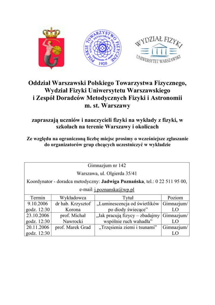 Oddział Warszawski Polskiego Towarzystwa Fizycznego, Wydział Fizyki Uniwersytetu Warszawskiego i Zespół Doradców Metodycznych Fizyki i Astronomii m. st. Warszawy zapraszają uczniów i nauczycieli fizyki na wykłady z fizyki, w szkołach na terenie Warszawy i okolicach Ze względu na ograniczoną liczbę miejsc prosimy o wcześniejsze zgłaszanie do organizatorów grup chcących uczestniczyć w wykładzie Gimnazjum nr 142 Warszawa, ul. Olgierda 35/41 Koordynator - doradca metodyczny: Jadwiga Poznańska, tel.: 0 22 511 95 00, e-mail: [email protected] Termin 9.10.2006 godz. 12:30 23.10.2006 godz. 12:30 20.11.2006 godz. 12:30 Wykładowca dr hab. Krzysztof Korona prof. Michał Nawrocki prof. Marek Grad Tytuł Poziom „Luminescencja od świetlików Gimnazjum/ po diody świecące” LO „Jak pracują fizycy – zbadajmy Gimnazjum/ wspólnie ruch wahadła” LO „Trzęsienia ziemi i tsunami” Gimnazjum/ LO Zespół Szkół Ogólnokształcących nr 17 Warszawa, ul. Promienista 12a, tel/fax: 863-73-04 Koordynator - doradca metodyczny: Halina Binkiewicz, e-mail: [email protected] Termin 5.10.2006 godz.12.00 8.11.2006 godz.12.00 21.11.2006 godz.12.00 Wykładowca prof. Jan Gaj dr hab. Krzysztof Korona prof. Tadeusz Stacewicz Tytuł „Oko i barwa” Poziom Gimnazjum/ LO „Luminescencja od świetlików Gimnazjum/ po diody świecące” LO „Optyka domowa” Gimnazjum/ LO LXIII LO im. Lajosa Kossutha, Warszawa, ul. Hirszfelda 11, tel. 0 22 643 10 77 Koordynator - doradca metodyczny: Maria Rowińska, tel.: 0 601 80 45 21, Termin 26.09.2006 godz. 12:40 17.10.2006 godz. 12:40 28.11.2006 godz. 12:40 e-mail: [email protected] Wykładowca Tytuł dr Andrzej „Czy żaba może lewitować w Wysmołek polu magnetycznym?” dr Jacek Szczytko „Kwantowy świat nanotechnologii” dr hab. Agnieszka „Biofizyka grypy” Bzowska Poziom Liceum Liceum Liceum Miejskie Gimnazjum w Zielonce ul. Łukasińskiego 1/3 tel.: 771-05-20, 771-05-24; fax: 771-05-30 Koordynator - doradca metodyczny: Jadwiga Gałecka, tel.: 0 609 038 930, e-mail: [email protected] Termin 12.10.06 godz. 8:50 7.12.06 godz. 8:50 Wykładowca prof. Jan Gaj Tytuł „Oko i barwa” Poziom Gimanzjum dr hab. Krzysztof „Luminescencja od świetlików Gimnazjum Korona po diody świecące” Zespół Szkół Publicznych Cząstków Mazowiecki, 05-152 Gmina Czosnów Koordynator - doradca metodyczny: Mirosław Łoś, tel.:0 509 123 606 e-mail: [email protected] Termin Wykładowca 6.11.2006 dr Jacek Szczytko godz.10:30 27.11.06 prof. Michał godz.11:00 Nawrocki 6.12.2006 godz.11:00 11.12.2006 godz.11:00 prof. Marek Grad Tytuł Poziom „Kwantowy świat Gimnazjum nanotechnologii” „Jak pracują fizycy – zbadajmy Gimnazjum wspólnie ruch wahadła” „Trzęsienia ziemi i tsunami” Gimnazjum I LO i PG 6 im. Tadeusza Kościuszki w Łomży, ul. Bernatowicza 4 e-mail: [email protected] Termin 6.10.2006 godz. 13:00 24.11.2006 godz. 13:00 8.12.2006 godz. 13:00 Wykładowca dr Andrzej Wysmołek prof. Szymon Malinowski Tytuł „Czy żaba może lewitować w polu magnetycznym?” „Czy za efekt cieplarniany rzeczywiście odpowiedzialni są ludzie” prof. Marek Grad „Trzęsienia ziemi i tsunami” Poziom LO/G LO/G LO/G Organizacja cyklu wykładów z fizyki w szkołach warszawskich została wsparta przez Miasto Stołeczne Warszawa