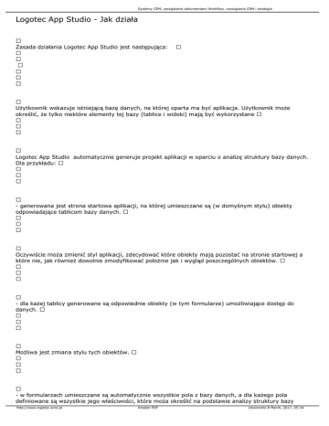 Systemy CRM, zarządzanie dokumentami Workflow, rozwiązania CRM i strategie Logotec App Studio - Jak działa Zasada działania Logotec App Studio jest następująca: Użytkownik wskazuje istniejącą bazę danych, na której oparta ma być aplikacja. Użytkownik może określić, że tylko niektóre elementy tej bazy (tablice i widoki) mają być wykorzystane Logotec App Studio automatycznie generuje projekt aplikacji w oparciu o analizę struktury bazy danych. Dla przykładu: - generowana jest strona startowa aplikacji, na której umieszczane są (w domyśnym stylu) obiekty odpowiadające tablicom bazy danych. Oczywiście moża zmienić styl aplikacji, zdecydować które obiekty mają pozostać na stronie startowej a które nie, jak również dowolnie zmodyfikować położnie jak i wygląd poszczególnych obiektów. - dla każej tablicy generowane są odpowiednie obiekty (w tym formularze) umożliwiające dostęp do danych. Możliwa jest zmiana stylu tych obiektów. - w formularzach umieszczane są automatycznie wszystkie pola z bazy danych, a dla każego pola definiowane są wszystkie jego właściwości, które moża określić na podstawie analizy struktury bazy http://www.logotec.wroc.pl Kreator PDF Utworzono 8 March, 2017, 05:34 Systemy CRM, zarządzanie dokumentami Workflow, rozwiązania CRM i strategie danych. Możliwe jest zdecydowanie, które pola mają zostać użyte, a które nie, jak również moża dowolnie zmodyfikować wygląd i styl formularzy. - dla każdego pola definiowana jest kontrola wprowadzania danych (walidacja), wartości domyślne, formatowanie, itp., w oparciu o właściwości pola zawarte w bazie danych. Oczywiście można to dowolnie modyfikować jak i tworzyć włsną walidację, wartości domyśne, formatowanie, powiązania pomiędzy polami, itp., itd. Możliwe jest definiowanie pól wirtualnych (niezawartych w bazie danych), obliczeń na poziomie formularza (np. Cena = Cena Jednostkowa x Ilość), jak i obliczeń agregacyjnych (np. suma wartości wszystkich pozycji, wszystkich zamówień itp.) i wiele innych. - pomiędzy poszczególnymi obiektami jak i pomiędzy poszczególnymi polami definiowane są automatycznie relacje oparte o powiązania (klucze obce) zawarte w bazie danych. Moża to modyfikować, jak również tworzyć relacje niezdefiniowane w bazie danych (pola słwnikowe, itp.). - dla każego obiektu (tablica/widok) system automatycznie tworzy możiwość filtrowania danych na kilka sposób – moża to oczywiście dowolnie zmodyfikować. - dla każego obiektu moża definiować włsane przełączalne widoki, które umożiwiają bardzo sprawny dostęp do danych. Np. dla obiektu „klienci” mogą to być „Wszyscy klienci”, „klienci, którzy dokonali zakupu w ciągu ostatnich 12 miesięcy”, „klienci, którzy nie dokonali zakupu przez ostatnie 6 miesięcy”, itp. http://www.logotec.wroc.pl Kreator PDF Utworzono 8 March, 2017, 05:34 Systemy CRM, zarządzanie dokumentami Workflow, rozwiązania CRM i strategie - można tworzyć dowolnie skomplikowane relacje pomiędzy obiektami (tablicami/widokami). Dla przykłdu, jeżli istnieją tablice „Klienci” i „Zamówienia”, to moża zdecydować że na poziomie głównym mają się znajdować obiekty „klienci” oraz „zamówienia”, a pod „klientami” mają się znajdować „zamówienia klienta”. Dla przykładu, stworzenie pod obiektem „Produkty” podobiektów typu „klienci, którzy zakupili ten produkt”, „klienci, którzy nie zakupili tego produktu”, „kraje, do których produkt został sprzedany”, itp. możliwe jest za pomocą kilku kliknięć myszką - Można definiować użytkowników, grupy użytkowników jak również ich uprawnienia. - Logotec App Studio oferuje dostęp do całgo szeregu zdarzeń na poziomie każdego z obiektów. Obsługa tych zdarzeń definiowana jest za pomocą wbudowanych wizardów. - Wszystkie powyższe możliwości dostępne są bez potrzeby programowania – definiuje się je w bardzo prosty, intuicyjny sposób z pomocą Logotec App Studio. - Gdyby powyższe molżiwocśi nie był wystarczające, możliwe jest rozbudowanie aplikacji o włsne funkcje (IronRuby) – w zdecydowanej więszości wypadków taka potrzeba jednak nie występuje. Po zdefiniowaniu aplikacji w sposób opisany powyżej, można „publikować" rozwiązanie. W procesie tym serwis automatycznie generuje (na podstawie stworzonej definicji) gotowe rozwiązanie Windows 10 (.NET). Możemy od razu sprawdzić jego działanie (czyli uruchomić aplikację, możemy wystawić aplikację do Sklepu Windows, jak również możemy dokonać instalacji gotowej aplikacji na http://www.logotec.wroc.pl Kreator PDF Utworzono 8 March, 2017, 05:34 Systemy CRM, zarządzanie dokumentami Workflow, rozwiązania CRM i strategie wybranym komputerze (o ile pozwala on na instalowanie aplikacji Windows spoza sklepu). http://www.logotec.wroc.pl Kreator PDF Utworzono 8 March, 2017, 05:34