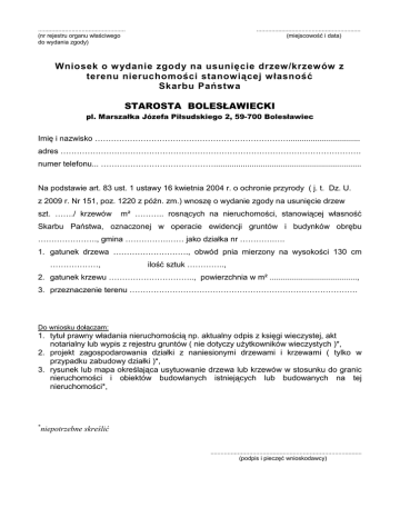 .................................................... (nr rejestru organu właściwego do wydania zgody) .............................................................. (miejscowość i data) Wniosek o w ydanie zgody na usunięcie drzew/krzewów z terenu nieruchomości stanowiącej własność Skarbu Państwa STAROSTA BOLESŁAWIECKI pl. Marszałka Józefa Piłsudskiego 2, 59-700 Bolesławiec Imię i nazwisko ………………………………………………………………................................ adres …………………………………………………………………………………………………. numer telefonu... …………………………………….................................................................. Na podstawie art. 83 ust. 1 ustawy 16 kwietnia 2004 r. o ochronie przyrody ( j. t. Dz. U. z 2009 r. Nr 151, poz. 1220 z późn. zm.) wnoszę o wydanie zgody na usunięcie drzew szt. ……./ krzewów m² ……….. rosnących na nieruchomości, stanowiącej własność Skarbu Państwa, oznaczonej w operacie ewidencji gruntów i budynków obrębu …………………., gmina …………….…… jako działka nr ………….…. 1. gatunek drzewa ………………………., obwód pnia mierzony na wysokości 130 cm ………………, ilość sztuk ………….., 2. gatunek krzewu ………………………….., powierzchnia w m² ......................................., 3. przeznaczenie terenu …………………………………………………………………………. Do wniosku dołączam: 1. tytuł prawny władania nieruchomością np. aktualny odpis z księgi wieczystej, akt notarialny lub wypis z rejestru gruntów ( nie dotyczy użytkowników wieczystych )*, 2. projekt zagospodarowania działki z naniesionymi drzewami i krzewami ( tylko w przypadku zabudowy działki )*, 3. rysunek lub mapa określająca usytuowanie drzewa lub krzewów w stosunku do granic nieruchomości i obiektów budowlanych istniejących lub budowanych na tej nieruchomości*, niepotrzebne skreślić * .......................................................................................... (podpis i pieczęć wnioskodawcy)