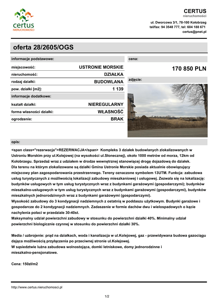 CERTUS nieruchomości ul. Dworcowa 3/1, 78-100 Kołobrzeg tel/fax: 94 3548 777, tel: 604 188 671 [email protected] oferta 28/2605/OGS informacje podstawowe: miejscowość: cena: USTRONIE MORSKIE nieruchomość: rodzaj działki: 170 850 PLN DZIAŁKA BUDOWLANA zdjęcie: 1 139 pow. działki [m2]: informacje dodatkowe: kształt działki: forma własności działki: NIEREGULARNY WŁASNOŚĆ BRAK ogrodzenie: opis: <span class="rezerwacja">REZERWACJA</span> Kompleks 3 działek budowlanych zlokalizowanych w Ustroniu Morskim przy ul.Kolejowej (na wysokości ul.Słonecznej), około 1000 metrów od morza, 12km od Kołobrzegu. Sprzedaż wraz z udziałem w drodze wewnętrznej stanowiącej drogę dojazdową do działek. Dla terenu na którym zlokalizowane są działki Gmina Ustronie Morskie posiada aktualnie obowiązujący miejscowy plan zagospodarowania przestrzennego. Tereny oznaczone symbolem 13UTM. Funkcja: zabudowa usług turystycznych z możliwością lokalizacji zabudowy mieszkaniowej i usługowej. Zezwala się na lokalizację: budynków usługowych w tym usług turystycznych wraz z budynkami garażowymi (gospodarczymi); budynków mieszkalno-usługowych w tym usług turystycznych wraz z budynkami garażowymi (gospodarczymi), budynków mieszkalnych jednorodzinnych wraz z budynkami garażowymi (gospodarczymi). Wysokość zabudowy do 3 kondygnacji nadziemnych z ostatnią w poddaszu użytkowym. Budynki garażowe i gospodarcze do 2 kondygnacji nadziemnych. Zadaszenie w formie dachów dwu i wielospadowych o kącie nachylenia połaci w przedziale 30-40st. Maksymalny udział powierzchni zabudowy w stosunku do powierzchni działki 40%. Minimalny udział powierzchni biologicznie czynnej w stosunku do powierzchni działki 30%. Media / uzbrojenie: prąd na działkach, woda i kanalizacja w ul.Kolejowej, gaz - przewidywana budowa gazociągu dająca możliwością przyłączenia po przeciwnej stronie ul.Kolejowej. W sąsiedztwie luźna zabudowa wolnostojąca, domki letniskowe, domy jednorodzinne i mieszkalno-pensjonatowe. Cena: 150zł/m2 http://www.certus.nieruchomosci.pl 1/2 CERTUS nieruchomości ul. Dworcowa 3/1, 78-100 Kołobrzeg tel/fax: 94 3548 777, tel: 604 188 671 [email protected] W sprzedaży znajdują się działki : Działka I - powierzchnia: 1139m2 CENA: 170.850zł <span class="rezerwacja">REZERWACJA</span> Działka J - powierzchnia: 1007m2 CENA: 151.050zł <span class="rezerwacja">REZERWACJA</span> Działka K - powierzchnia: 1011m2 CENA: 151.650zł <span class="rezerwacja">REZERWACJA</span> Proponujemy zapoznanie się również z ofertą 158/2605/OGS - działki w bezpośrednim sąsiedztwie o powierzchni od 897 do 1031m2 w cenie 150zł/m2. W celu uzyskania bardziej szczegółowych informacji o ofercie prosimy o kontakt telefoniczny, bądź mailowy. http://www.certus.nieruchomosci.pl 2/2