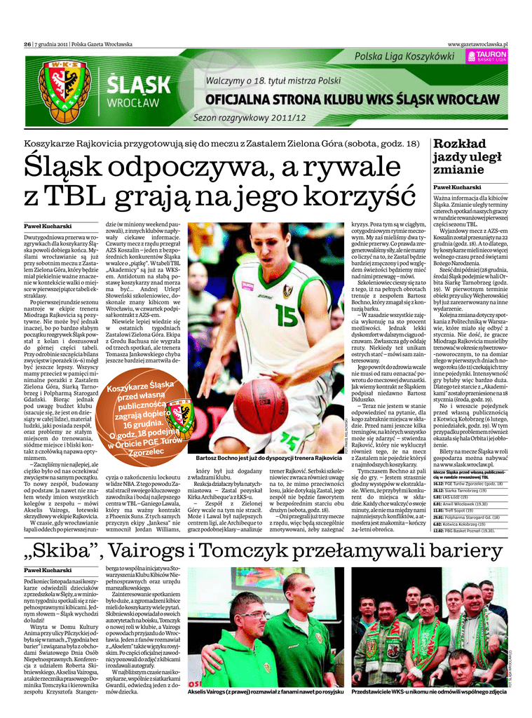 26 | 7 grudnia 2011 | Polska Gazeta Wrocławska www.gazetawroclawska.pl Sport Koszykarze Rajkovicia przygotowują się do meczu z Zastalem Zielona Góra (sobota, godz. 18) Śląsk odpoczywa, a rywale z TBL grają na jego korzyść Dwutygodniowa przerwa w rozgrywkach dla koszykarzy Śląska powoli dobiega końca. Myślami wrocławianie są już przy sobotnim meczu z Zastalem Zielona Góra, który będzie miał piekielnie ważne znaczenie w kontekście walki o miejsce w pierwszej piątce tabeli ekstraklasy. Po pierwszej rundzie sezonu nastroje w ekipie trenera Miodraga Rajkovicia są pozytywne. Nie może być jednak inaczej, bo po bardzo słabym początku rozgrywek Śląsk powstał z kolan i doszusował do górnej części tabeli. Przy odrobinie szczęścia bilans zwycięstw i porażek (6-6) mógł być jeszcze lepszy. Wszyscy mamy przecież w pamięci minimalne porażki z Zastalem Zielona Góra, Siarką Tarnobrzeg i Polpharmą Starogard Gdański. Biorąc jednak pod uwagę budżet klubu (szacuje się, że jest on dziesiąty w całej lidze), materiał ludzki, jaki posiada zespół, oraz problemy ze stałym miejscem do trenowania, siódme miejsce i bliski kontakt z czołówką napawa optymizmem. –Zaczęliśmynienajlepiej,ale ciężko było od nas oczekiwać zwycięstw na samym początku. To nowy zespół, budowany od podstaw. Ja nawet nie znałem wtedy imion wszystkich kolegów z zespołu – mówi Akselis Vairogs, łotewski skrzydłowy wekipie Rajkovicia. W czasie, gdy wrocławianie łapali oddech popierwszej run- dzie (w miniony weekend pauzowali),zinnychklubównapływały ciekawe informacje. Czwarty mecz z rzędu przegrał AZS Koszalin – jeden z bezpośrednich konkurentów Śląska wwalceo„piątkę”. WtabeliTBL „Akademicy” są już za WKSem. Antidotum na słabą postawę koszykarzy znad morza ma być... Andrej Urlep! Słoweński szkoleniowiec, doskonale znany kibicom we Wrocławiu, w czwartek podpisał kontrakt z AZS-em. Niewiele lepiej wiedzie się w ostatnich tygodniach Zastalowi Zielona Góra. Ekipa z Grodu Bachusa nie wygrała od trzech spotkań, ale trenera Tomasza Jankowskiego chyba jeszcze bardziej zmartwiła de- ląska Koszykarze Ś przed własną publicznoścą ro zagrają dopie . ia 16 grudn dejmą O godz. 18 po E Turów w Orbicie PG Zgorzelec cyzja o zakończeniu lockoutu wlidzeNBA.Z tegopowoduZastal stracił swojego kluczowego zawodnika i bodaj najlepszego centra w TBL – Ganiego Lawala, który ma ważny kontrakt z Phoenix Suns. Z tych samych przyczyn ekipy „Jankesa” nie wzmocnił Jordan Williams, FOT.PAWEŁRELIKOWSKI Paweł Kucharski Bartosz Bochno jest już do dyspozycji trenera Rajkovicia który był już dogadany z władzami klubu. Reakcjadziałaczybyłanatychmiastowa – Zastal pozyskał KirkaArchibeque’azŁKS-u. – Zespół z Zielonej Góry wcale na tym nie stracił. Może i Lawal był najlepszych centrem ligi, ale Archibeque to graczpodobnejklasy–analizuje trener Rajković. Serbski szkoleniowiec zwraca również uwagę na to, że mimo przeciwności losu, jakie dotykają Zastal, jego zespół nie będzie faworytem w bezpośrednim starciu obu drużyn (sobota, godz. 18). –Oniprzegralijużtrzymecze z rzędu, więc będą szczególnie zmotywowani, żeby zażegnać kryzys. Poza tym są w ciągłym, cotygodniowym rytmie meczowym. My zaś mieliśmy dwa tygodnie przerwy. Co prawda zregenerowaliśmysiły,aleniemamy co liczyć na to, że Zastal będzie bardziej zmęczony i pod względem świeżości będziemy mieć nadnimiprzewagę–mówi. Szkoleniowieccieszysięzato z tego, iż na pełnych obrotach trenuje z zespołem Bartosz Bochno, który zmagał się zkontuzją barku. – W zasadzie wszystkie zajęcia wykonuję na sto procent możliwości. Jednak lekki dyskomfortwdalszymciąguodczuwam. Zwłaszcza gdy oddaję rzuty. Niekiedy też unikam ostrych starć – mówi sam zainteresowany. Jegopowrótdozdrowiawcale nie musi od razu oznaczać powrotu do meczowej dwunastki. Jak wiemy kontrakt ze Śląskiem podpisał niedawno Bartosz Diduszko. – Teraz nie jestem w stanie odpowiedzieć na pytanie, dla kogo zabraknie miejsca w składzie. Przed nami jeszcze kilka treningów,naktórychwszystko może się zdarzyć – stwierdza Rajković, który nie wykluczył również tego, że na mecz z Zastalem nie pojedzie któryś z najmłodszych koszykarzy. Tymczasem Bochno aż pali się do gry. – Jestem strasznie głodny występów w ekstraklasie.Wiem,żeprzybyłmikonkurent do miejsca w składzie.Każdychcewalczyćoswoje minuty,aleniemamiędzynami najmniejszych konfliktów, a atmosferajestznakomita–kończy 24-letni obrońca. Rozkład jazdy uległ zmianie Paweł Kucharski Ważna informacja dla kibiców Śląska. Zmianie uległy terminy czterechspotkańnaszychgraczy wrundzierewanżowejpierwszej części sezonu TBL. Wyjazdowy mecz z AZS-em Koszalinzostałprzesuniętyna22 grudnia (godz. 18). A to dlatego, bykoszykarzemieliniecowięcej wolnego czasu przed świętami BożegoNarodzenia. Sześćdnipóźniej(28grudnia, środa)ŚląskpodejmiewhaliOrbita Siarkę Tarnobrzeg (godz. 19). W pierwotnym terminie obiektprzyulicyWejherowskiej był już zarezerwowany na inne wydarzenie. Kolejnazmianadotyczyspotkania z Politechniką w Warszawie, które miało się odbyć 2 stycznia. Nie dość, że gracze Miodraga Rajkovicia musieliby trenowaćwokresiesylwetrowo-noworocznym, to na domiar złego w pierwszych dniach nowegoroku(do11)czekająichtrzy inne pojedynki. Intensywność gry byłaby więc bardzo duża. Dlatego też starcie z „Akademikami”zostałoprzeniesionena18 stycznia (środa, godz. 19). No i wreszcie pojedynek przed własną publicznością z Kotwicą Kołobrzeg (6 lutego, poniedziałek, godz. 19). W tym przypadkuproblememrównież okazałasięhalaOrbitaijejobłożenie. Bilety na mecze Śląska w roli gospodarza można nabywać na www.slask.wroclaw.pl. Mecze Śląska przed własną publicznością w rundzie rewanżowej TBL 16.12: PGE Turów Zgorzelec (godz. 18) 28.12: Siarka Tarno