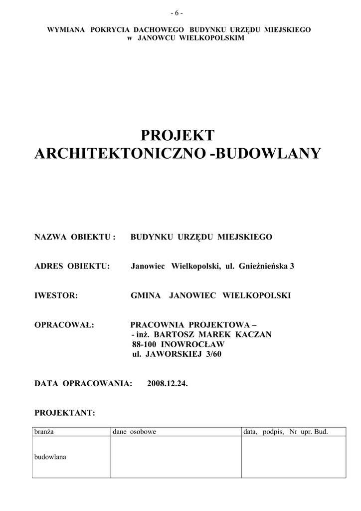 -6WYMIANA POKRYCIA DACHOWEGO BUDYNKU URZĘDU MIEJSKIEGO w JANOWCU WIELKOPOLSKIM PROJEKT ARCHITEKTONICZNO -BUDOWLANY NAZWA OBIEKTU : BUDYNKU URZĘDU MIEJSKIEGO ADRES OBIEKTU: Janowiec Wielkopolski, ul. Gnieźnieńska 3 IWESTOR: GMINA JANOWIEC WIELKOPOLSKI OPRACOWAŁ: PRACOWNIA PROJEKTOWA – - inŜ. BARTOSZ MAREK KACZAN 88-100 INOWROCŁAW ul. JAWORSKIEJ 3/60 DATA OPRACOWANIA: 2008.12.24. PROJEKTANT: branŜa budowlana dane osobowe data, podpis, Nr upr. Bud. - 7- 1.1. PRZEZNACZENIE OBIEKTU Projekt budowlany zakłada przeznaczenie budynku do dalszego pełnienia dotychczasowej funkcji. Projektowana wymiana pokrycia dachowego odbywać się będzie w trakcie uŜytkowania obiektu. Projektowana wymiana pokrycia dachu nie zmieni Ŝadnego parametru geometrycznego ani uŜytkowego budynku. 1.2. FUNKCJA OBIEKTU Budynek Urzędu Miejskiego w Janowcu Wielkopolskim ma funkcję administracji publicznej. Kategoria obiektu XII. Funkcja budynku po wykonaniu remontu nie ulegnie zmianie. 1.3. FORMA ARCHITEKTONICZNA Budynek Urzędu Miejskiego w Janowcu Wielkopolskim ma złozoną formę architektoniczną. Obiekt na kształt kilku przylegających prostopadłościanów o podstawie prostokąta z dachami spadzistymi stromymi. Forma architektoniczna po projektowanym remoncie nie ulegnie zmianie. 1.4. WYTYCZNE REALIZACJI I KOLEJNOŚĆ ROBÓT PoniewaŜ w trakcie wymiany pokrycia dachu budynek będzie uŜytkowany wykonawca musi wykonywać roboty zachowując: - bezpieczeństwo przechodniów - bezpieczeństwo uŜytkowników - bezpieczeństwo pracowników wykonujących wymianę dachu - bezpieczeństwo konstrukcji budynku - bezpieczeństwo poŜarowe - ochronę budynku przed zalaniem wodami deszczowymi w trakcie prowadzonych robót Bezpieczeństwo przechodniów naleŜy zapewnić przez wykonanie rusztowań i zamontowaniu na nim siatki ochronnej PE lub PP. Rusztowania z siatką naleŜy wykonać dla całej jednej elewacji lub uzasadnionego odcinka elewacji na czas od momentu demontaŜu dachówek do momentu zakończenia i odbioru odcinka połaci. W trakcie montaŜu i demontaŜu rusztowań naleŜy skutecznie skierować ruch pieszy na drugi chodnik, lub wstrzymywać roboty montaŜowe w trakcie przechodzenia przechodniów. Całość odcinka rusztowania łącznie z siatkami ochronnymi i tablicami ostrzegawczymi naleŜy wykonać w ciągu jednego dnia. W przypadku niemoŜliwości zakończenia montaŜu rusztowania do fajrantu, lub przerw w montaŜu (np. przerwy na śniadanie) zalecam skuteczne stróŜowanie terenu wokół rusztowania. Siatka ochronna rusztowania musi dołem dolegać do płytek chodnika i być skutecznie obciąŜona lub zakotwiona w chodniku. Wejścia na rusztowanie musi być skutecznie uniemoŜliwione dla osób trzecich na całą dobę. Na czas przerw w robotach ( np. nocnych ) naleŜy wywiesić tablice „Roboty na wysokości” na siatce ochronnej w odległościach maximum co 20 m. Bezpieczeństwo uŜytkowników budynku naleŜy zapewnić jak przechodniom, z tą róŜnicą, Ŝe ponadto naleŜy ukierunkować ruch pieszych do budynku przez drzwi w tych elewacjach gdzie nie trwają roboty. Taki ruch pieszych kierownik robót uzgodnić musi z uŜytkownikiem. Dopuszcza się inne rozwiązania, po uzyskaniu pisemnej zgody projektanta jednakŜe pod warunkiem, Ŝe nie zmieni się wartość umowna robót. -8- Bezpieczeństwo pracowników wykonujących wymianę dachu naleŜy zapewnić przez prawidłowość wykonania rusztowań zewnętrznych, oraz wykonywanie robót demontaŜowych od wewnątrz. Ponadto naleŜy pracowników wyposaŜyć w sprzęt ochronny – kaski i szelki. Pasy nadrynnowe, obróbki blacharskie ogniomurów i wymianę parapetów zewnętrznych naleŜy wykonywać z rusztowań zewnętrznych. Rozbiórkę i odtworzenie kominów, demontaŜ dachówek, obróbek blacharskich i łat naleŜy wykonywać z rusztowań wewnętrznych np. warszawskich. Bezpieczeństwo konstrukcji w trakcie demontaŜu dachu naleŜy zachować przez dokonywanie rozbiórki połaci pojedynczymi dachówkami, a rozbiórki kominów pojedynczymi cegłami. Zabrania się takŜe składowania materiałów z rozbiórki w ilości grubszej niŜ 1 warstwa dachówki, lub 1 warstwa cegieł na płask ( wozówką ) na poddaszu. Bezpieczeństwo konstrukcji w trakcie montaŜu naleŜy zachować przez odpowiedni transport pionowy materiałów tj. taki, Ŝe suma cięŜaru złoŜonego materiału, sprzętu, rusztowań i ludzi w dowolnym miejscu nie przekroczy 120 kG/m² ( 1,2 kPa ). Bezpieczeństwo konstrukcji naleŜy zachować takŜe podejmując decyzję o rodzaju rusztowań do wymiany rynien kopuły dachu wieŜy. Projektuje się wykonanie tych robót z podnośnika koszowego, jednakŜe w przypadku gdy kierownik budowy zadecyduje o wykonaniu tych robót z rusztowania sposób jego budowy naleŜy uzgodnić z projektantem. Bezpieczeństwo poŜarowe naleŜy zapewnić przez zakaz uŜywania otwartego ognia na całym poddaszu, oraz zakaz palenia papierosów w całym obrębie robót. Ochronę budynku przed zalaniem wodami deszczowymi w trakcie prowadzonych robót naleŜy zapewnić przez okrywanie na czas opadów otwartych połaci dachu. W tym celu naleŜy przewidzieć zakup dodatkowej folii PE gr. 0,6 mm szerokości: dwa pasy po 4 m i długości od jednego okapu poprzez kalenicę do drugiego okapu. UWAGA 1: Długość pasa folii po obu stronach kalenicy musi być jednakowa niezaleŜnie od wielkości otwarcia połaci dachowych. UWAGA 2: Powierzchnia otwarcia połaci dachowych nie moŜe przekraczać powierzchni folii ochronnej. Kolejność wykonywania robót pozostawia się kierownikowi robót. 1.5. ROZWIĄZANIA KONSTRUKCYJNO - MATERIAŁOWE Wymianie podlegają: wszystkie dachówki, wszystkie obróbki blacharskie kominów i ogniomurów, wszystkie rynny łącznie z rynną pod kopułą dachu wieŜy, wszystkie rury spustowe, wszystkie rynhaki i uchwyty rur spustowych, wszystkie łaty, jedna wskazana belka koszowa, okna połaciowe, wszystkie parapety zewnętrzne. Rozbiórce podlegają dwa ko