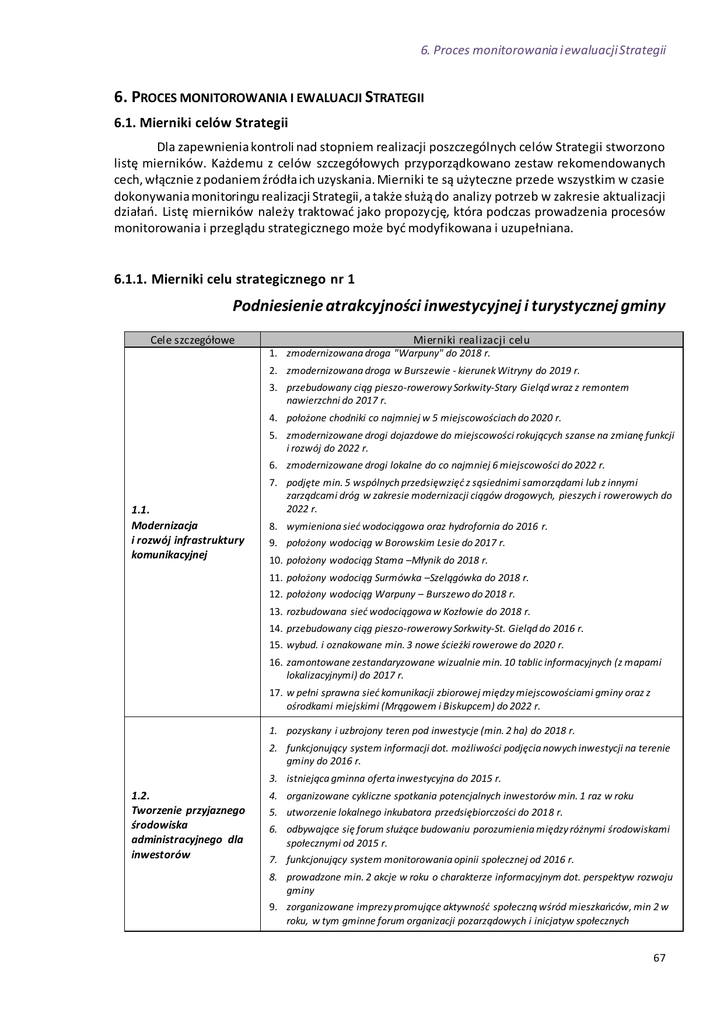 6. Proces monitorowania i ewaluacji Strategii 6. PROCES MONITOROWANIA I EWALUACJI STRATEGII 6.1. Mierniki celów Strategii Dla zapewnienia kontroli nad stopniem realizacji poszczególnych celów Strategii stworzono listę mierników. Każdemu z celów szczegółowych przyporządkowano zestaw rekomendowanych cech, włącznie z podaniem źródła ich uzyskania. Mierniki te są użyteczne przede wszystkim w czasie dokonywania monitoringu realizacji Strategii, a także służą do analizy potrzeb w zakresie aktualizacji działań. Listę mierników należy traktować jako propozycję, która podczas prowadzenia procesów monitorowania i przeglądu strategicznego może być modyfikowana i uzupełniana. 6.1.1. Mierniki celu strategicznego nr 1 Podniesienie atrakcyjności inwestycyjnej i turystycznej gminy Cele szczegółowe Mierniki realizacji celu 1. zmodernizowana droga "Warpuny" do 2018 r. 2. zmodernizowana droga w Burszewie - kierunek Witryny do 2019 r. 3. przebudowany ciąg pieszo-rowerowy Sorkwity-Stary Gieląd wraz z remontem nawierzchni do 2017 r. 4. położone chodniki co najmniej w 5 miejscowościach do 2020 r. 5. zmodernizowane drogi dojazdowe do miejscowości rokujących szanse na zmianę funkcji i rozwój do 2022 r. 6. zmodernizowane drogi lokalne do co najmniej 6 miejscowości do 2022 r. 1.1. Modernizacja i rozwój infrastruktury komunikacyjnej 7. podjęte min. 5 wspólnych przedsięwzięć z sąsiednimi samorządami lub z innymi zarządcami dróg w zakresie modernizacji ciągów drogowych, pieszych i rowerowych do 2022 r. 8. wymieniona sieć wodociągowa oraz hydrofornia do 2016 r. 9. położony wodociąg w Borowskim Lesie do 2017 r. 10. położony wodociąg Stama –Młynik do 2018 r. 11. położony wodociąg Surmówka –Szelągówka do 2018 r. 12. położony wodociąg Warpuny – Burszewo do 2018 r. 13. rozbudowana sieć wodociągowa w Kozłowie do 2018 r. 14. przebudowany ciąg pieszo-rowerowy Sorkwity-St. Gieląd do 2016 r. 15. wybud. i oznakowane min. 3 nowe ścieżki rowerowe do 2020 r. 16. zamontowane zestandaryzowane wizualnie min. 10 tablic informacyjnych (z mapami lokalizacyjnymi) do 2017 r. 17. w pełni sprawna sieć komunikacji zbiorowej między miejscowościami gminy oraz z ośrodkami miejskimi (Mrągowem i Biskupcem) do 2022 r. 1. pozyskany i uzbrojony teren pod inwestycje (min. 2 ha) do 2018 r. 2. funkcjonujący system informacji dot. możliwości podjęcia nowych inwestycji na terenie gminy do 2016 r. 3. istniejąca gminna oferta inwestycyjna do 2015 r. 1.2. Tworzenie przyjaznego środowiska administracyjnego dla inwestorów 4. organizowane cykliczne spotkania potencjalnych inwestorów min. 1 raz w roku 5. utworzenie lokalnego inkubatora przedsiębiorczości do 2018 r. 6. odbywające się forum służące budowaniu porozumienia między różnymi środowiskami społecznymi od 2015 r. 7. funkcjonujący system monitorowania opinii społecznej od 2016 r. 8. prowadzone min. 2 akcje w roku o charakterze informacyjnym dot. perspektyw rozwoju gminy 9. zorganizowane imprezy promujące aktywność społeczną wśród mieszkańców, min 2 w roku, w tym gminne forum organizacji pozarządowych i inicjatyw społecznych 67 6. Proces monitorowania i ewaluacji Strategii 1. wybudowana świetlica w Rybnie do 2017 r. 2. wybudowana świetlica w Sorkwitach do 2019 r. 1.3. Inicjowanie i wspieranie przedsięwzięć związanych z rozwojem infrastruktury społecznej 3. wybudowane inne obiekty użyteczności publicznej –w zależności od potrzeb mieszkańców, inicjatyw społecznych i organizacji pozarządowych 4. wspierane lokalne inicjatywy dotyczące urządzania przestrzeniu i zagospodarowania terenów publicznych (np. plaże, siłownie, place zabaw, wiaty itp.) – działanie ciągłe 5. wspierane inicjatywy i przedsięwzięcia dotyczące organizowania się społeczności lokalnych – działanie ciągłe 6. wybud. min. 8 pomostów w różnych miejscowościach do 2016 r. 7. opracowane studium turystycznego zagospod. szlaku Krutyni – do 2016 r. 8. zrealizowana koncepcja „organizacji Eko-szlaku Krutyni” do 2015 r. 9. oznakowane min. 10 miejsc historycznej granicy Mazur do 2016 r . 10. utworzenie lokalnego muzeum, regionalnych izb pamięci / izb muzealnych - min. 2 obiekty do 2018 r. 6.1.2. Mierniki celu strategicznego nr 2 Ochrona środowiska naturalnego z zachowaniem ważnych jego funkcji społeczno-gospodarczych Cele operacyjne Mierniki realizacji celu 1. poddane termomodernizacji budynków Zesp. Szkół w Zyndakach, Ośrodka Zdrowia w Sorkwitach i Warpunach, Remizy Strażackiej w Gizewie i Rybnie do 2020 r. 2. przedsięwzięcia propagujące termomodernizację budynków mieszkalnych - działanie ciągłe 2.1. Wspieranie inwestycji proekologicznych i przyjaznych środowisku 3. wyposażenie min. 15% gospodarstw domowych w systemy solarne, zainstalowanie we wszystkich obiektach publ. ogrzewania na biomasę do 2022 r. 4. powstanie min. 10 inicjatyw związanych z produkcją lub wykorzystaniem energii ze źródeł odnawialnych o min. mocy 100 W do 2022 r. 5. funkcjonujący program na rzecz wzrostu udziału energii wytwarzanej z OZE do 2016 r. 6. podjęte min. raz do roku inicjatywy na rzecz podnoszenia świadomości ekologicznej od 2015 r. 7. funkcjonująca kanalizacja sanitarna w Maradkach, Pustnikach i Borowe do 2018 r. 8. zmodernizowana oczyszczalnia ścieków do 2019 r. 9. usprawniony system segregacji i usuwania odpadów komunalnych funkcjonujący od 2017 r. uruchomione min. 50 przydomowych oczyszczalni ścieków do 2022 r. 1. podniesiony stan świadomości społecznej mieszkańców - działanie ciągłe 2. podjęte min. 5 różnych inicjatyw na rzecz estetyzacji obejść oraz budowy nowych budynków i budowli nawiązujących do istniejącej architektury od 2015 r. 2.2. Dbałość o zachowanie ładu przestrzennego na terenie gminy 3. zagospodarowane i zrewitalizowane min. 6 miejsc o szczególnych walorach do 2020 r. 4. funkcjonujące min. 2 wsie tematyczne, min. 1 obiekt edukac