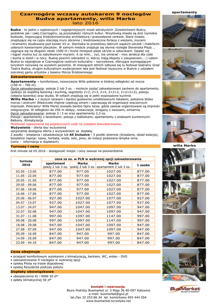 Czarnogóra wczasy autokarem 9 noclegów Budva apartamenty, willa Marko lato 2016 apartamenty Budva - to jedno z najstarszych i najpiękniejszych miast adriatyckich .Dziedzictwem Budvy, podobnie jak i całej Czarnogóry, są pozostałości różnych kultur. Wizytówką miasta są dziś rzymskie budowle, imponująca śródziemnomorska architektura i prawosławne cerkwie. Stare miasto. znajdujące się na cyplu otaczają mury obronne ( średniowieczna forteca z wieżami, murami i bramami) zbudowane pod koniec XV w. Starówka to prawdziwy labirynt wąskich uliczek i maleńkich usłanych kawiarniami placyków. W samym mieście znajduje się słynna rozległa Slovenska Plaża. , ciągnąca się na długości około 1500 m i liczne mniejsze plaże ukryte w zatoczkach. Opalać się i kąpać można tuż za zabytkowymi murami. A za nimi... żyć, nie umierać - moc atrakcji dla ciała i ducha w dzień i w nocy. Budvę powinni odwiedzić ci, którzy mają kłopoty z zasypianiem...:) Latem Budva to największe w Czarnogórze centrum kulturalno - rozrywkowe, oferujące wymagającym turystom rozrywkę na wysokim poziomie. W miesiącach letnich odbywa się tu festiwal teatralny Grad Teatra Budva, drugim kulturalnym wydarzeniem lata jest festiwal muzyczny w Budvie z udziałem szerokiej gamy artystów z basenu Morza Śródziemnego Zakwaterowanie Apartamenty - komfortowe, nowoczesne Wille położone w bliskiej odległości od morza (150 m - 700 m). Opcje zakwaterowania: pokoje 2 lub 3 os. - możecie zostać zakwaterowani zarówno do apartamentu (pokoju ze wspólną łazienką i kuchnią, segmenty 2+2, 2+3, 2+4, 2+2+2, 2+2+2+2), pokoju (własna łazienka) oraz studia. W willach znajdują się w pełni wyposażone kuchnie. Willa Marko - z dużym tarasem i bardzo gustownie umeblowanymi lokalami, położona blisko morza i centrum! Właściciele chętnie częstują winem i zapraszają do organizacji wieczornych imprezek. Polecamy! Willa Marko posiada bardzo fajny taras, gdzie zawsze organizowane są imprezki integracyjne. W odległości do 250 m sklepy, restauracje, stragany z owocami, winiarnia. Opcje zakwaterowania: pokoje 2 i 3 os oraz apartamenty 2,3 os. Pokoje i apartamenty z łazienkami; pokoje z lodówkami, apartamenty z aneksami kuchennymi. Balkony. Klimatyzacja Możliwość zapisywania się pojedynczych osób na zasadzie dokwaterowania. Wyżywienie - oferta bez wyżywienia opcjonalnie dostępna oferta z wyżywieniem za dopłatą: 2 posiłki - śniadania i obiadokolacje lub All Inclusive - 3 posiłki dziennie (śniadanie, obiad kolacja), bezpłatne napoje: kawa, herbata, woda, soki, piwo, do kolacji podawana lampka wina. (ceny - informacja w dopłatach) willa Marko Turnusy i ceny first minute od III.2016 - dostępność miejsc i ceny zawsze na potwierdzenie turnusy 2016 cena za os. w PLN w wybranej opcji zakwaterowania apartament Marko Marko pokój 2 lub 3 os. pokój 2 lub 3 os. apartament 2 lub 3 os. 1 osoba 02.05 - 13.05 877.00 977.00 1027.00 877.00 11.05 - 22.05 877.00 977.00 1027.00 877.00 20.05 - 31.05 877.00 977.00 1027.00 877.00 29.05 - 09.06 877.00 977.00 1027.00 877.00 07.06 - 18.06 877.00 977.00 1027.00 877.00 16.06 - 17.06 877.00 977.00 1027.00 877.00 25.06 - 06.07 927.00 1027.00 1077.00 927.00 04.07 - 15.07 927.00 1027.00 1077.00 927.00 13.07 - 24.07 947.00 1047.00 1097.00 947.00 22.07 - 02.08 947.00 1047.00 1097.00 947.00 31.07 - 11.08 997.00 1097.00 1147.00 997.00 09.08 - 20.08 997.00 1097.00 1147.00 997.00 18.08 - 29.08 947.00 1047.00 1097.00 947.00 27.08 - 07.09 947.00 1047.00 1097.00 947.00 05.09 - 16.09 847.00 947.00 997.00 847.00 14.09 - 25.09 847.00 947.00 997.00 847.00 23.09 - 04.10 847.00 947.00 997.00 847.00 a Cena obejmuje • • • • przejazd komfortowym autokarem z klimatyzacją, barkiem, WC, wideo - DVD zakwaterowanie 9 noclegów w wybranej opcji opiekę Pilota na trasie dojazdowej opiekę Rezydenta podczas pobytu Dopłaty obowiązkowe • ubezpieczenia KL i NNW 50 zł* • opłaty klimatycznej 50 zł* kontakt i rezerwacja: Biuro Podróży Busmarket ul. 3 Maja 36 40-097 Katowice e-mail: [email protected] tel./fax 32 253 86 34 tel. komórkowy 693 444 554 www.busmarket.turystyka.net *Kwoty zostaną doliczone do ceny na umowie Dopłaty, zniżki dopłaty opcjonalne: • oferta z wyżywieniem: 2 posiłki +450 PLN/os. w zależności od turnusu All inclusive +550 PLN/os. w zależności od turnusu zniżki: • grupy powyżej 6os. -5% ZNIŻKI • dzieci od 3-12 roku życia –przy dojeździe autokarem zniżka 30% • dzieci do 4 roku życia – możliwość zapisywania TYLKO w opcji dojazdu własnego • dzieci do lat 3 lat są zwolnione z opłat (dojazd własny bez świadczeń hotelowych miejsce sypialne z rodzicami) • dojazd własny – 150 zł od osoby • Przedłużenie pobytu o kolejny turnus: Suma dwóch terminów minus 200 zł (przy opcji z dojazdem autokarem) Suma dwóch terminów minus 50 zł (przy opcji z dojazdem własnym) Możliwość wykupienia samego przejazdu w 2 strony 500 PLN/os. Program ramowy 1 dzień: Wyjazd z Polski zgodnie z rozkładem jazdy autobusów 2 dzień: Przyjazd do Czarnogóry zakwaterowanie. 3-10 dzień: Pobyt - możliwość korzystania z wycieczek lokalnych. 11 dzień: Wykwaterowanie w godzinach rannych, czas wolny, wyjazd do Polski zgonie z rozkładem jazdy. 12 dzień: Przyjazd do Polski zgodnie z rozkładem jazdy autobusów. Informacje transportowe miasta wyjazdu, ew. dopłata Białystok Parking przy kościele Farnym, Parking przy kościele Farnym, +100,00 zł, godz. 00:30 Bielsko Biała McDonald's przy S1, Strumieńska 4, 43-385 Jasienica, godz. 15:00 Bydgoszcz, Hala Łuczniczka, ul. Toruńska 59, +80,00 zł, godz. 01:30 Cieszyn, Stacja BP przy S1, Gumna 124, Dębowiec, godz. 16:00 Częstochowa, Stacja BP, ul. Wojska Polskiego 263, godz. 11:30 Gdańsk, Dworzec PKP, Dworzec PKP parking dla autobusów turystycz., +100,00 zł, godz. 00:30 Gdynia, Dworzec PKS, dworzec PKS, +100,00 zł, godz. 00:05 Gliwice, Stacja Shell, ul. Rybnicka 159, godz. 1